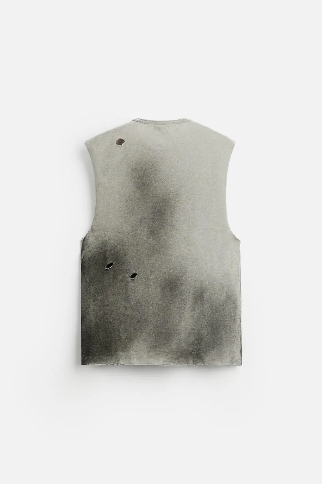 Camiseta de punto tejida en hilatura de algodón. Cuello redondo y manga sisa. Aplicación frontal de parche combinado a contraste. Lavado efecto rotos.