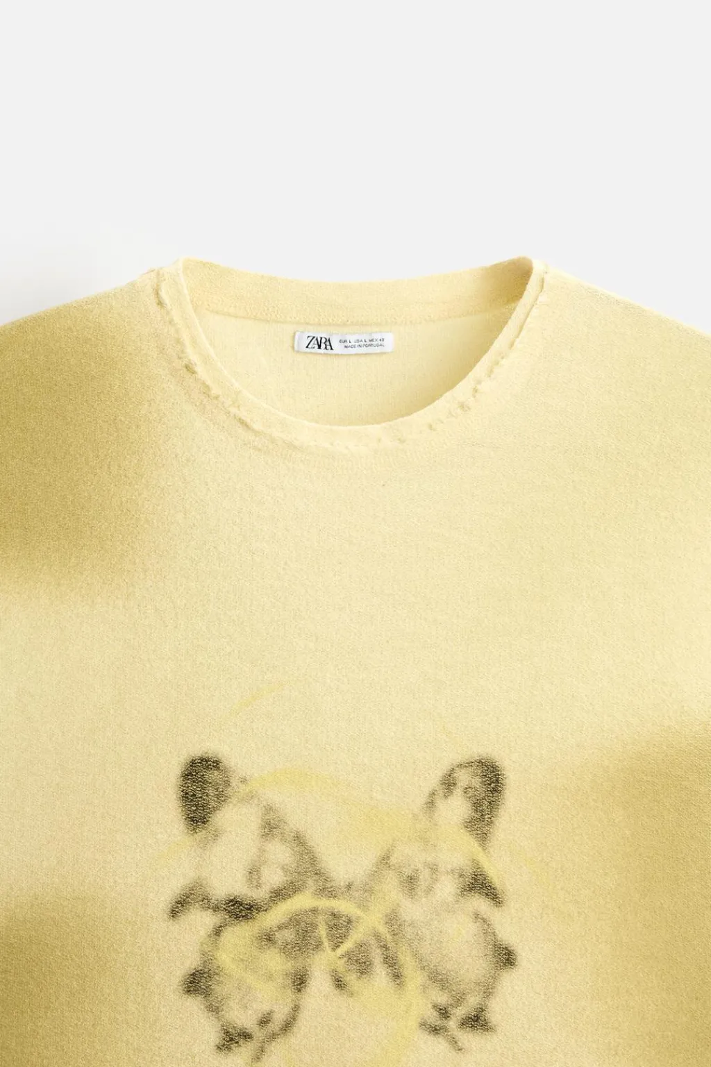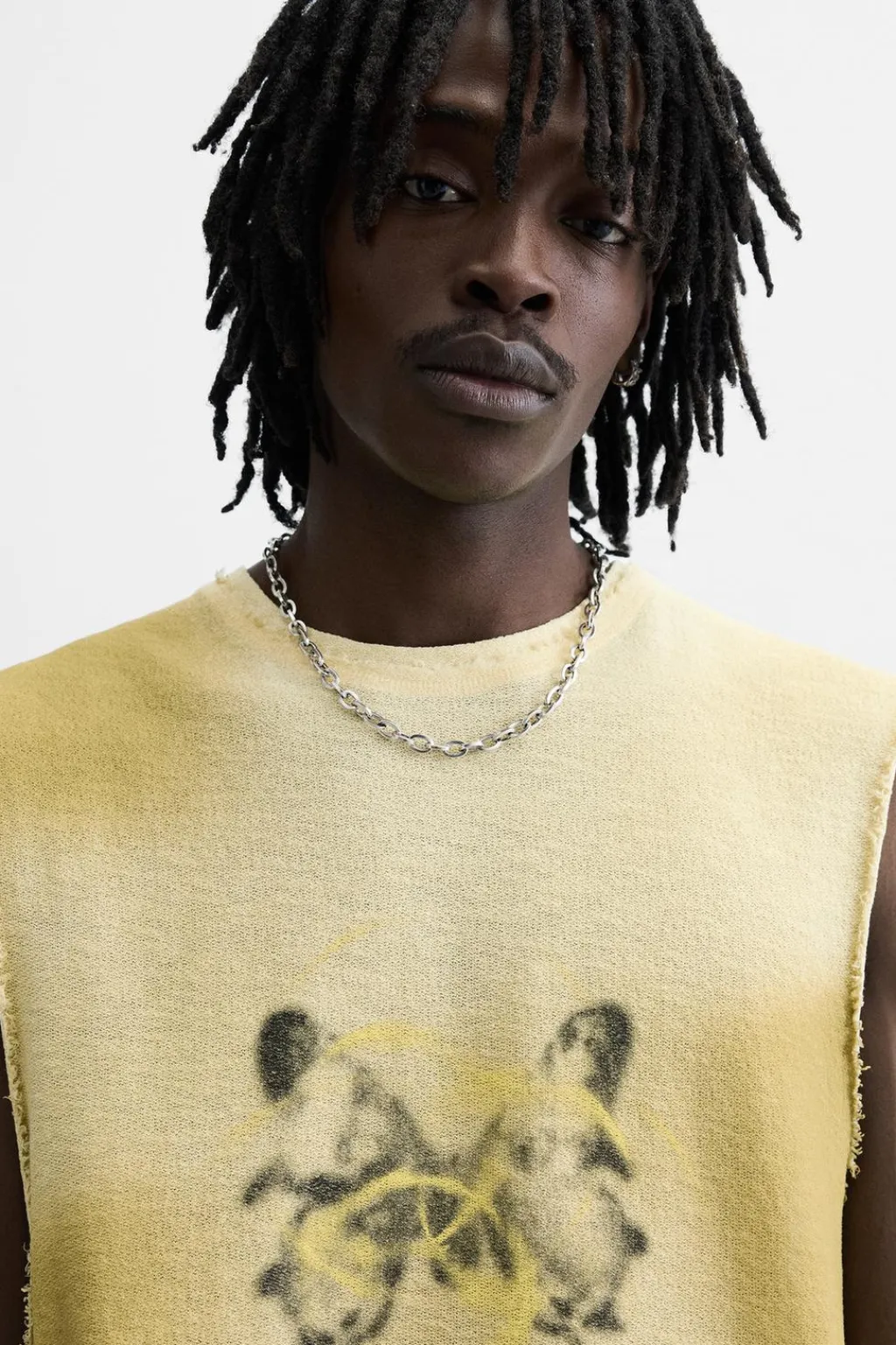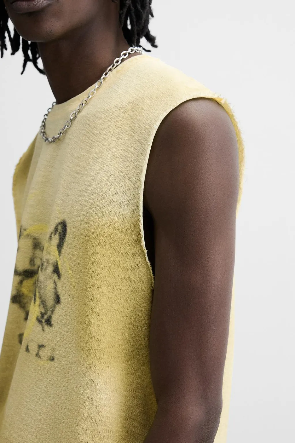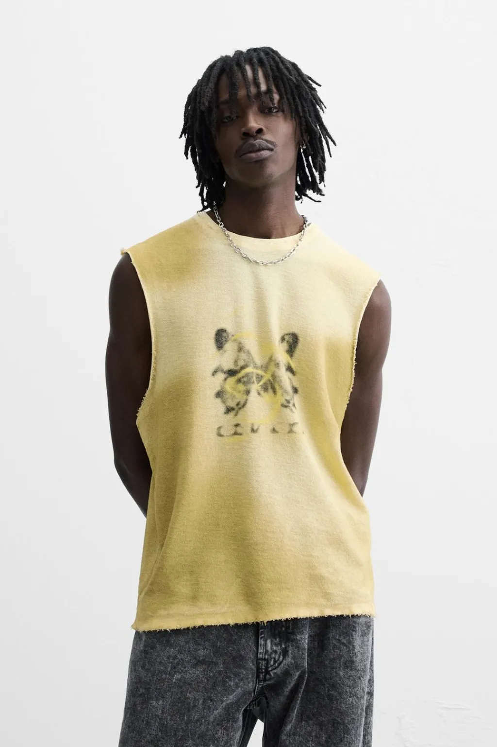 Camiseta de punto slim fittejida en hilatura de algodón. Cuello redondo y manga sisa. Estampación frontal combinada a contraste. Acabados irregulares.