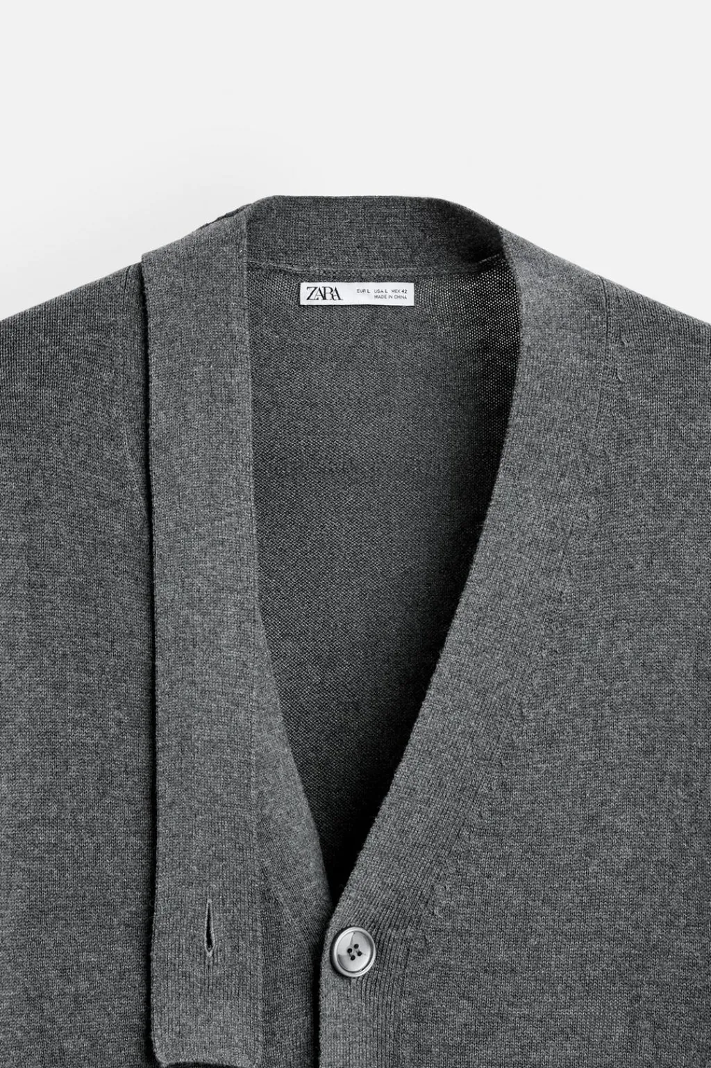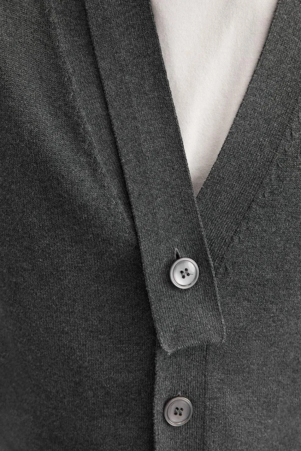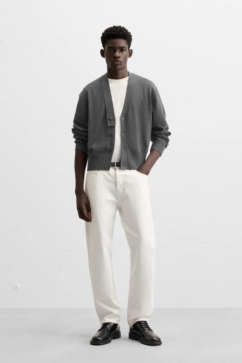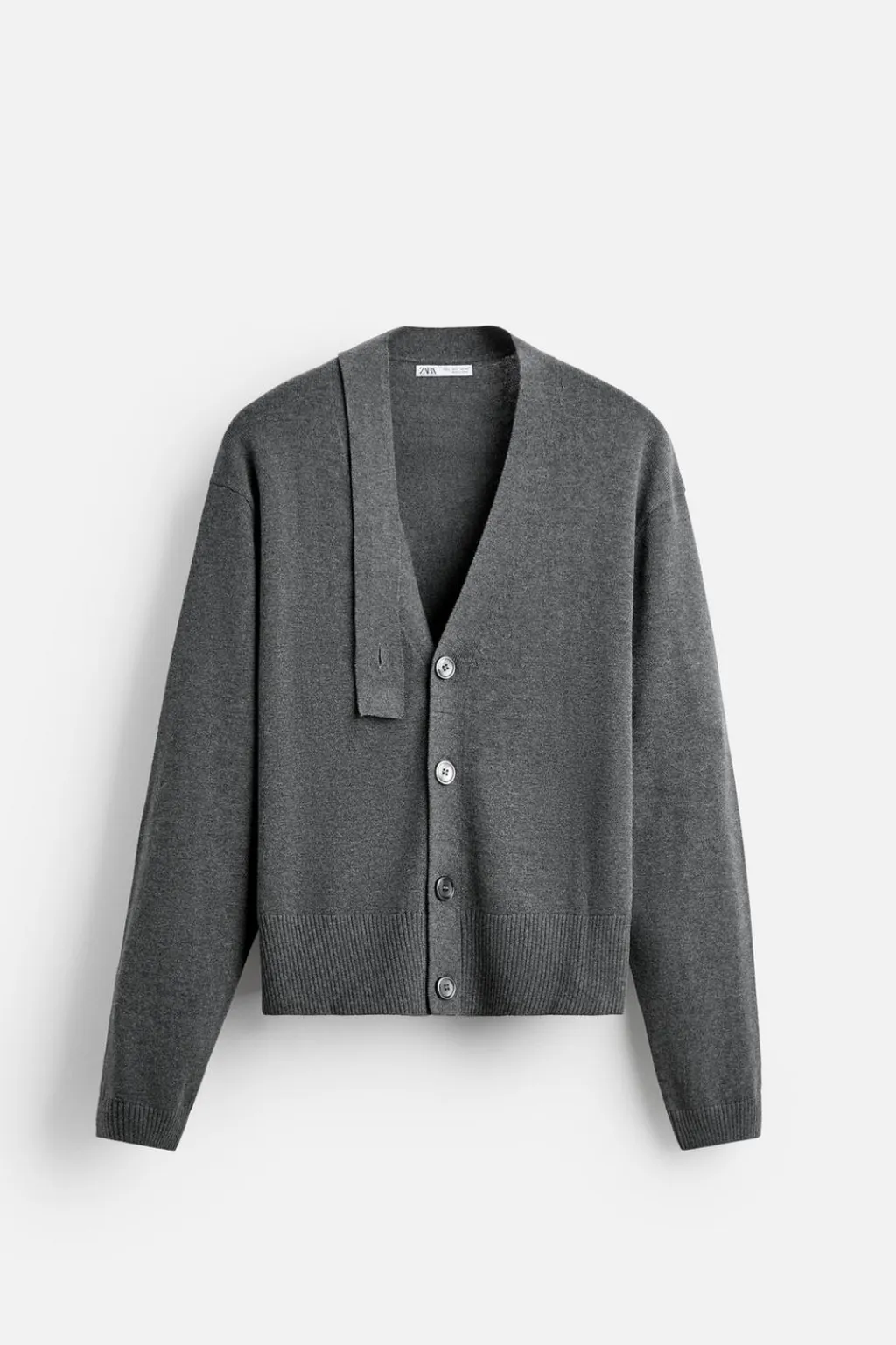 Cárdigan boxy fit tejido en hilatura con algodón. Cuello pico asimétrico con detalle de tira. Manga larga. Acabados en rib. Cierre frontal de botonadura.