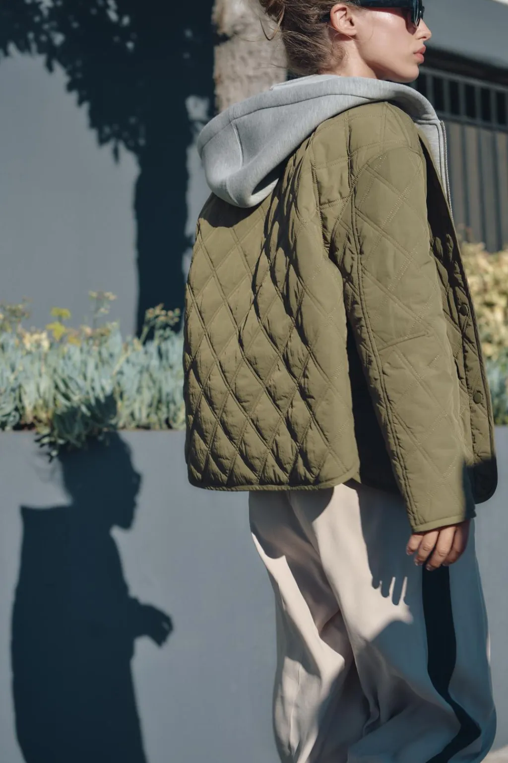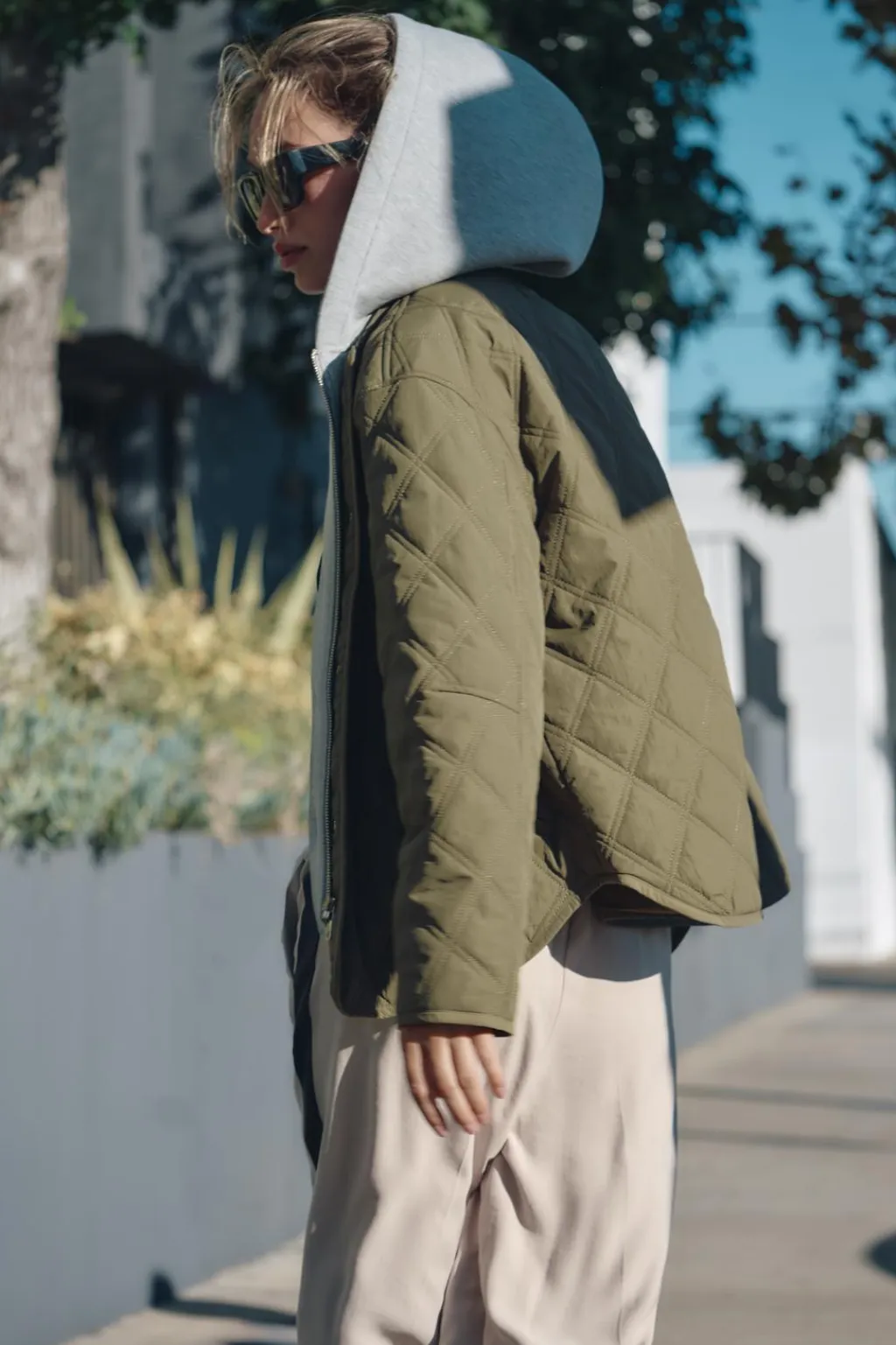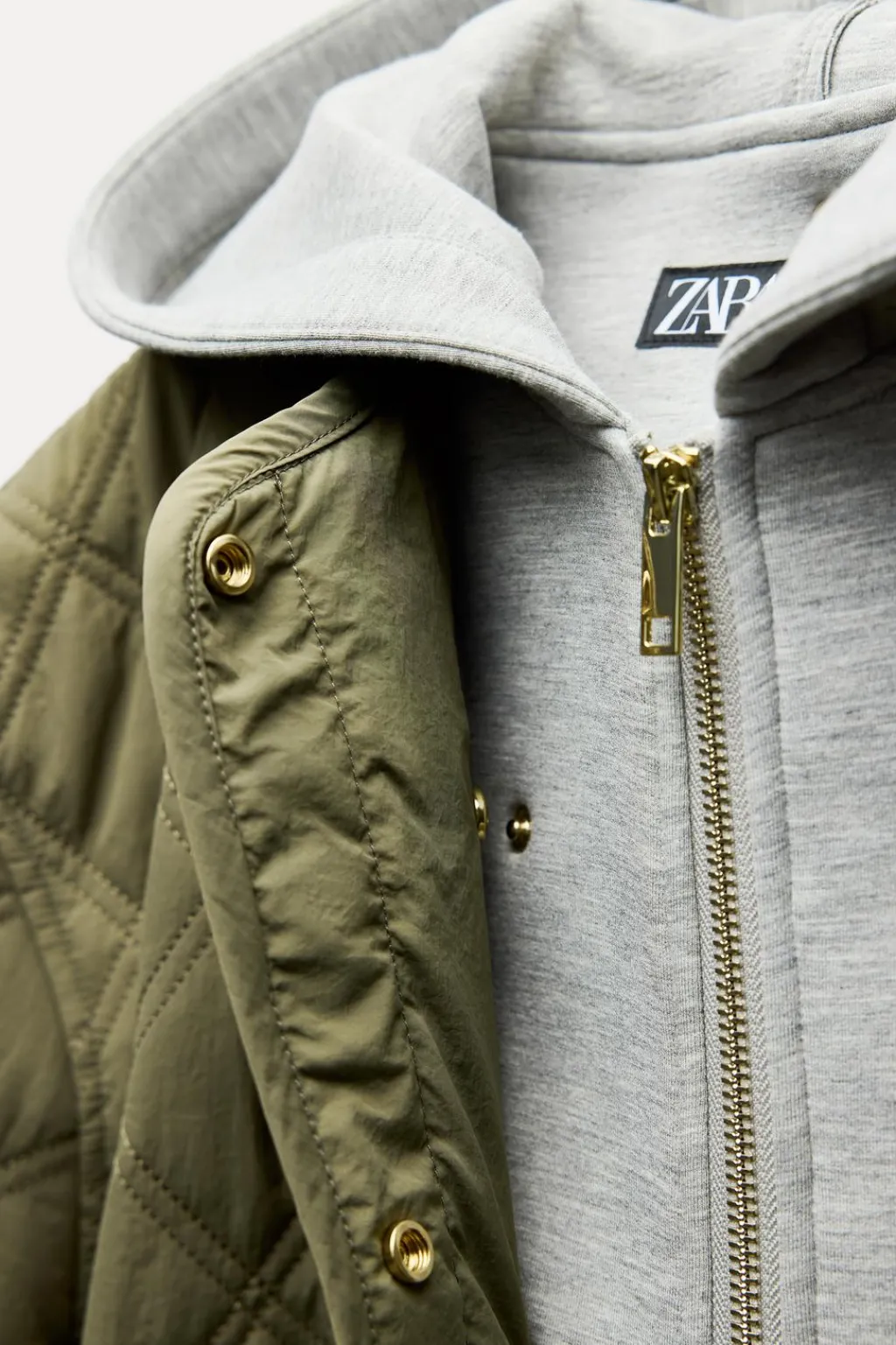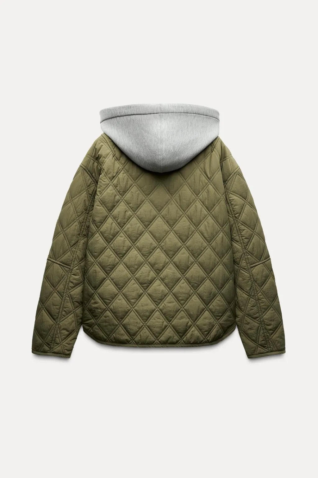 Cazadora acolchada water repellent. Cuello redondo y manga larga. Capucha combinada a contraste desmontable con botones a presión. Bolsillos de vivo en delantero. Cierre frontal con botones a presión.