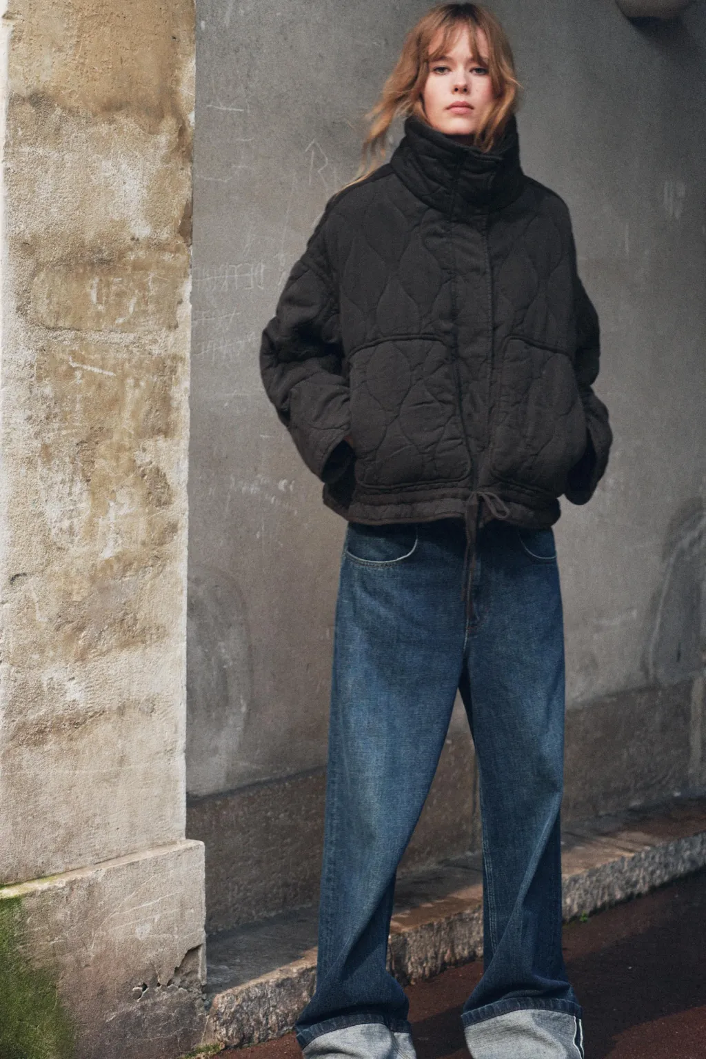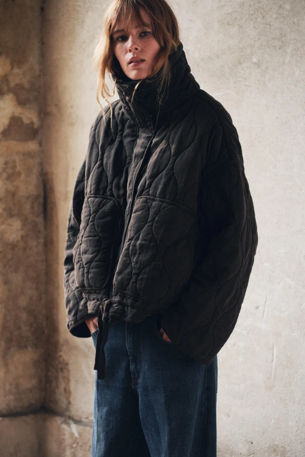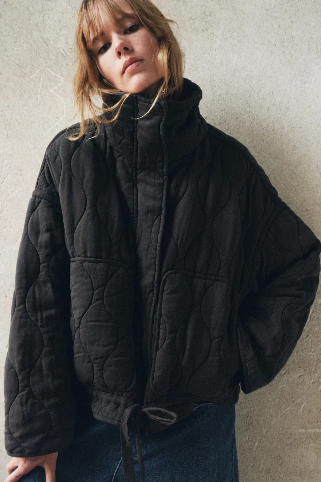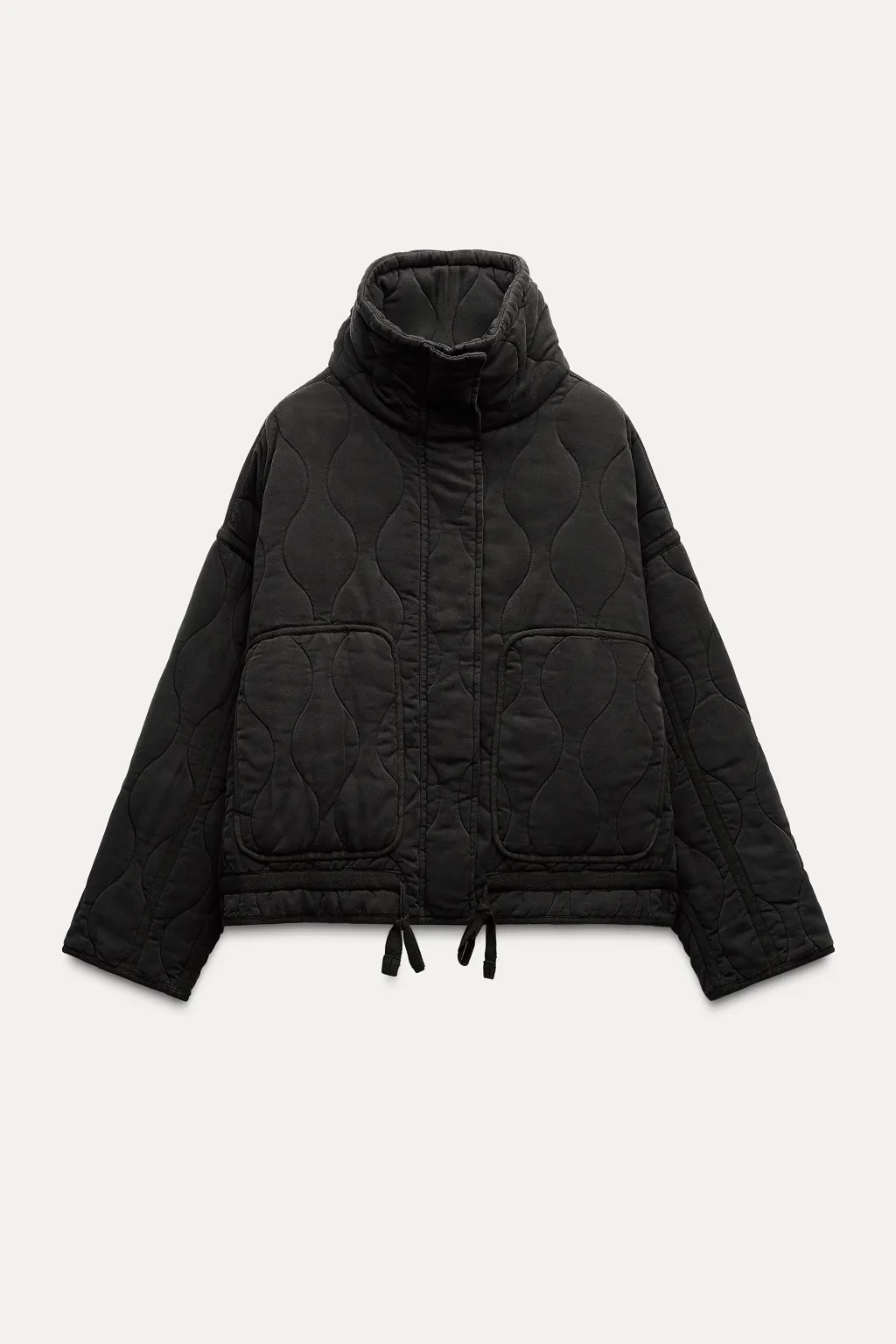 Cazadora acolchada de cuello subido y manga larga. Bolsillos de plastrón en delantero. Bajo ajustable con cordones. Cierre frontal con cremallera metálica y botones a presión.
