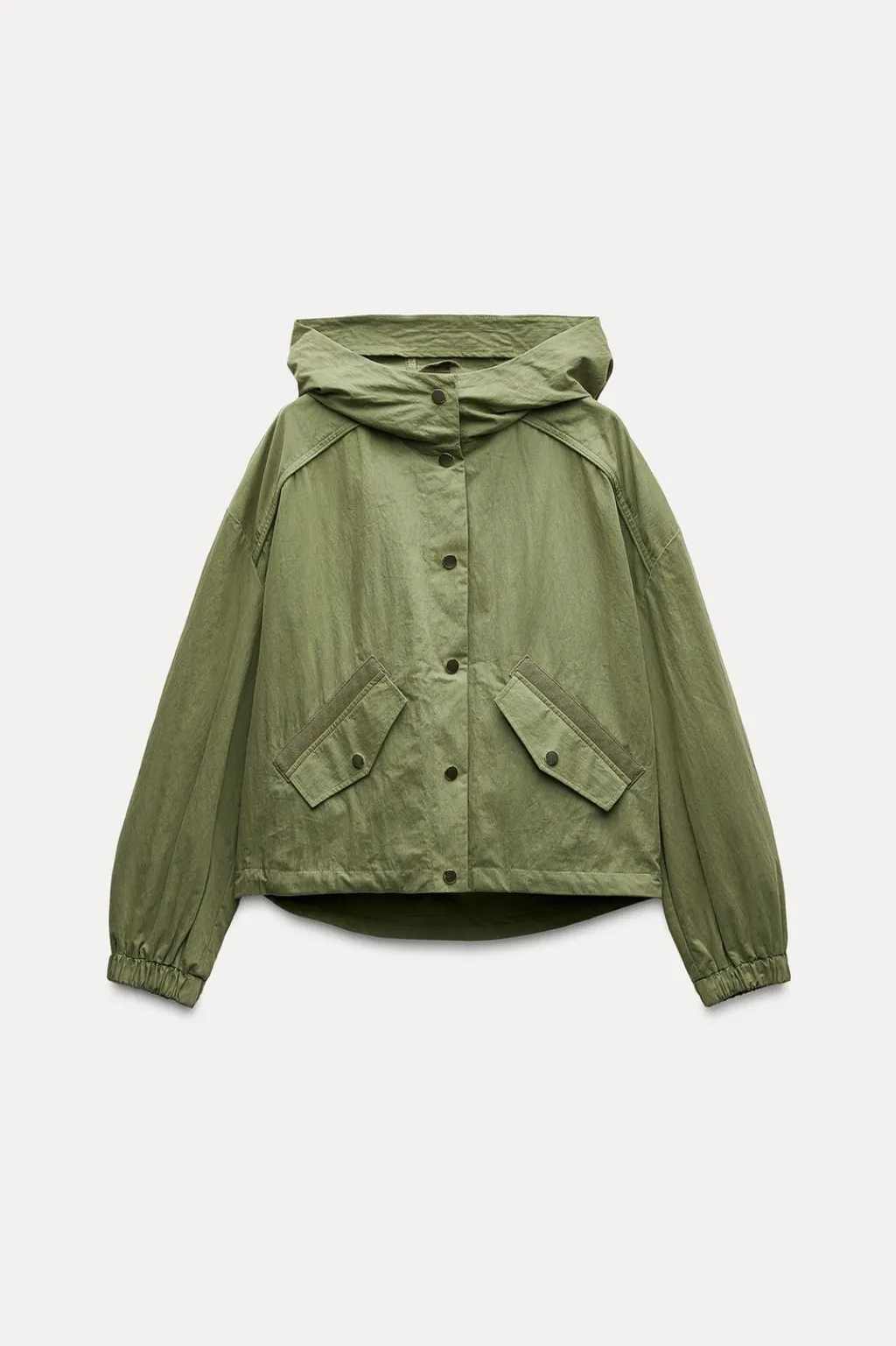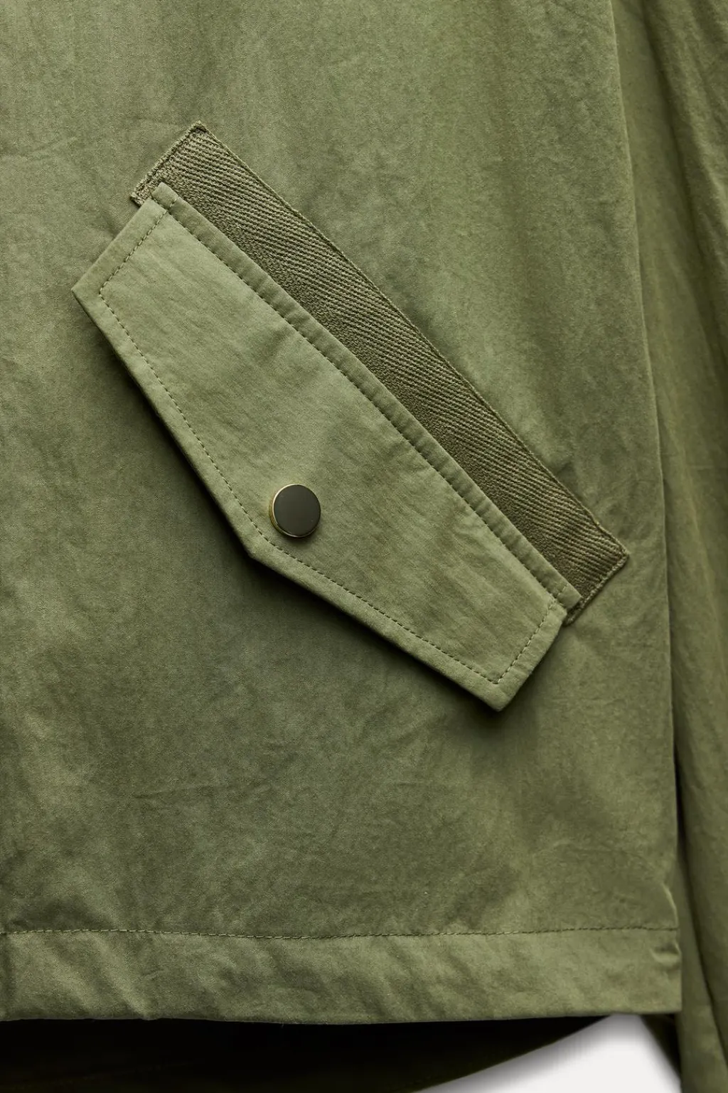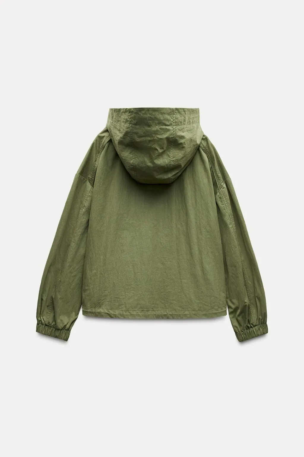 Cazadora de cuello subido con capucha y manga larga acabada en puño elástico. Bolsillos delanteros con solapa. Bajo asimétrico con cordones elásticos laterales. Cierre frontal con botones a presión.