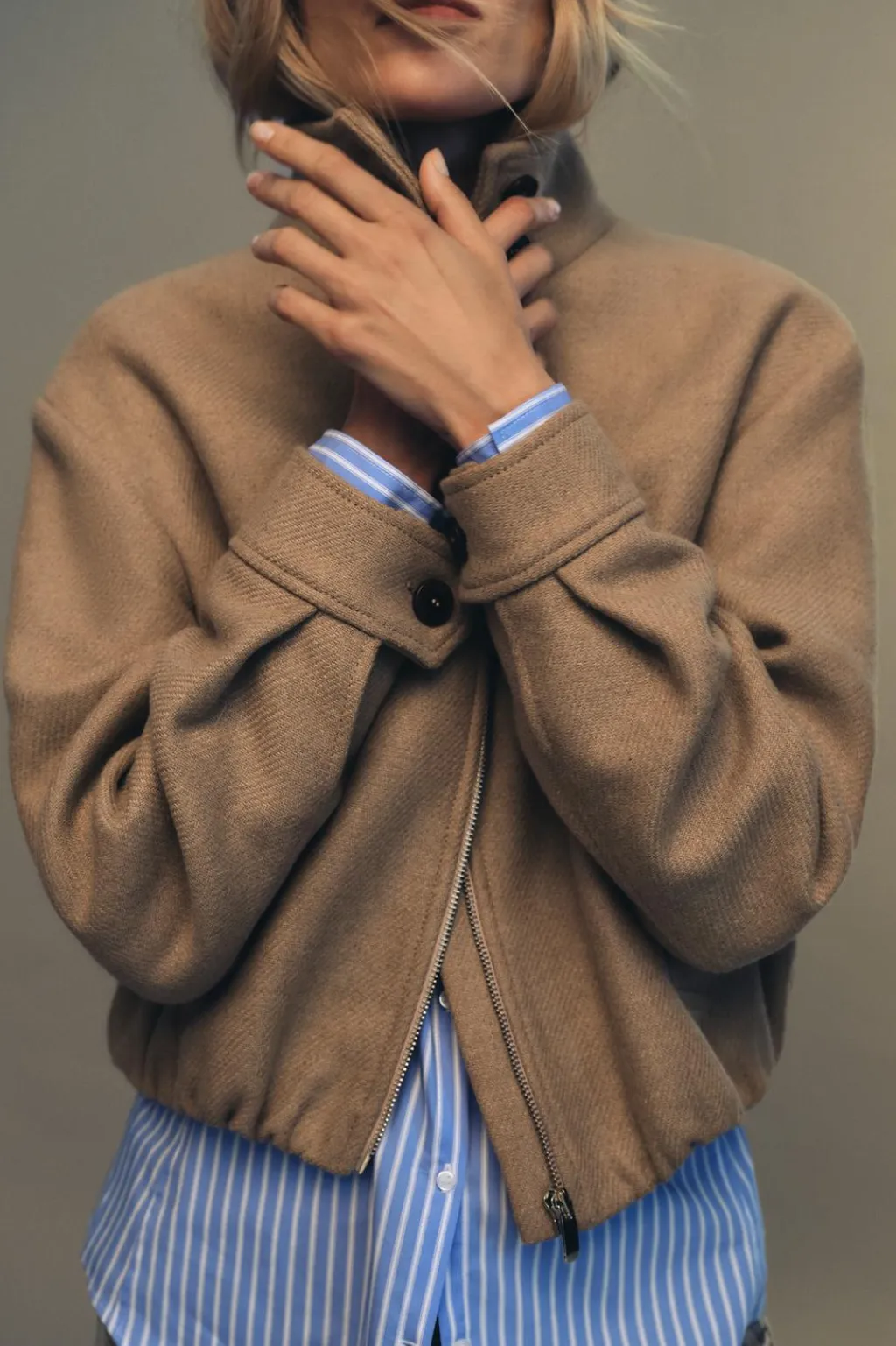 Cazadora confeccionada con lana. Cuello subido y manga larga. Bolsillos delanteros de vivo. Bajo acabado en elástico. Cierre frontal con cremallera y botones.