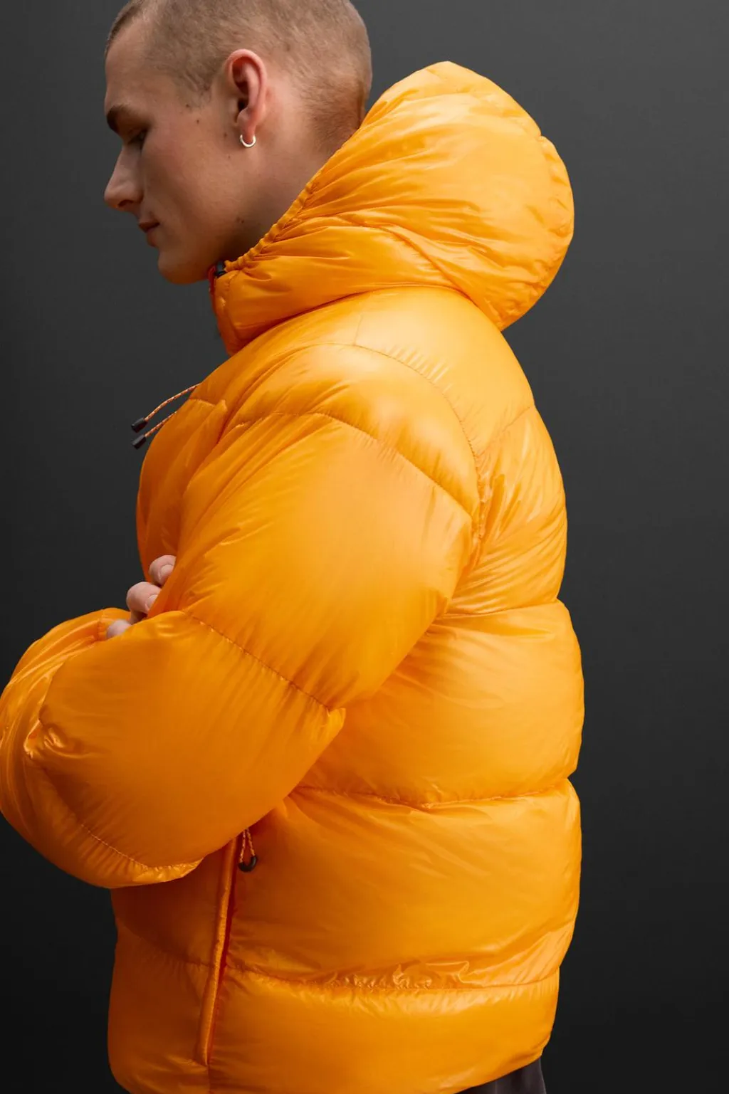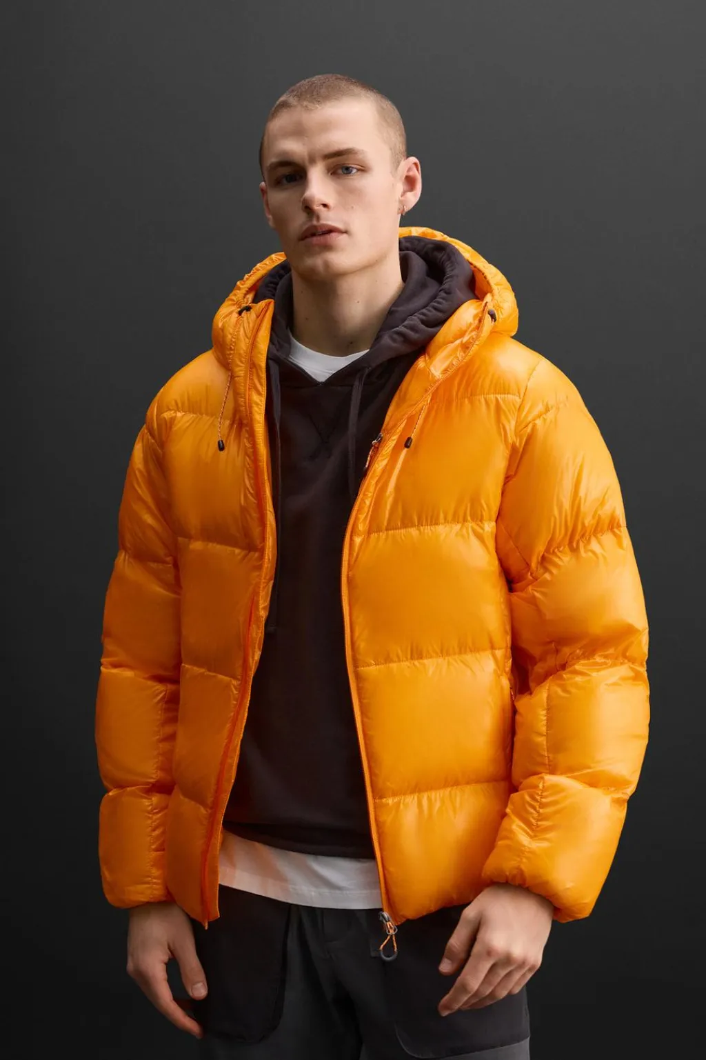 Cazadora acolchada confeccionada en tejido técnico con acabado brillo. Interior relleno con mezcla de pluma y plumón.