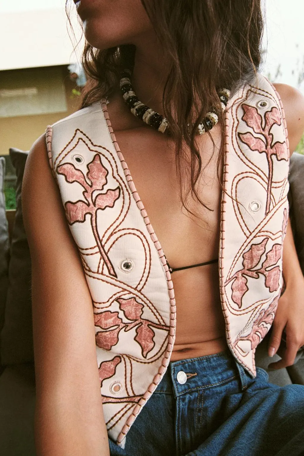 Chaleco de escote pico abierto y manga sisa. Detalle de bordados combinados y aplicaciones de espejo.