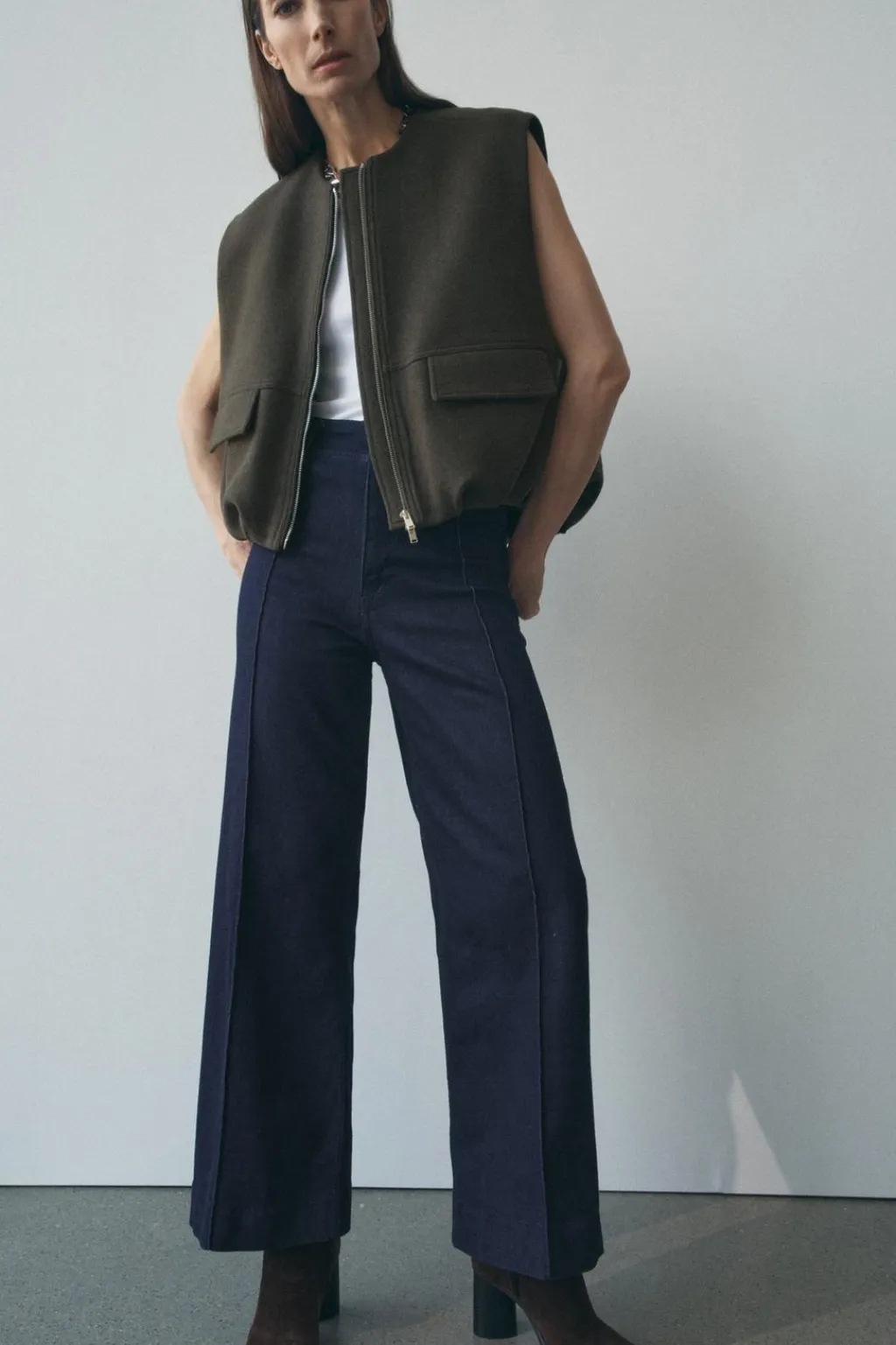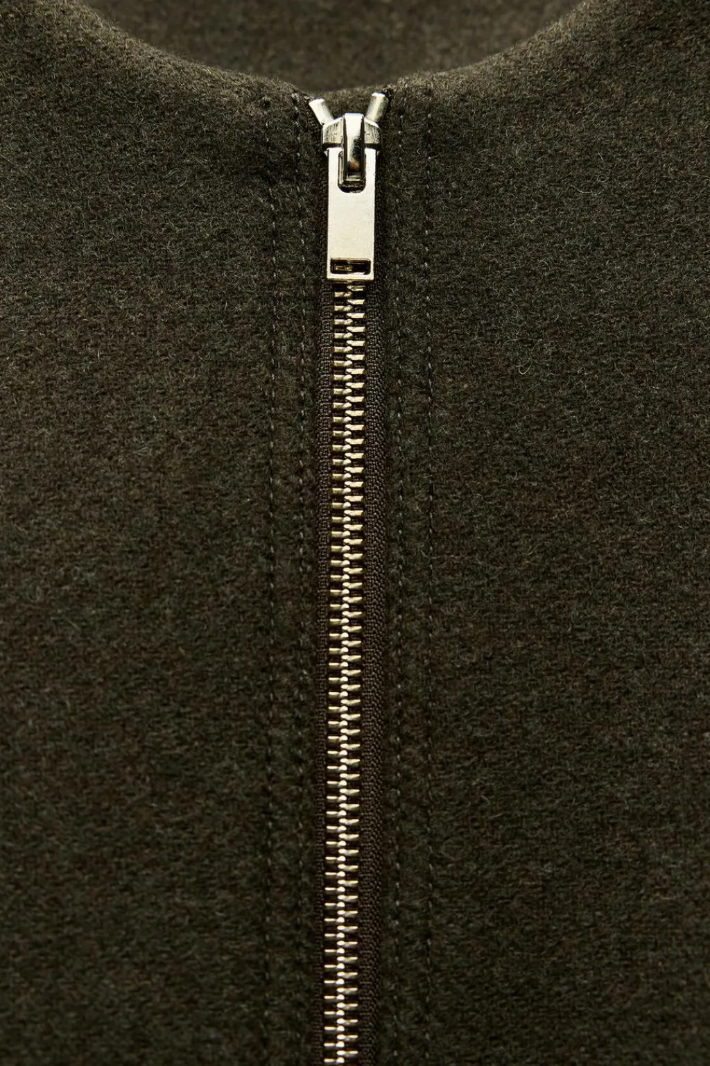 Chaleco oversize confeccionado en hilatura con mezcla de lana. Cuello redondo y manga sisa. Bolsillos con solapa en delantero. Bajo acabado en volumen con pliegues. Forro interior. Cierre frontal con cremallera metálica.