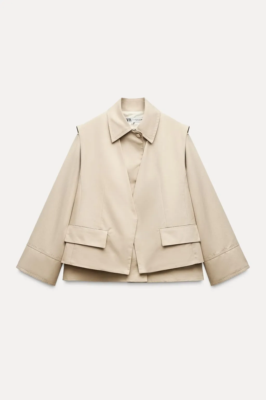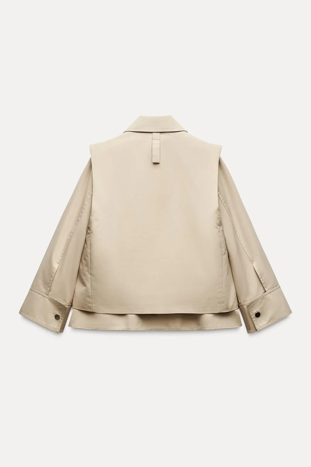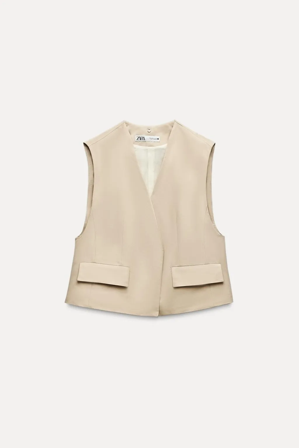 Chaleco abierto superpuesto confeccionado en mismo tejido. Bolsillos con solapa delanteros.