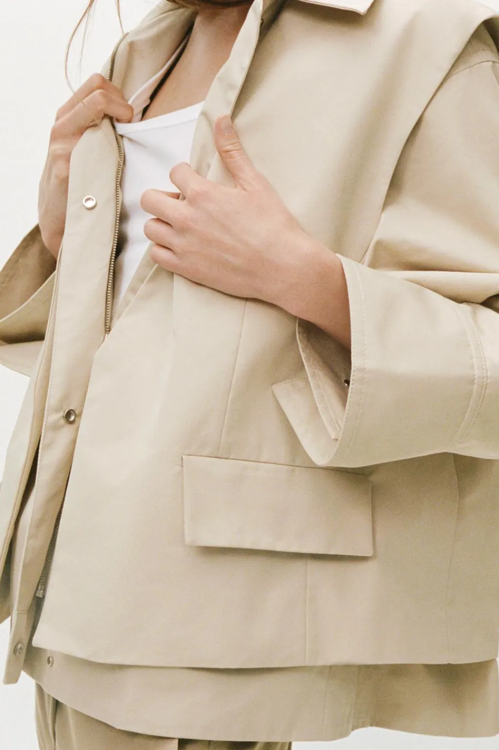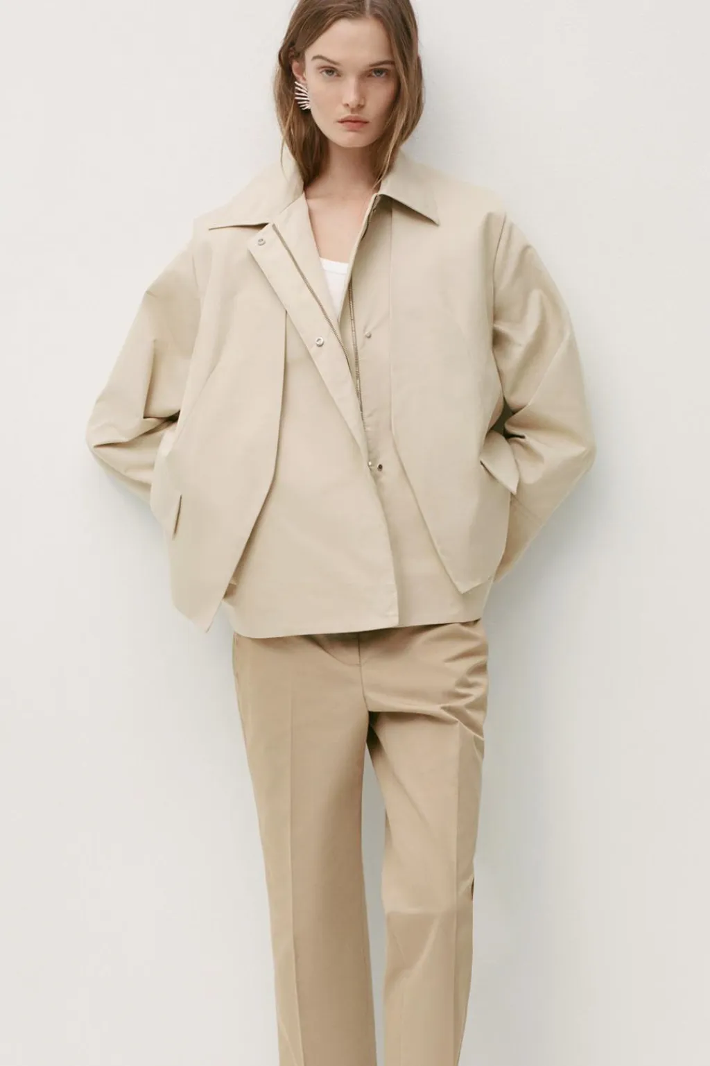 Chaqueta confeccionada en hilatura con algodón. Cuello solapa y manga larga acabada en puño. Bolsillos en delantero. Forro interior a contraste. Cierre frontal con cremallera metálica y botones a presión.