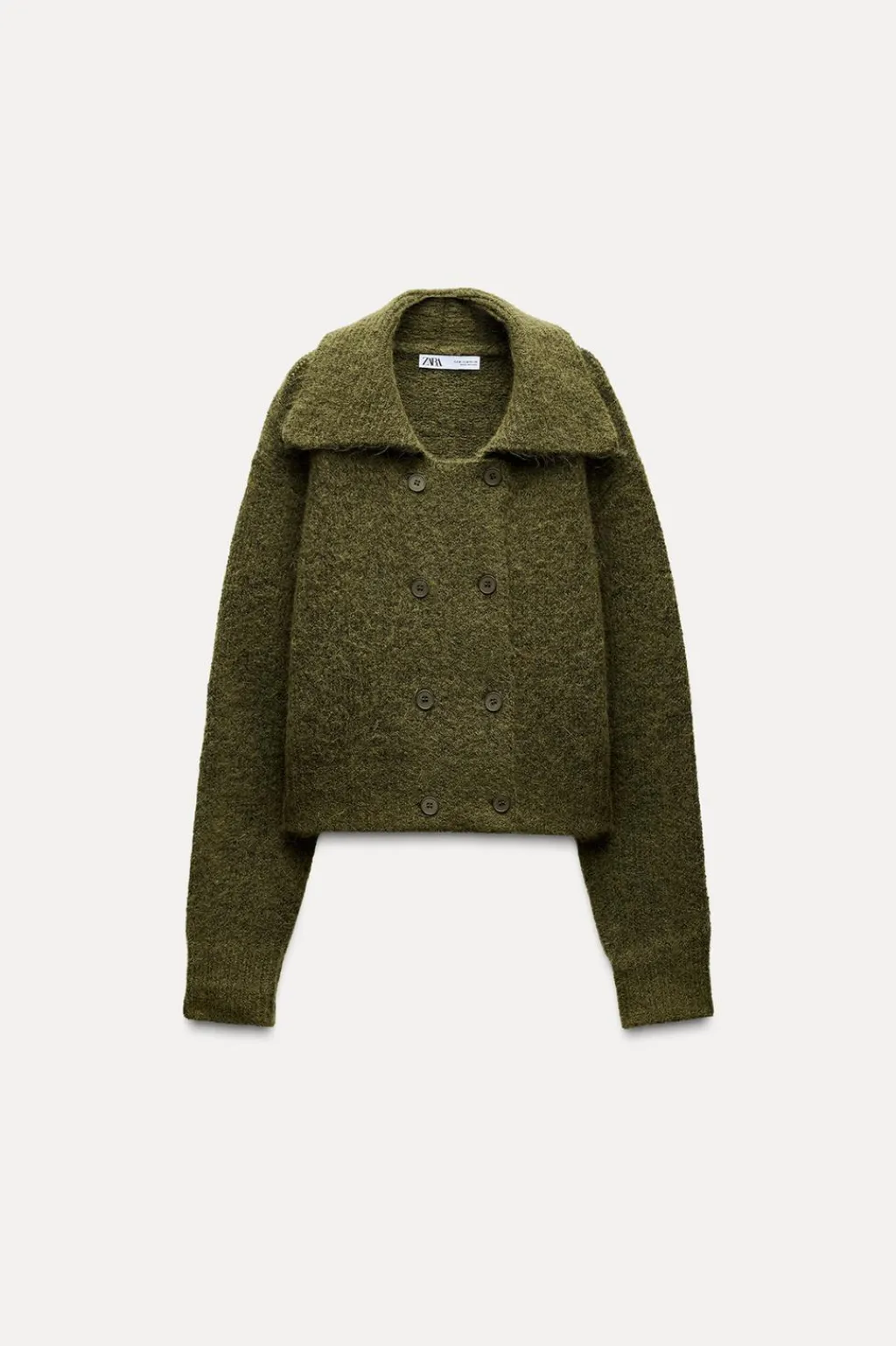 Chaqueta de cuello solapa y manga larga. Cierre frontal cruzado con botones. Acabados en rib.