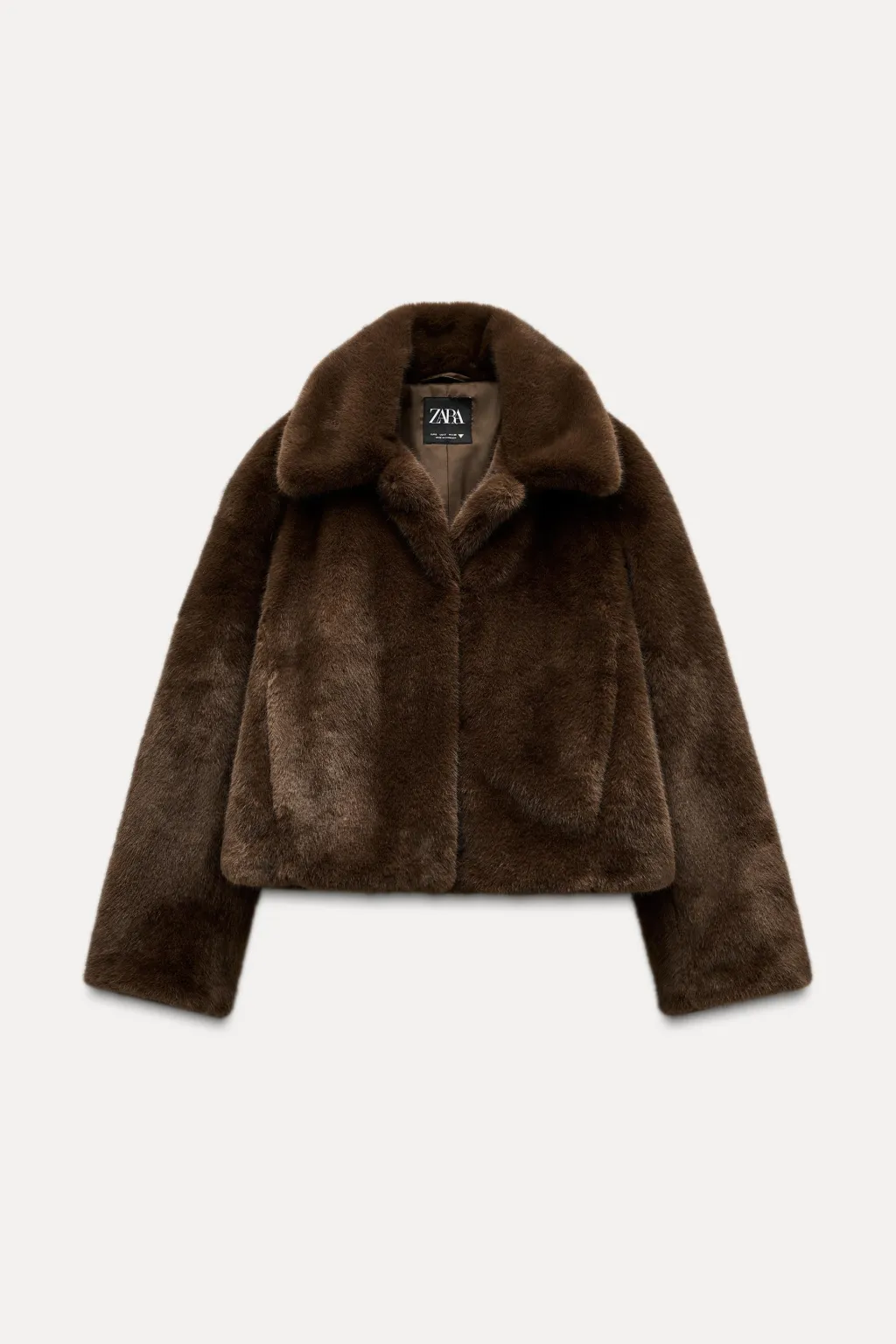 Chaqueta de cuello solapa y manga larga. Bolsillos laterales ocultos en costura. Forro interior combinado. Cierre frontal con ganchos metálicos.