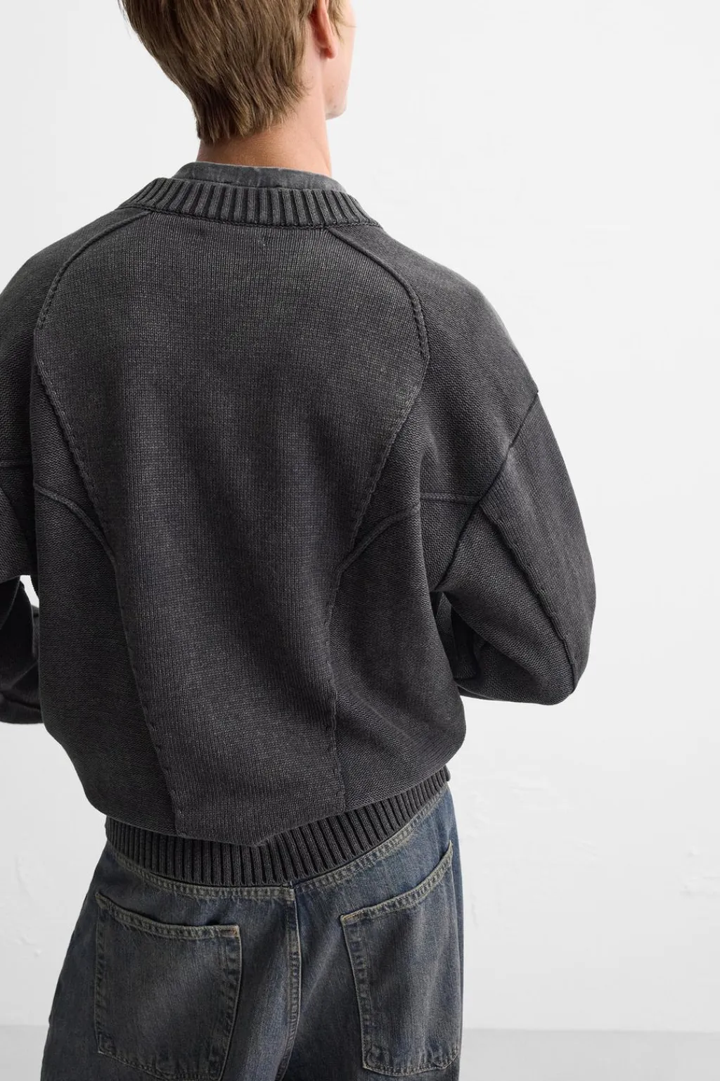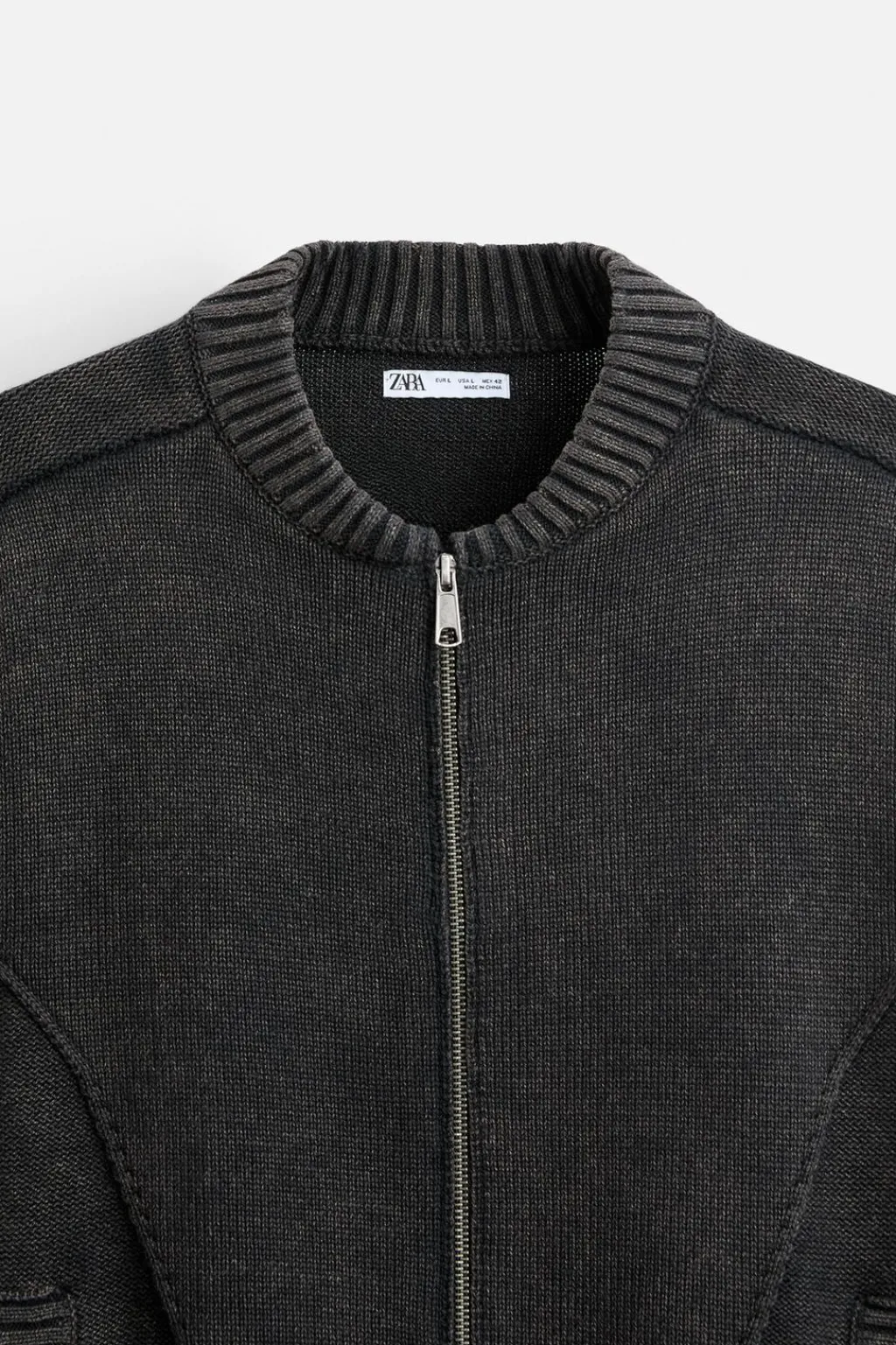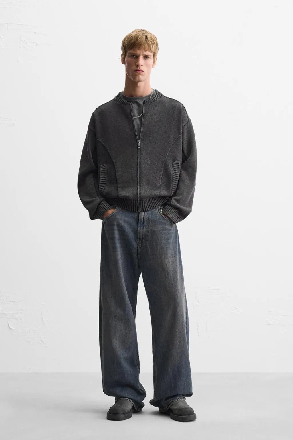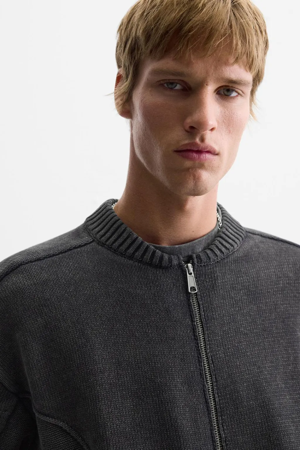 Chaqueta relaxed fit tejida en hilatura de algodón. Cuello acabado en rib elástico y manga larga. Bolsillos de vivo en cadera. Acabados en rib. Cierre frontal de cremallera.