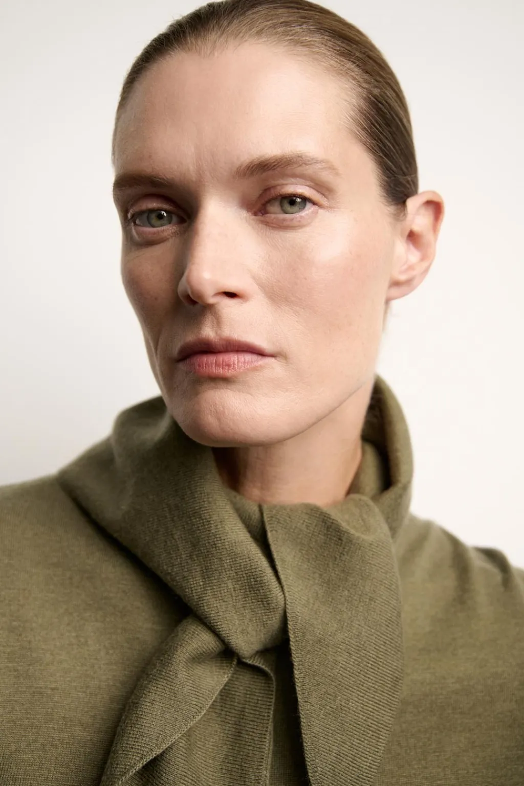 Chaqueta de cuello redondo con pañuelo y manga larga. Cierre frontal con botones.