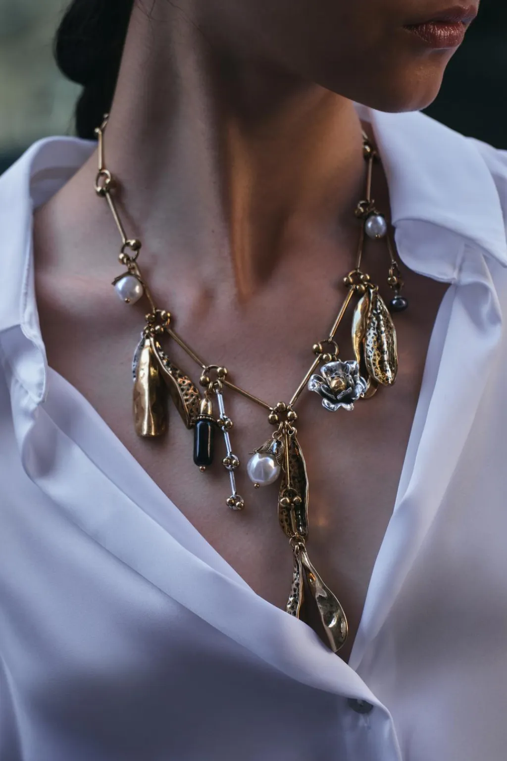 Collar de piezas metálicas con colgantes de charms en diferentes formas, tamaños y materiales. Aplicación de perlas cultivadas en agua dulce. Cierre con mosquetón.