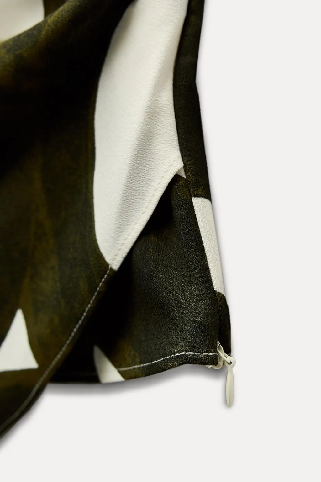Cuerpo de cuello redondo y manga corta. Delantero cruzado con pliegues delanteros. Cierre en espalda con botón y con cremallera lateral oculta en costura.