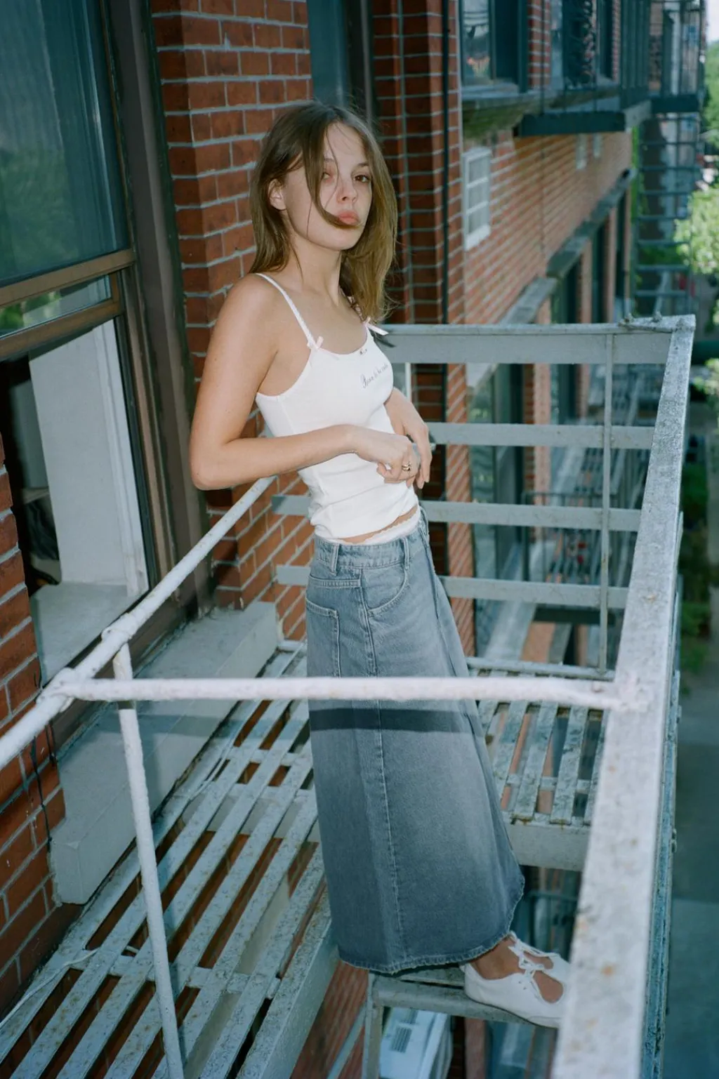 Falda midi de tiro medio con trabillas y cinco bolsillos. Efecto lavado. Cierre frontal con cremallera y botón metálico.
