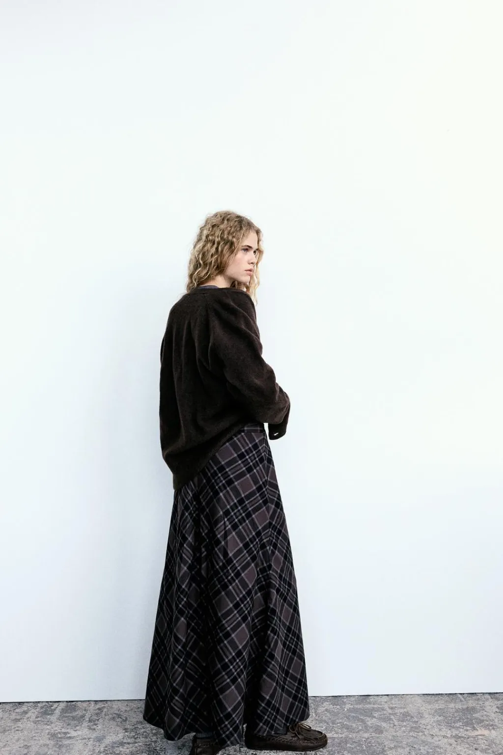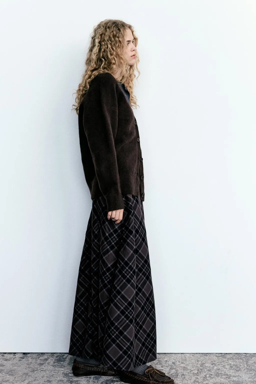 Falda larga de tiro medio. Cierre lateral con cremallera oculta en costura.