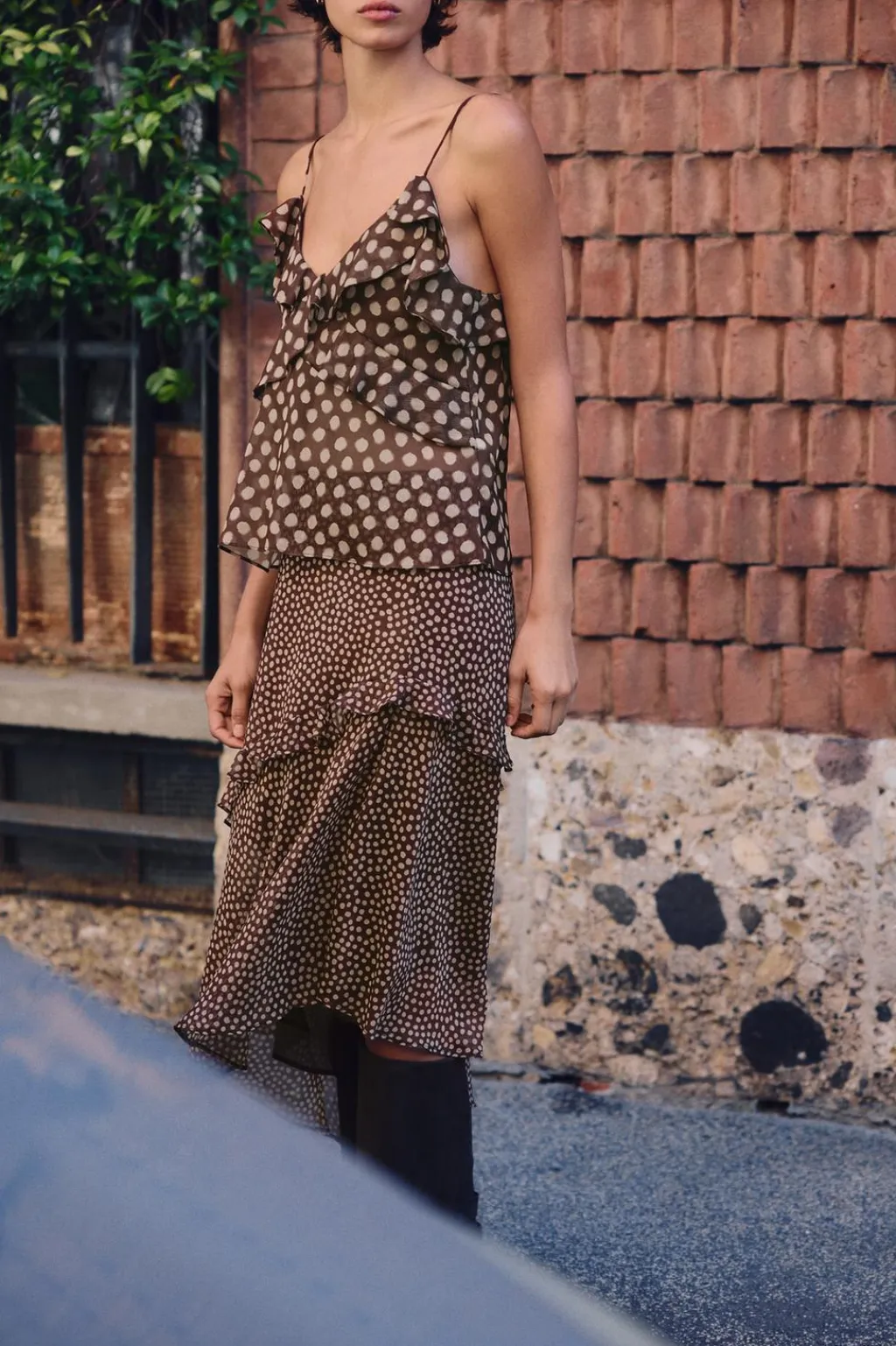 Falda con cintura elástica y puntilla. Detalle de volantes y bajo asimétrico. Forro interior.