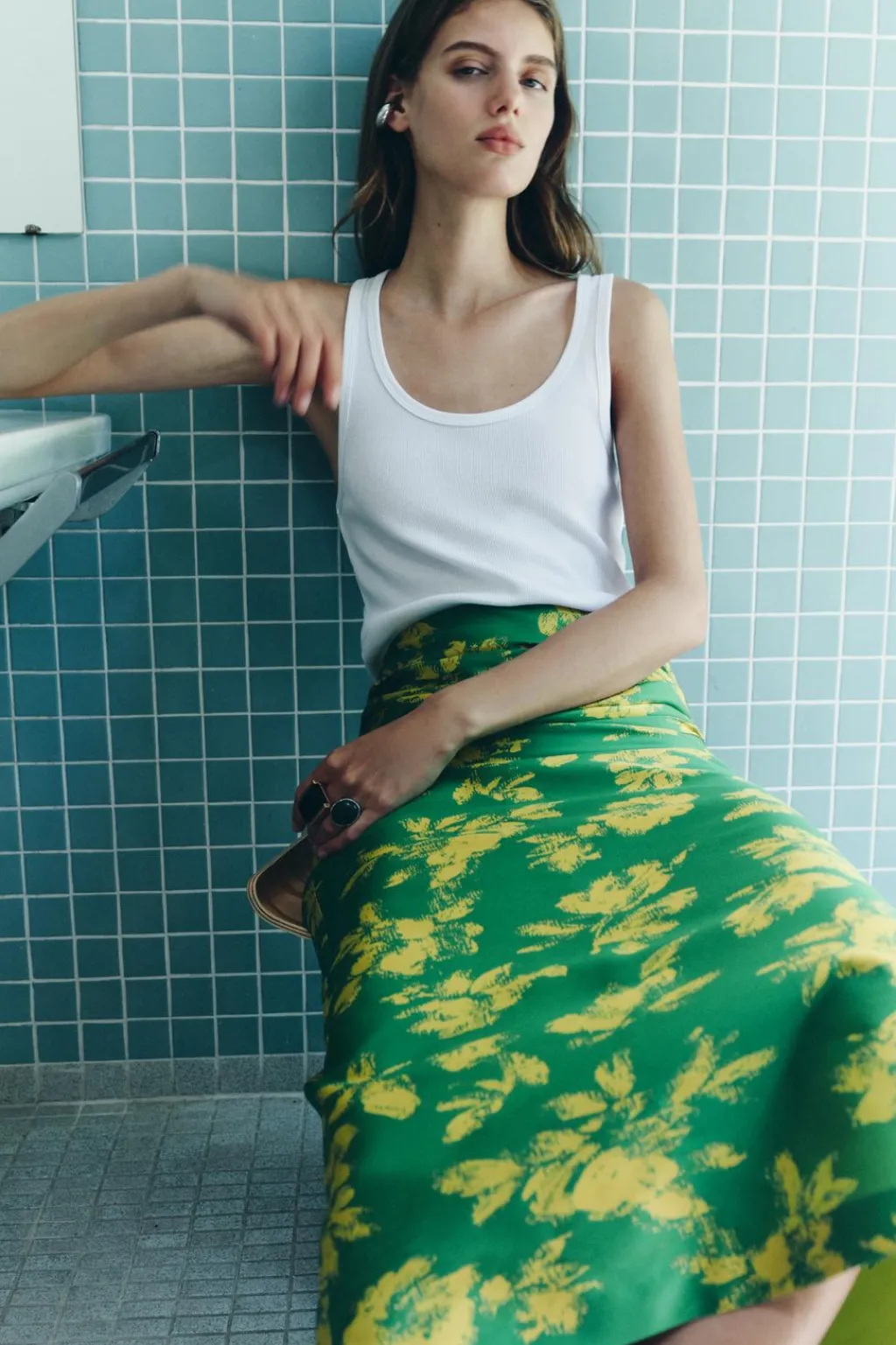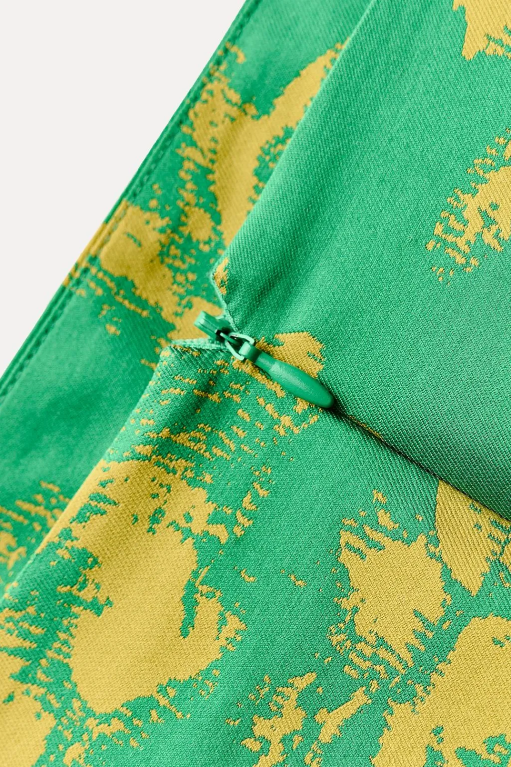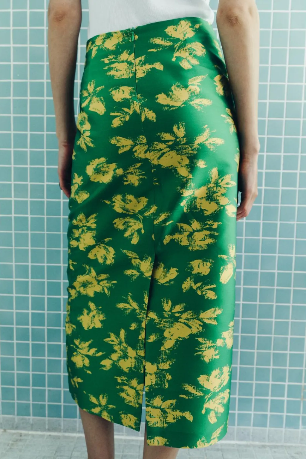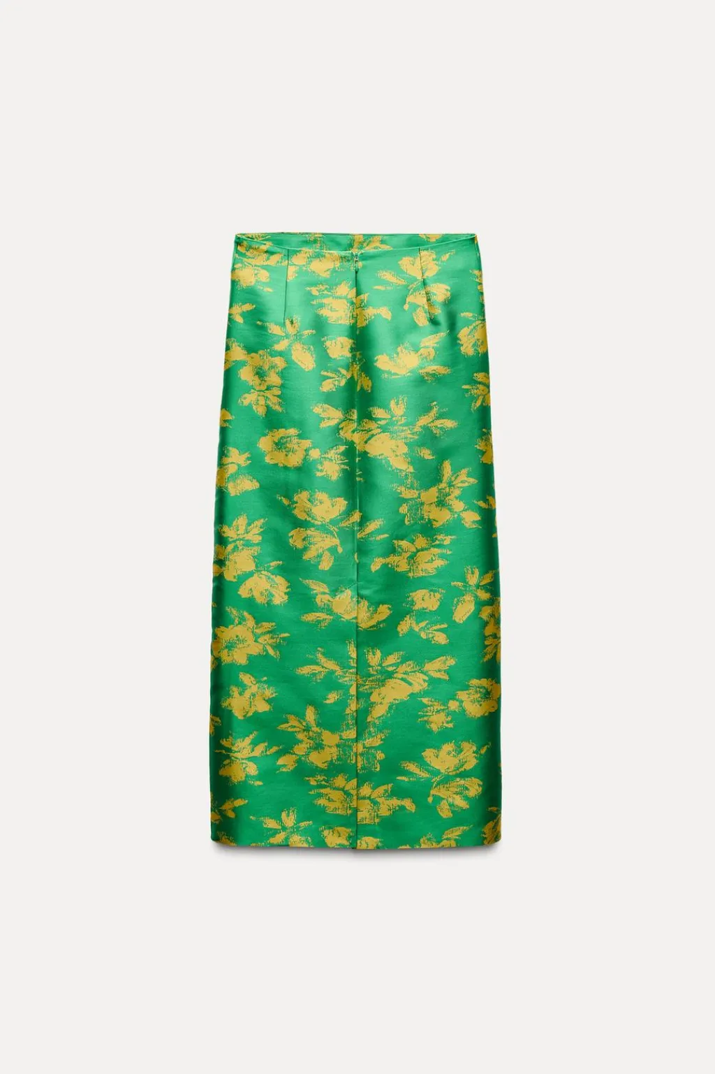 Falda midi de tiro alto. Detalle de drapeado lateral. Bajo acabado en abertura. Cierre en espalda con cremallera oculta en costura.