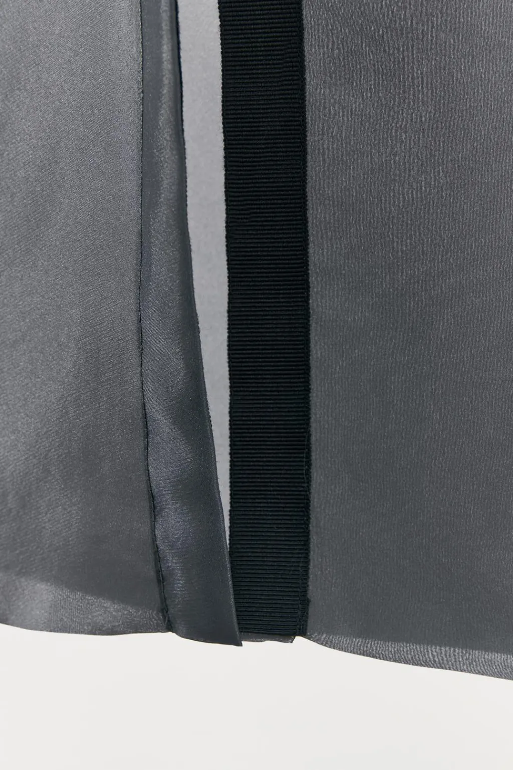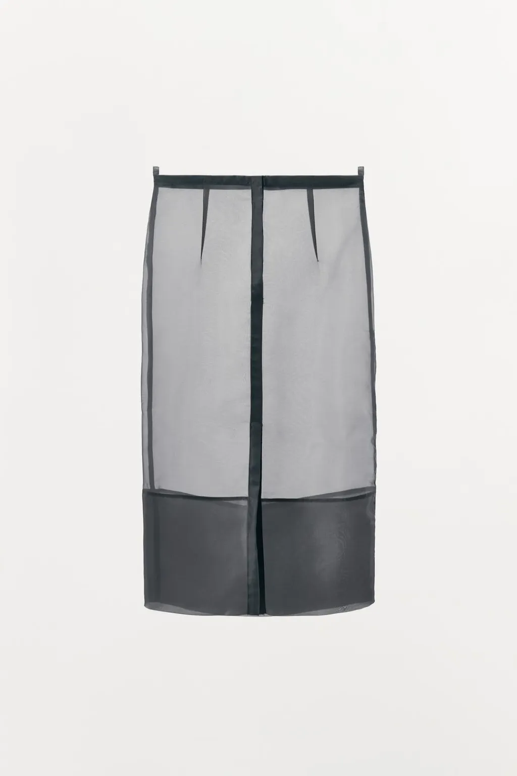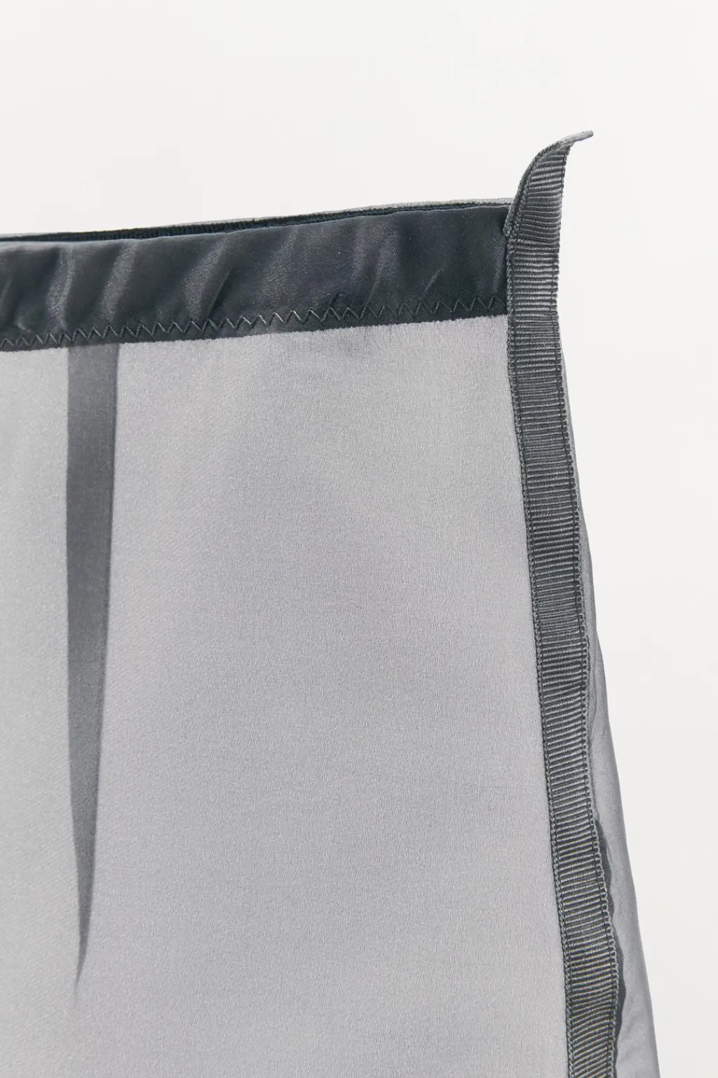 Falda semitransparente confeccionada en organza de tiro alto. Detalle de vivos combinados a contraste. Bajo con abertura en espalda. Cierre en espalda con botones ocultos.