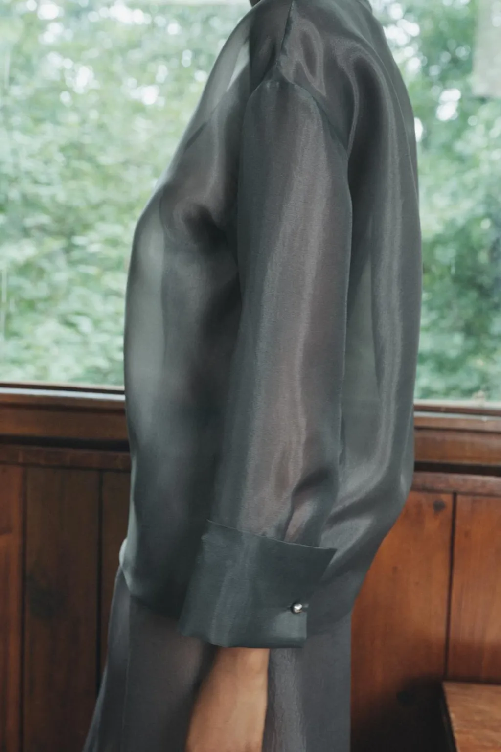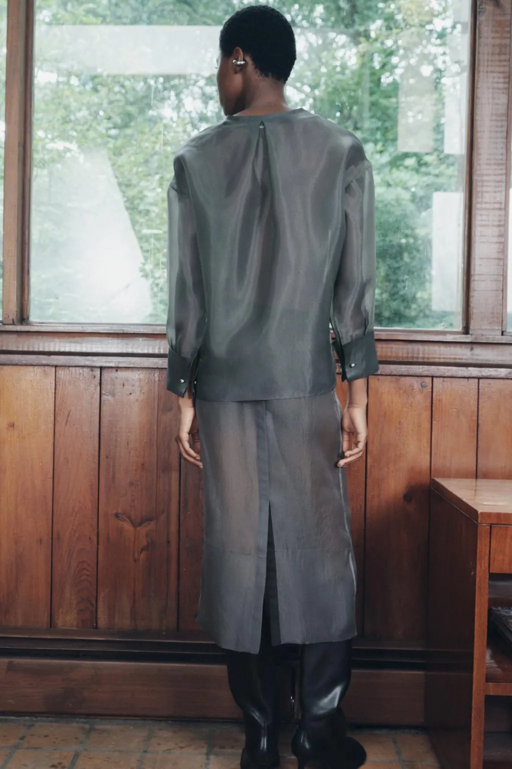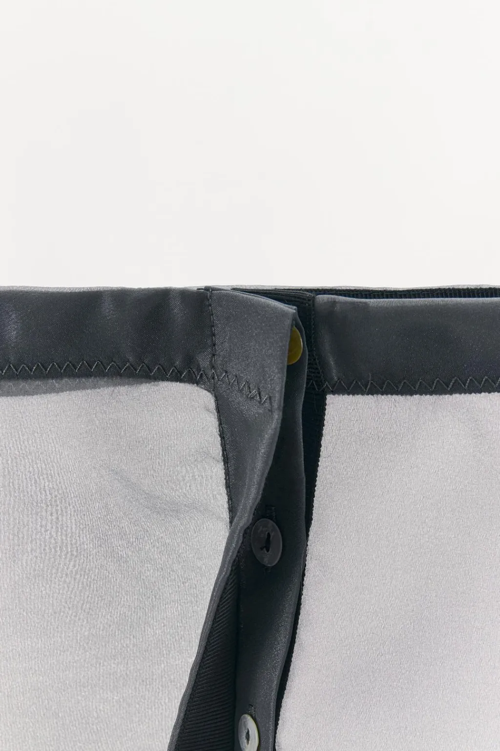 Falda semitransparente confeccionada en organza de tiro alto. Detalle de vivos combinados a contraste. Bajo con abertura en espalda. Cierre en espalda con botones ocultos.