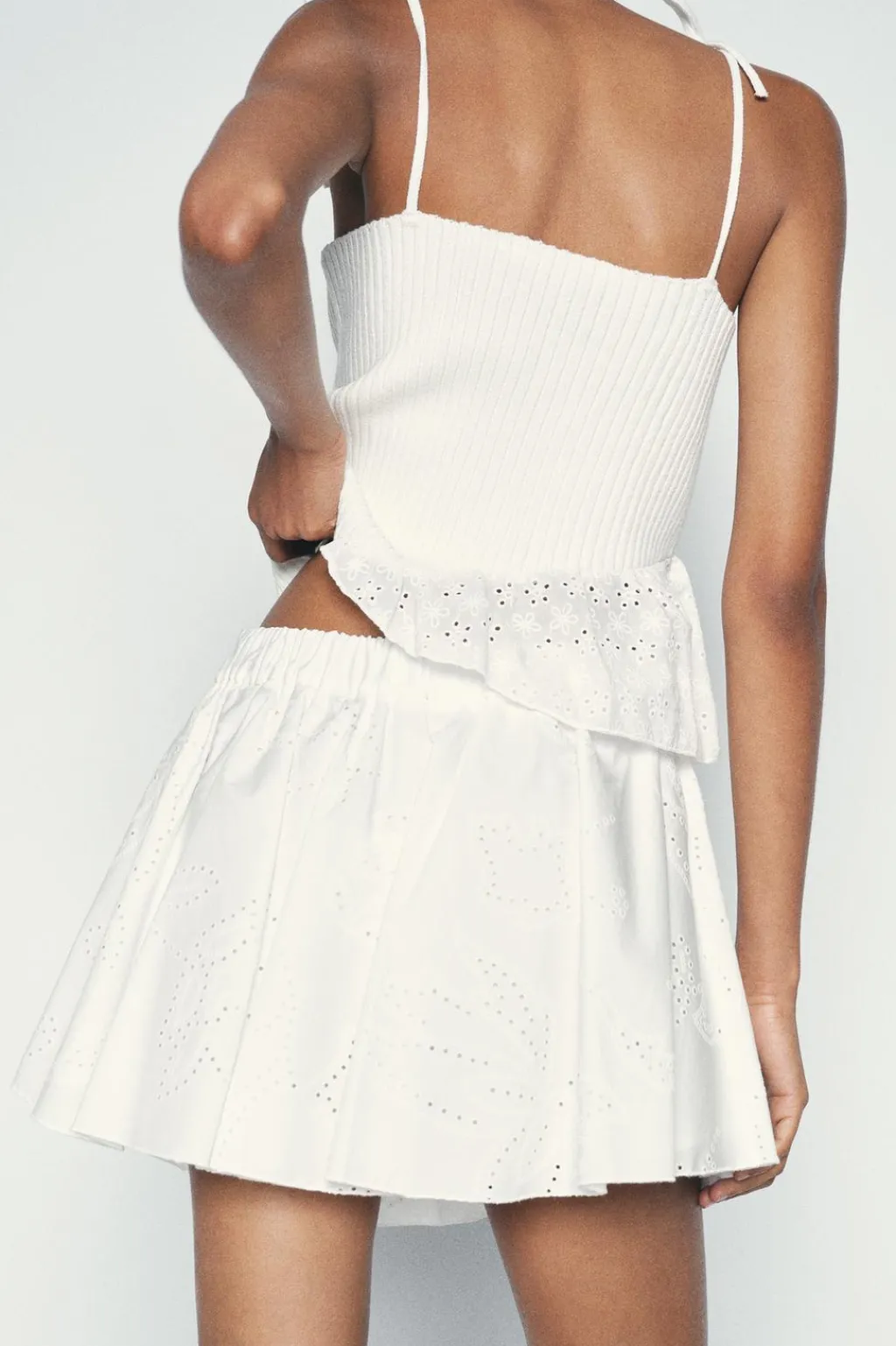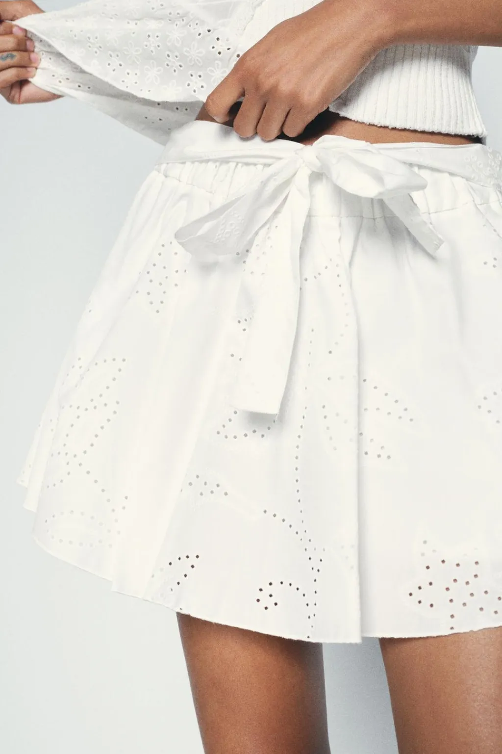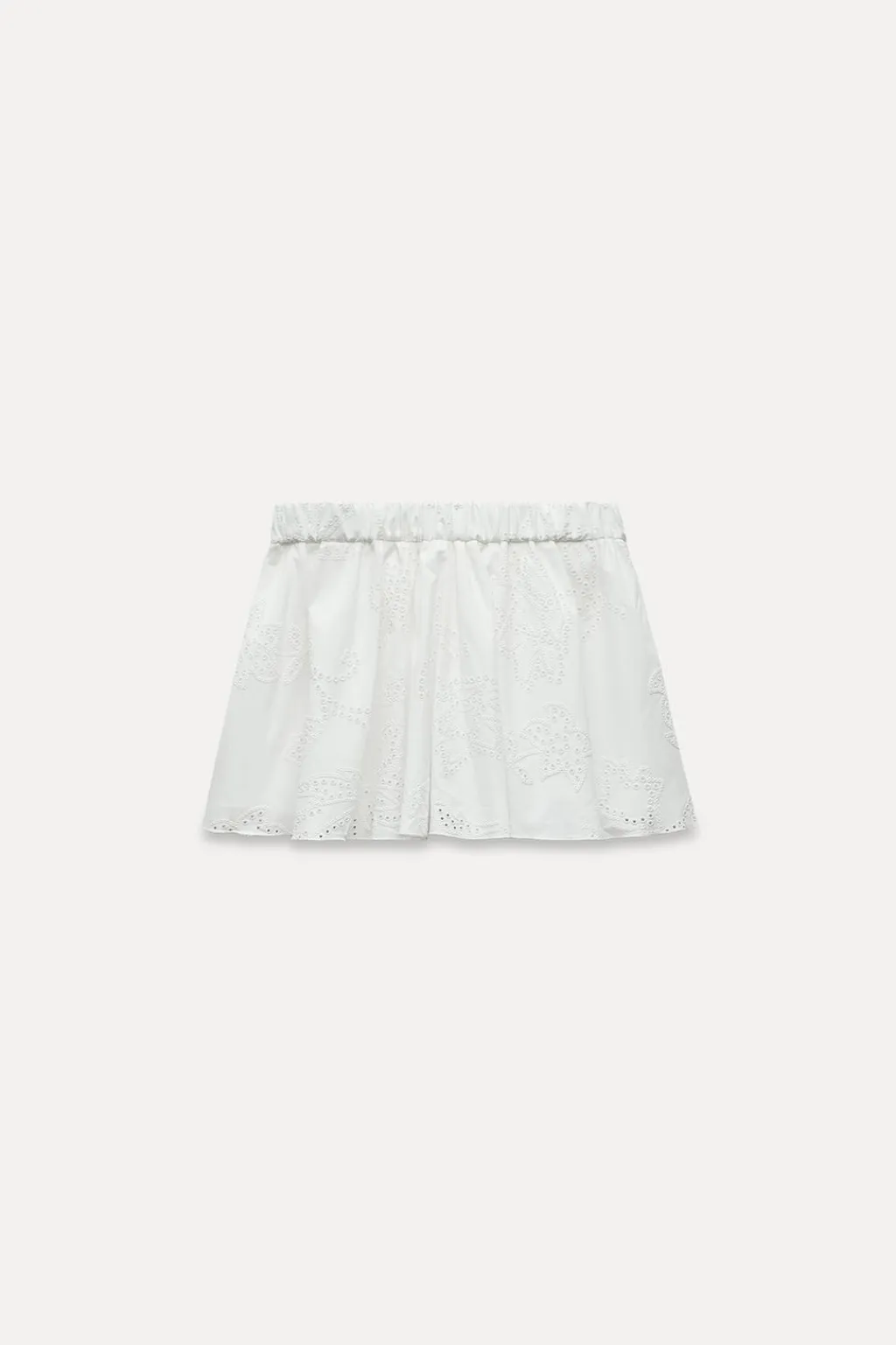 Falda pantalón de tiro medio con cintura elástica y lazo delantero del mismo tejido. Forro interior. Detalle de bordados perforados y engomados.