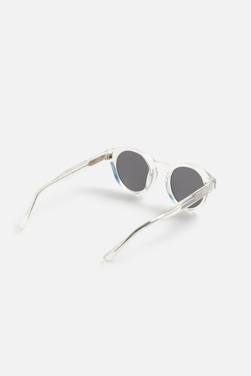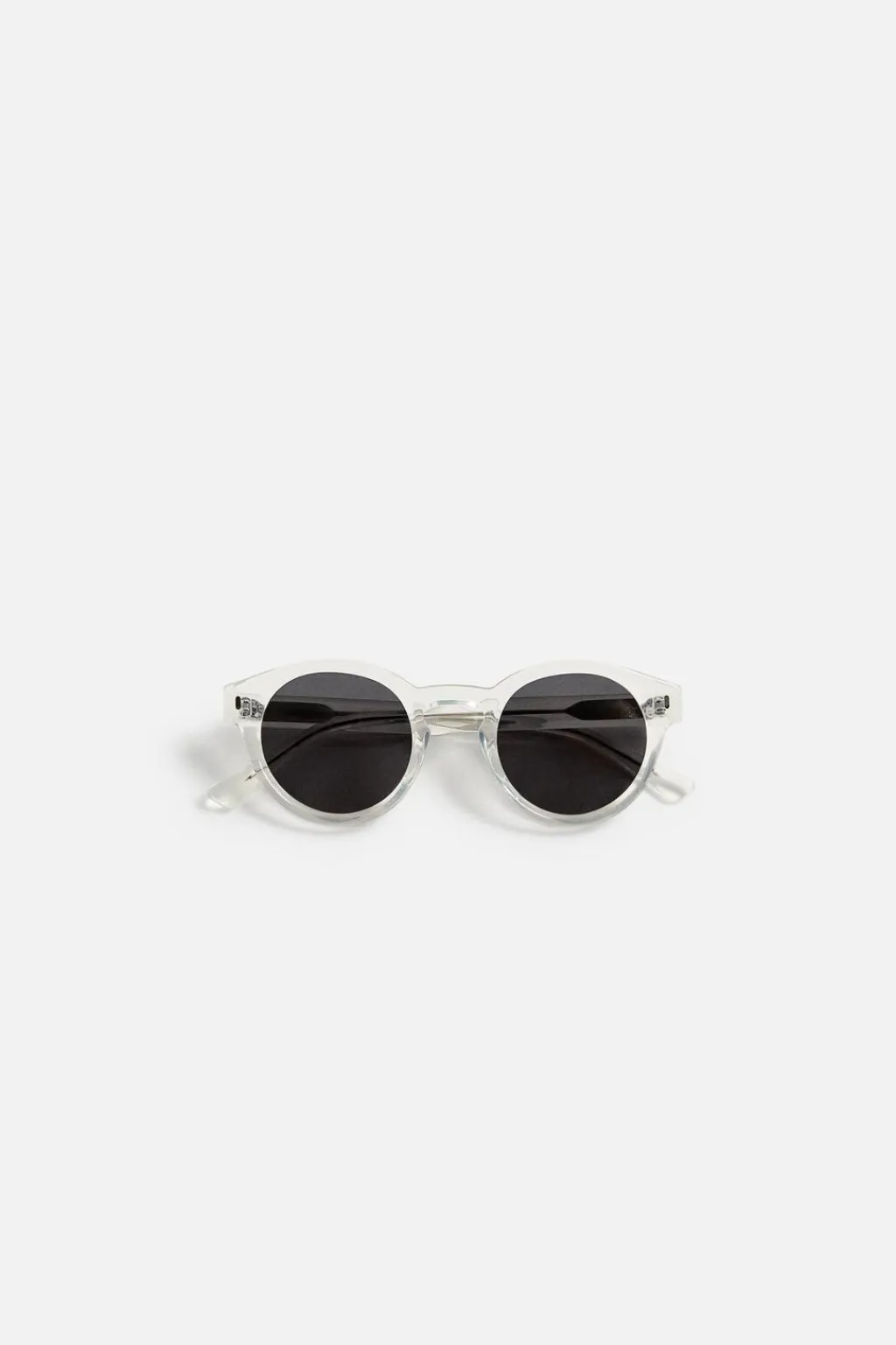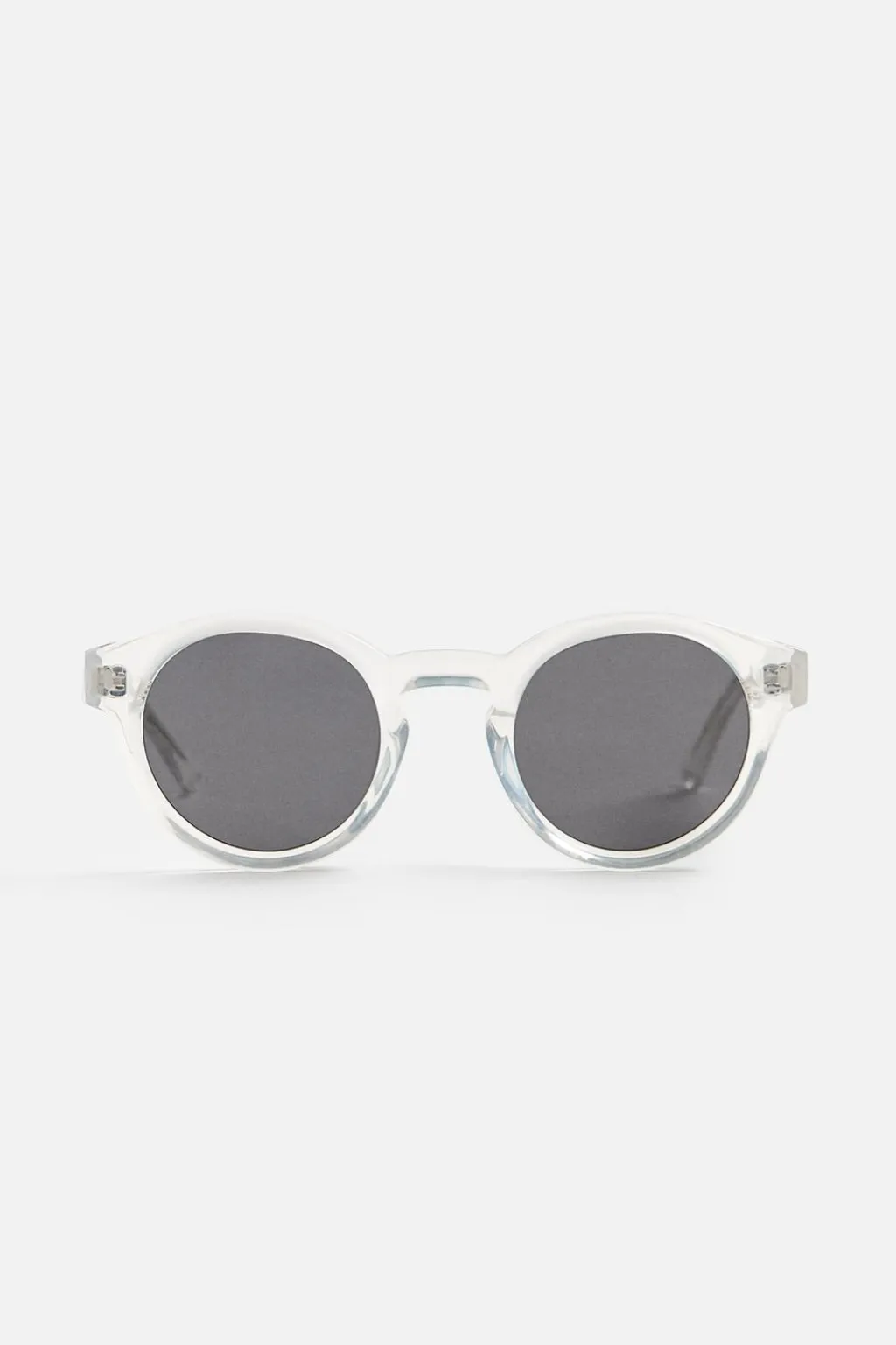 Gafas de sol con montura redonda en acetato transparente. Lentes polarizadas. Incluye funda.