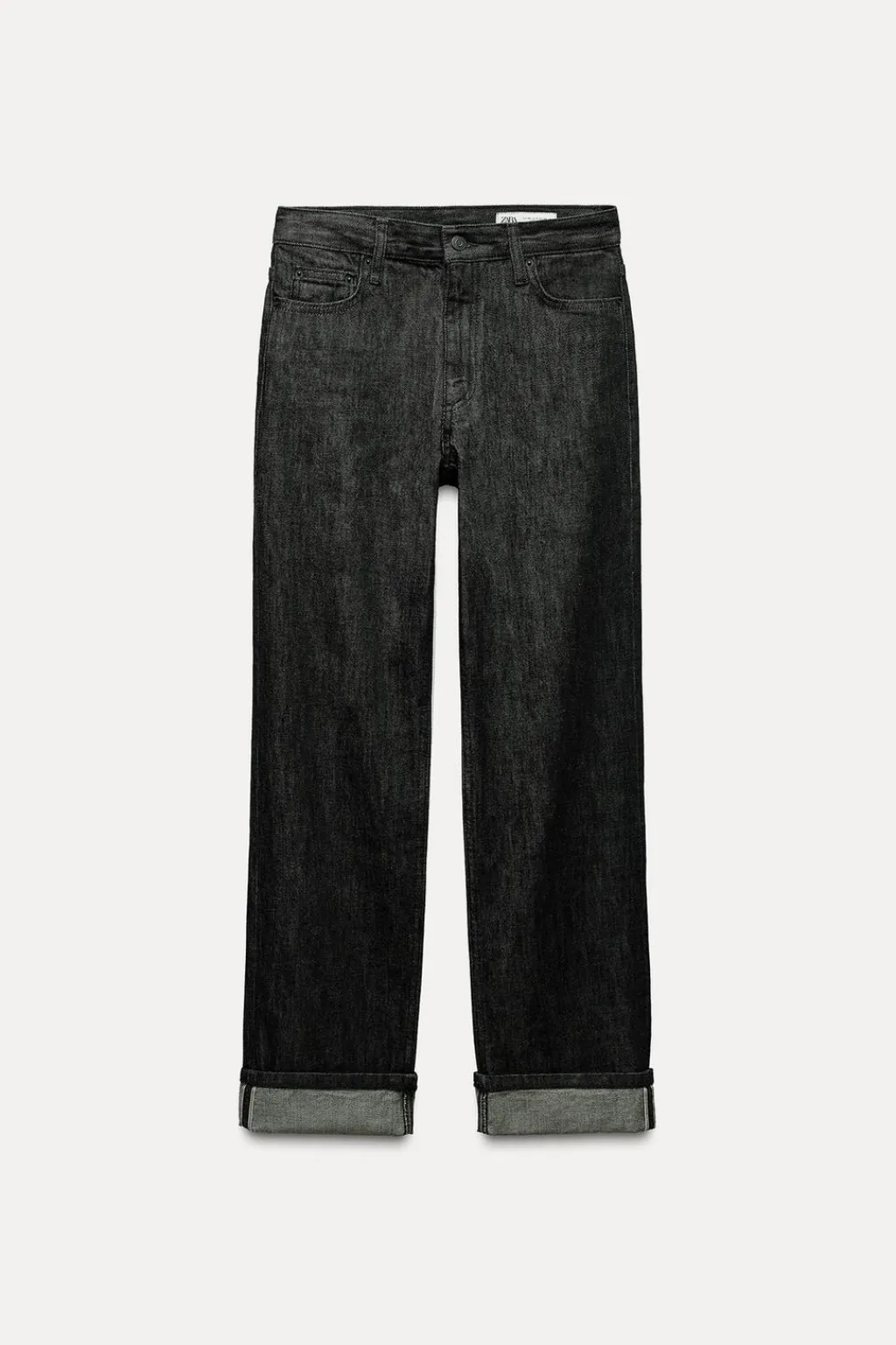Jeans de tiro medio y cintura con trabillas. Cinco bolsillos. Pierna recta. Cierre frontal con cremallera y botón.