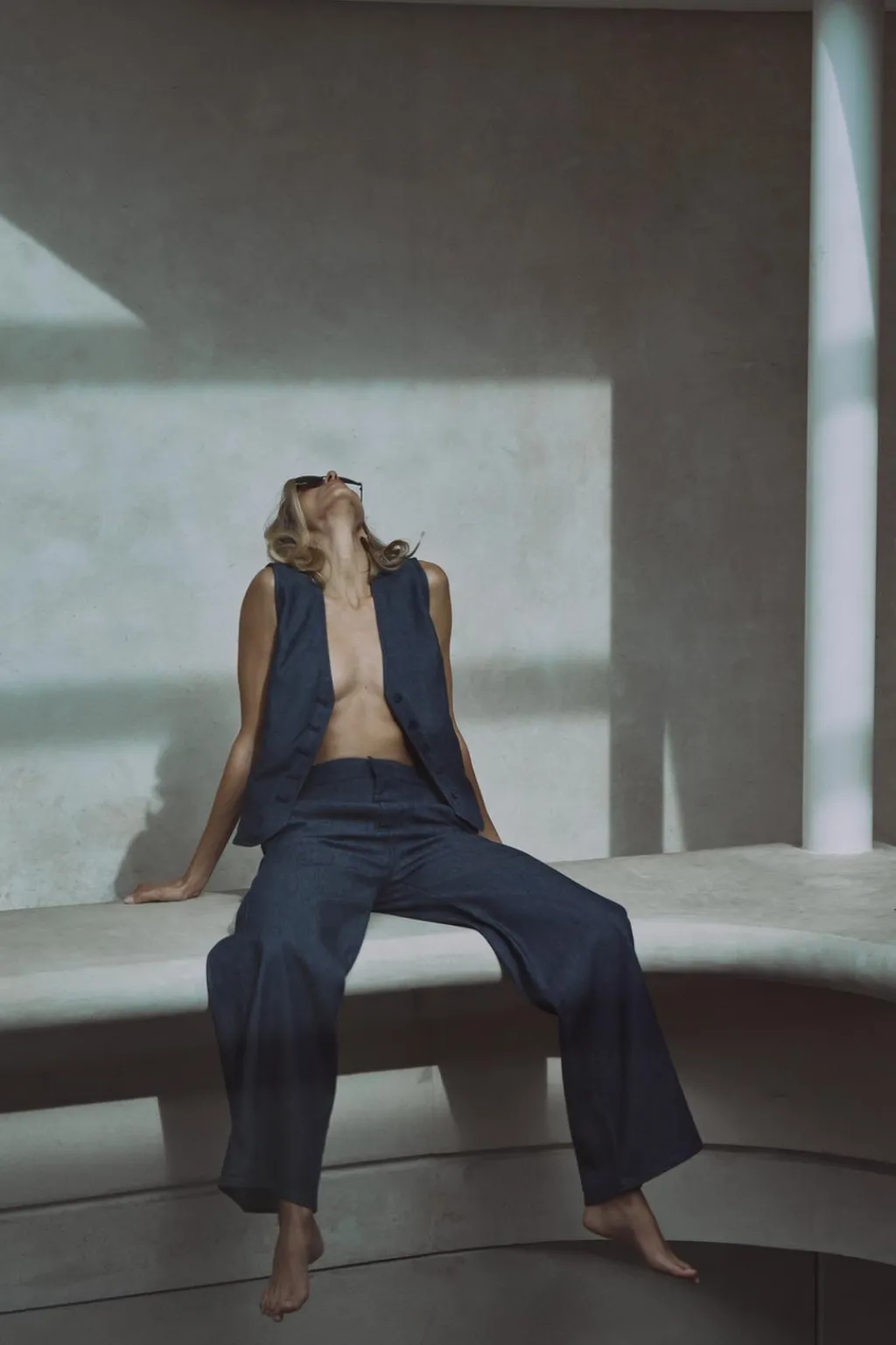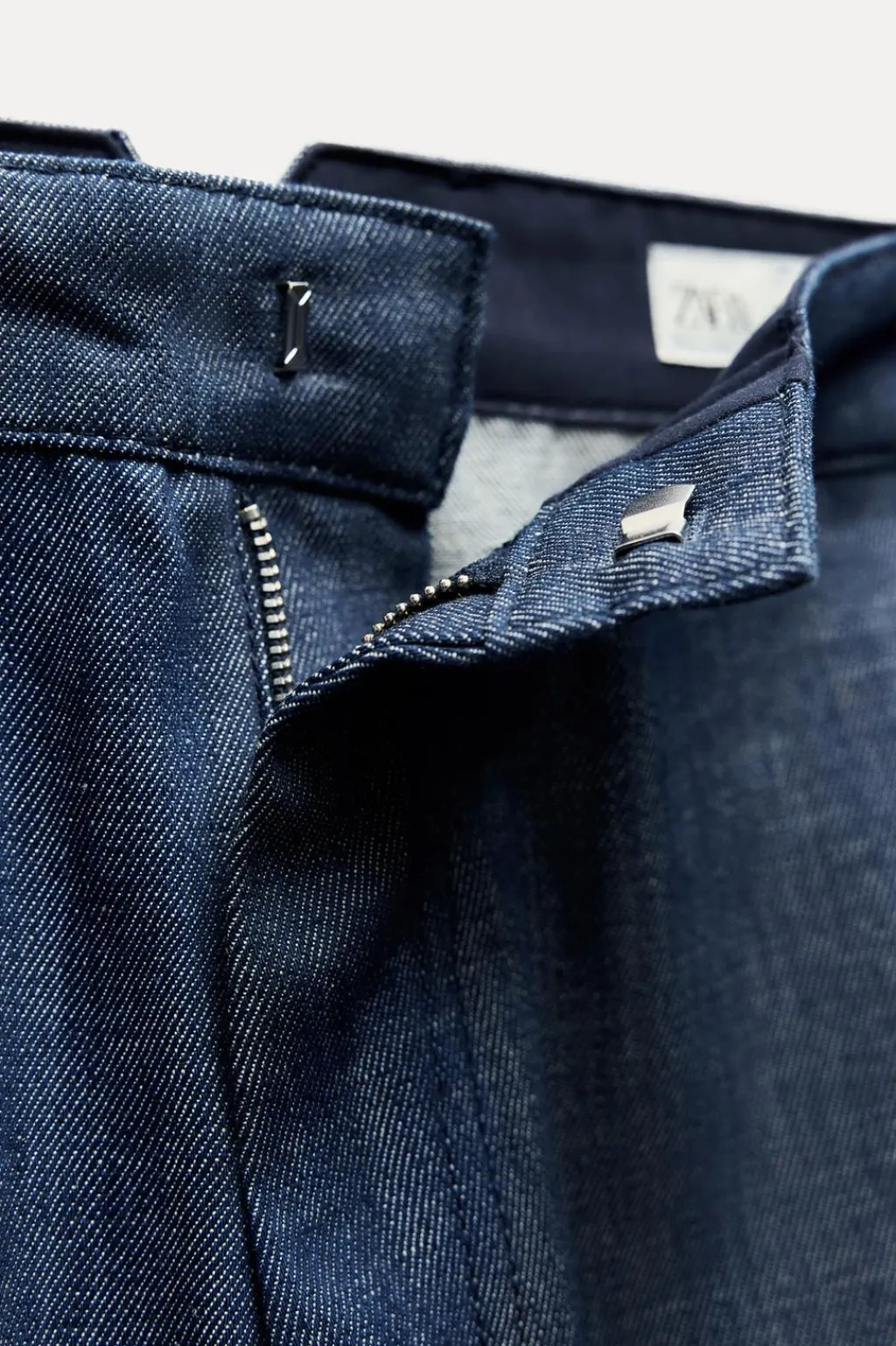 Jeans de tiro alto y cintura con trabilla. Bolsillos laterales ocultos en costura y de plastrón en espalda. Pierna recta. Cierre frontal con cremallera, botón y gancho metálico.