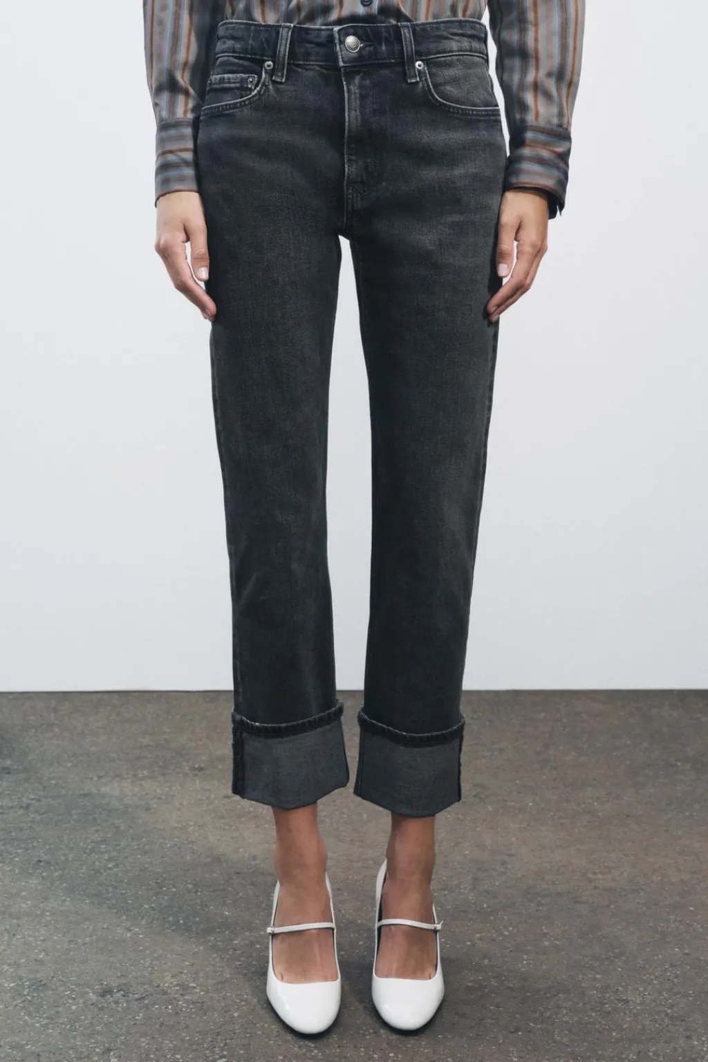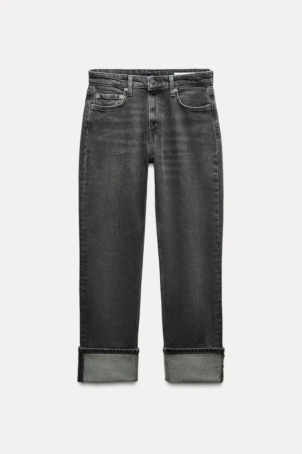 Jeans de tiro medio con cinco bolsillos. Cintura con trabillas. Bajo acabado en vuelta. Cierre frontal con cremallera y botón metálico.