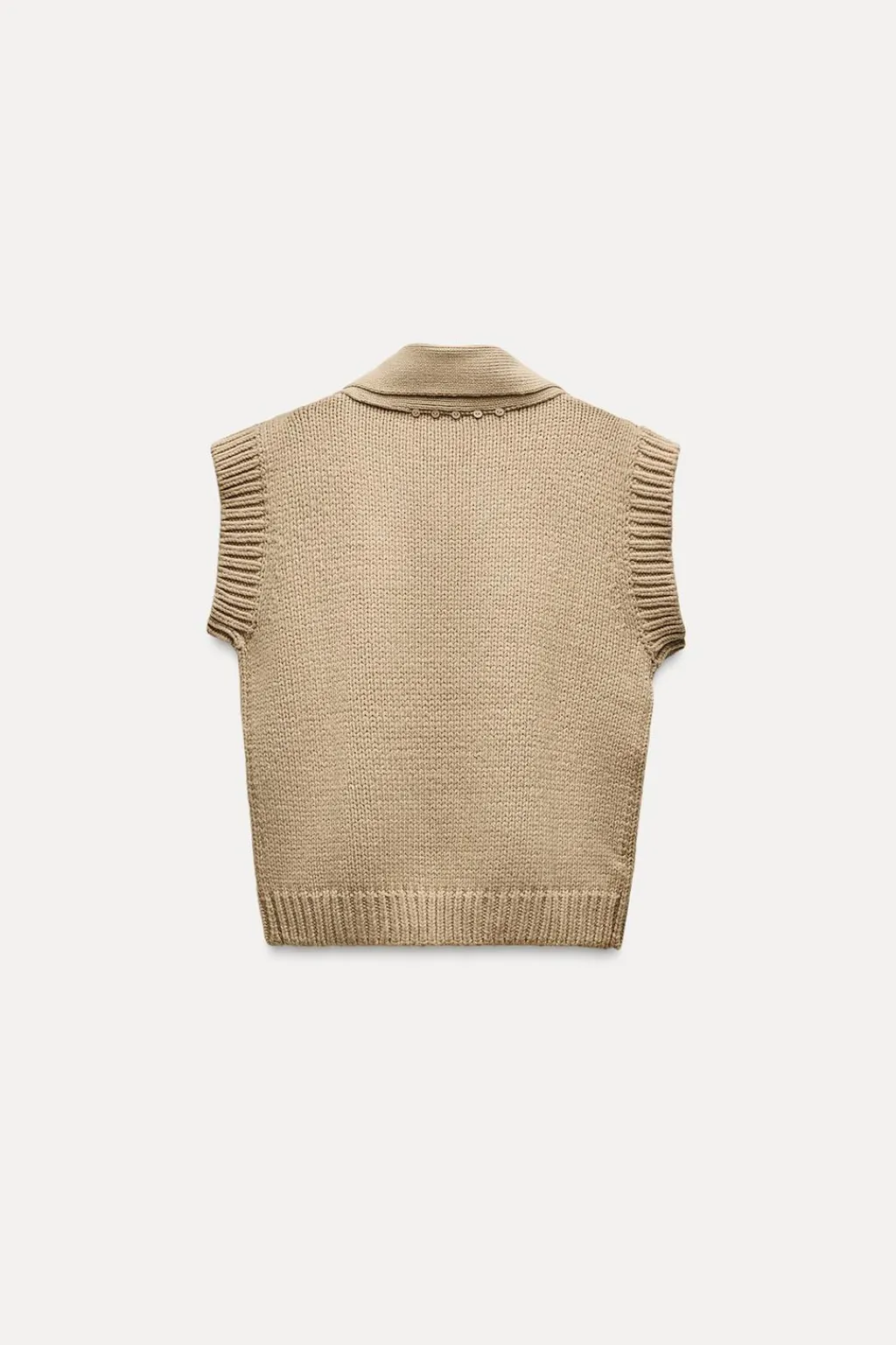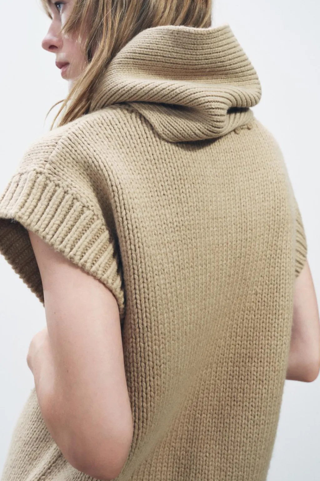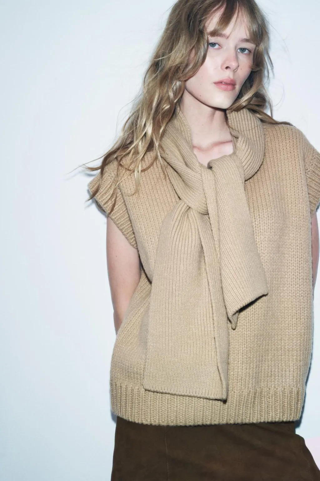 Jersey chaleco de cuello pico con bufanda y manga sisa. Acabados en rib.