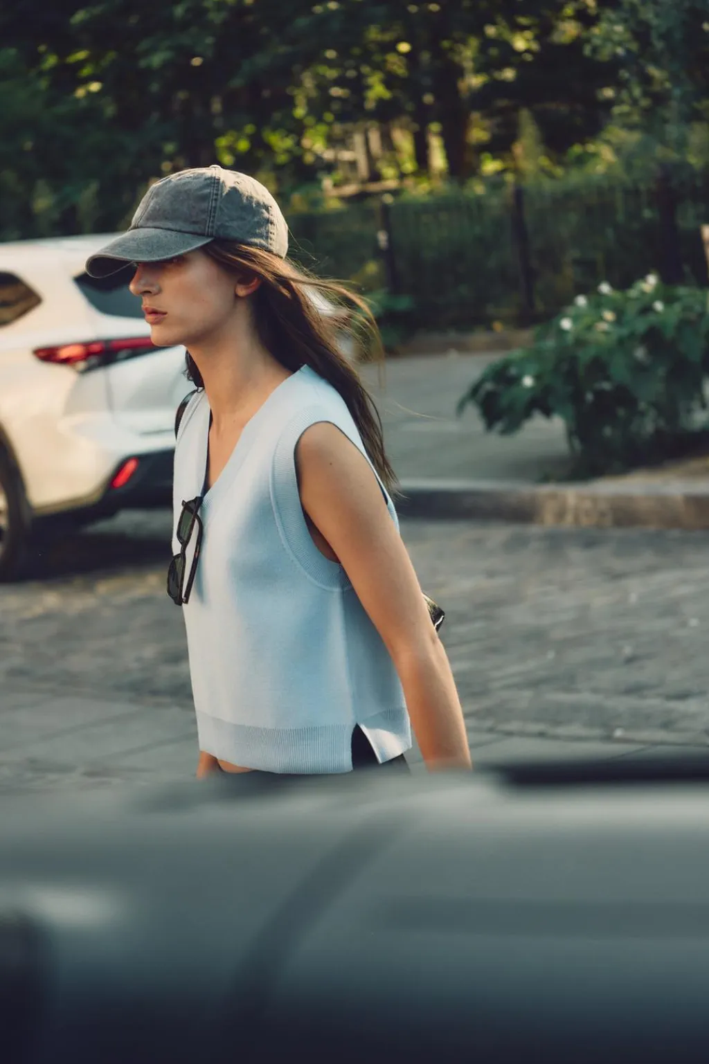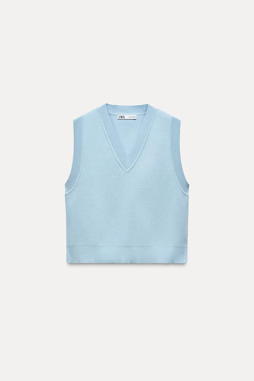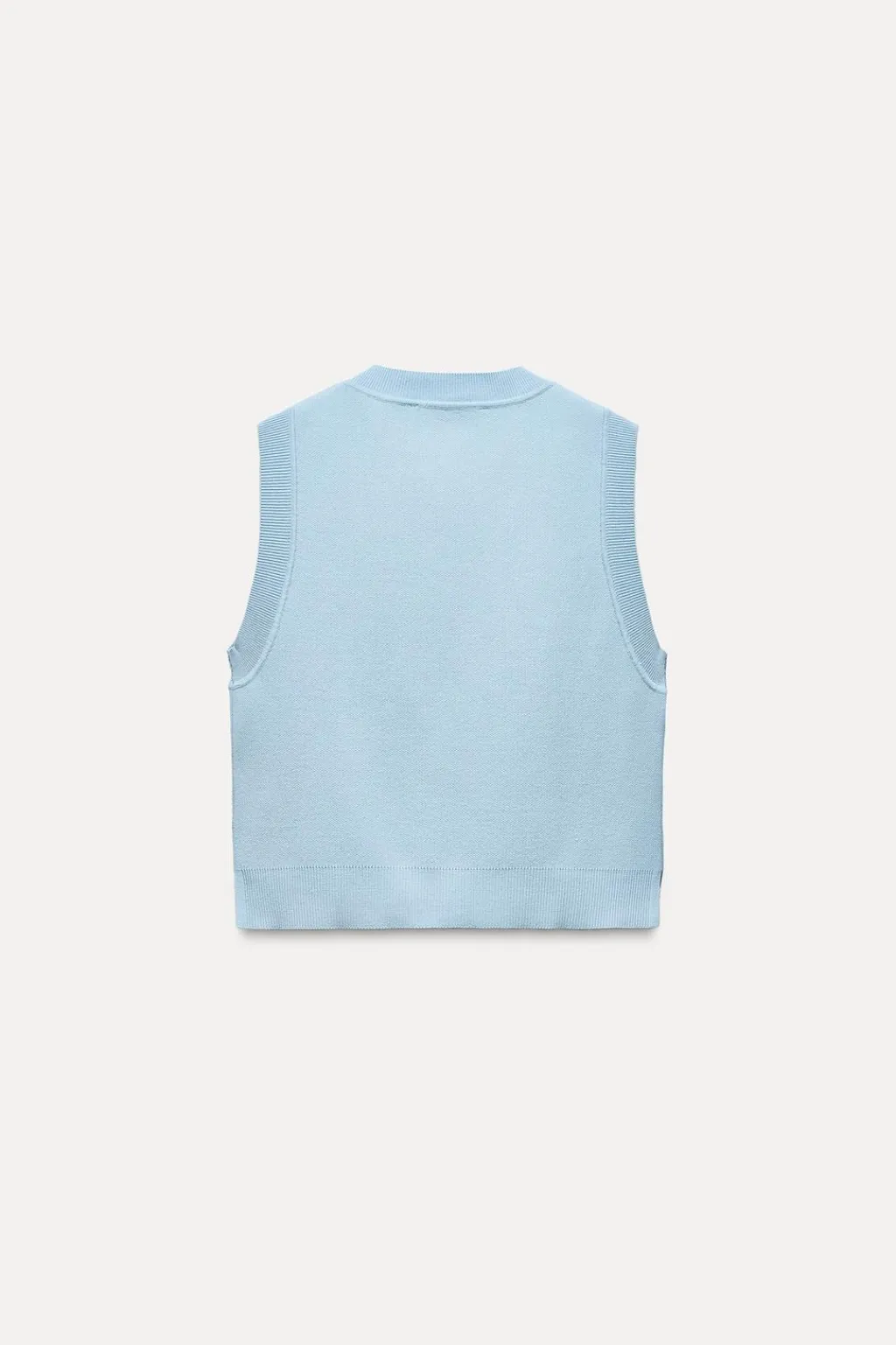 Jersey chaleco de escote pico y manga sisa. Acabados en rib. Bajo con aberturas laterales.