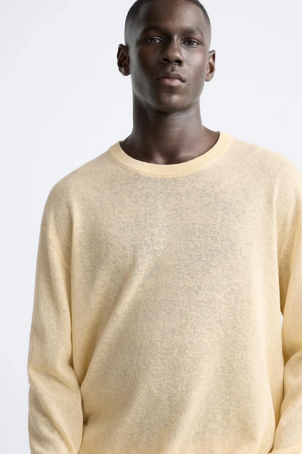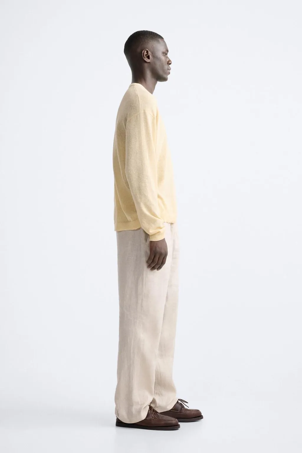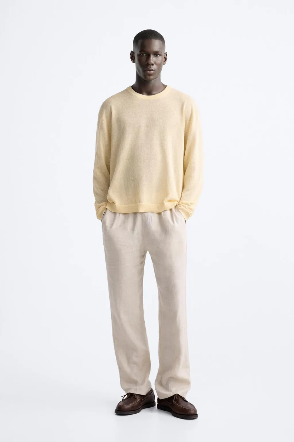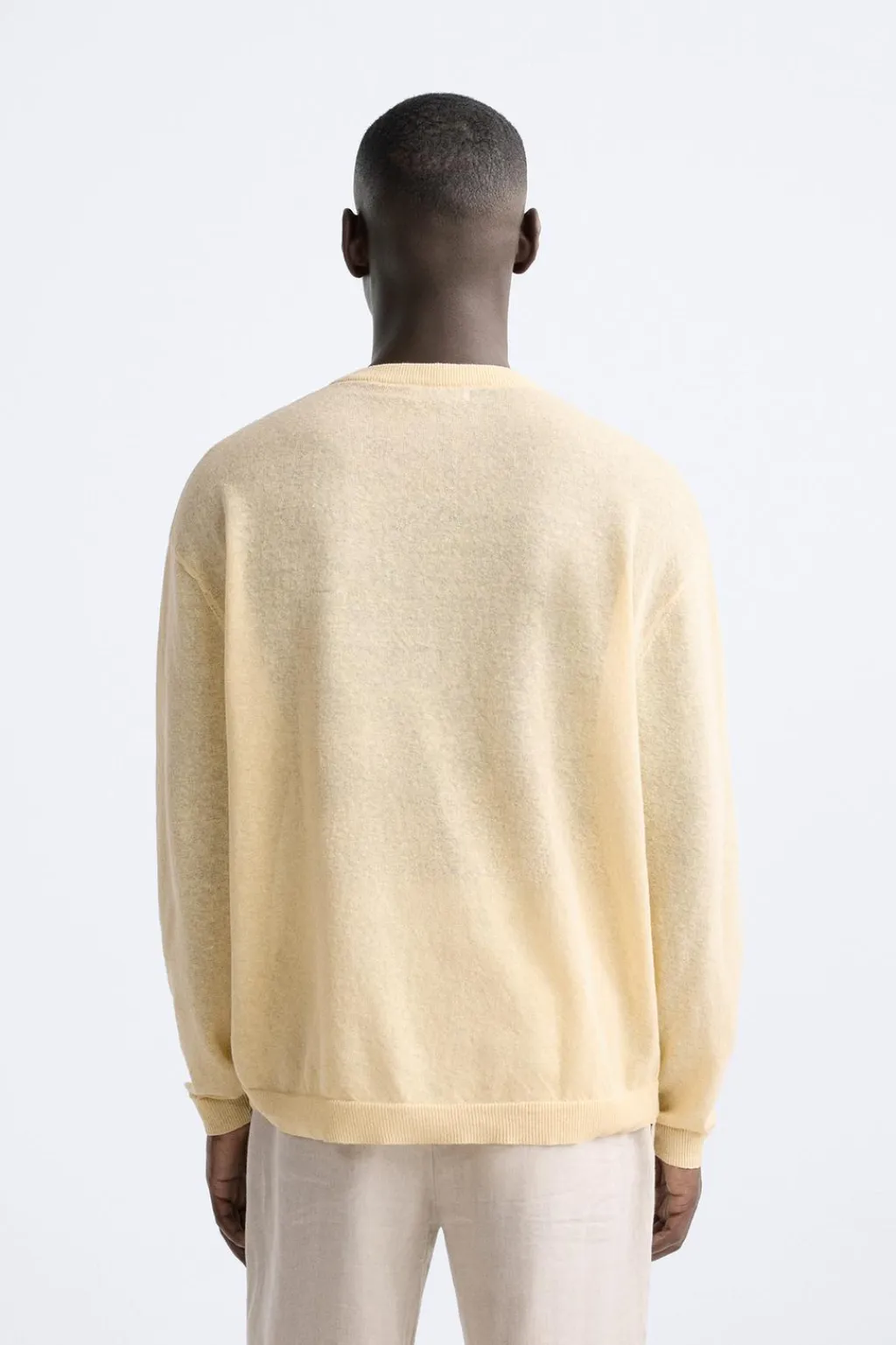 Jersey tejido en hilatura con mezcla de lino. Cuello redondo y manga larga. Acabados en rib.