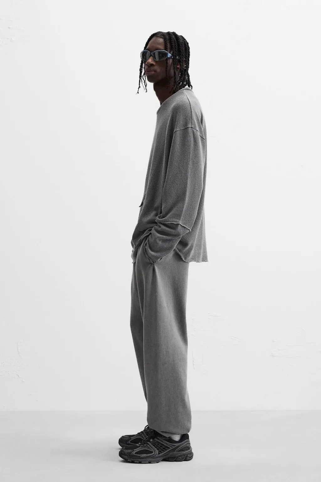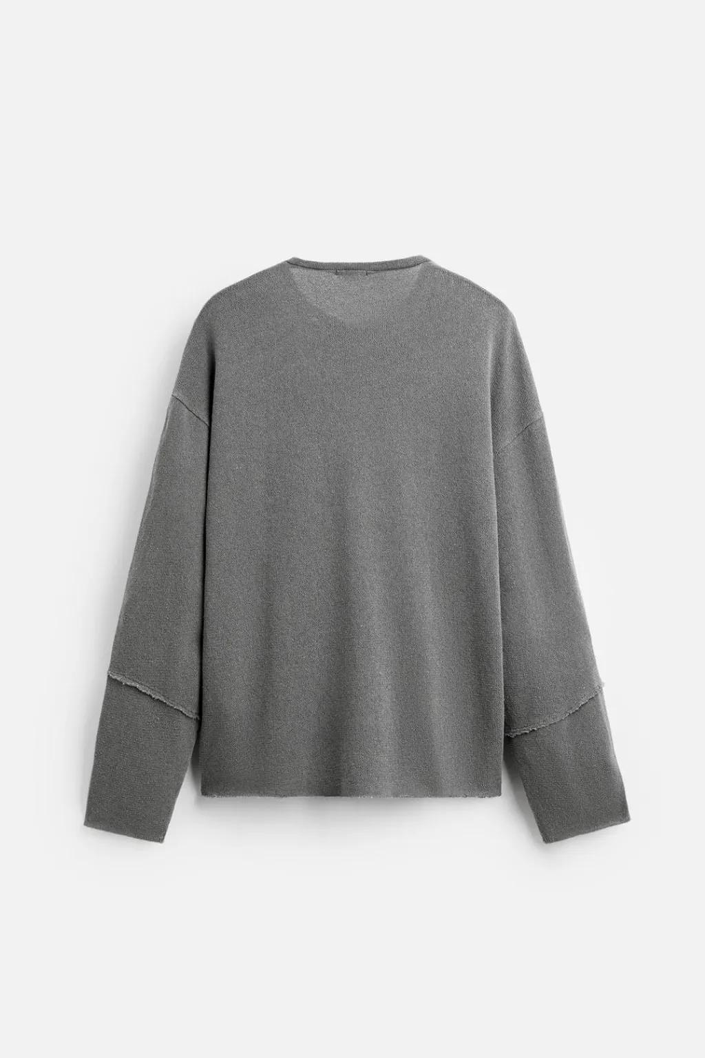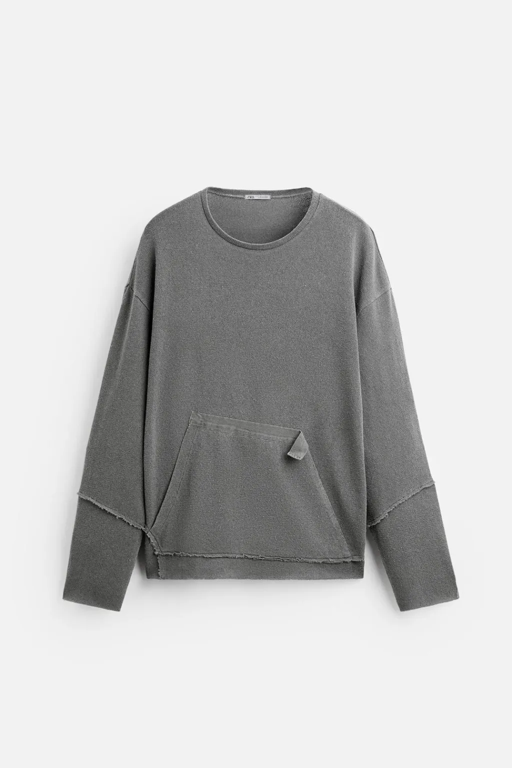 Jersey relaxed fit de punto tejida en hilatura con mezcla de algodón. Cuello redondo y manga larga. Efecto lavado. Bolsillo frontal tipo canguro. Acabados irregulares.