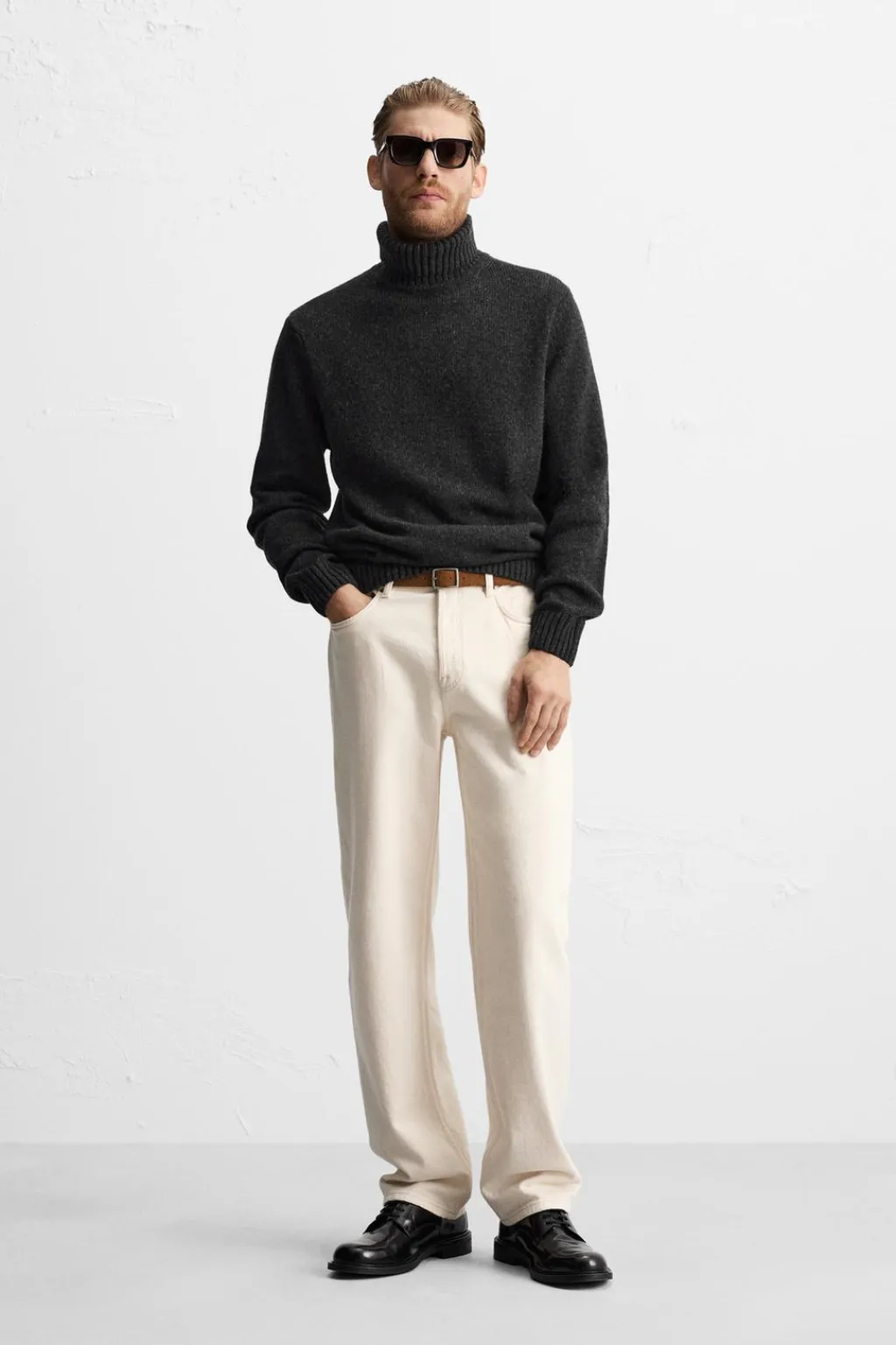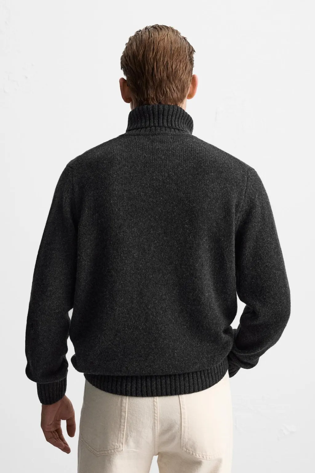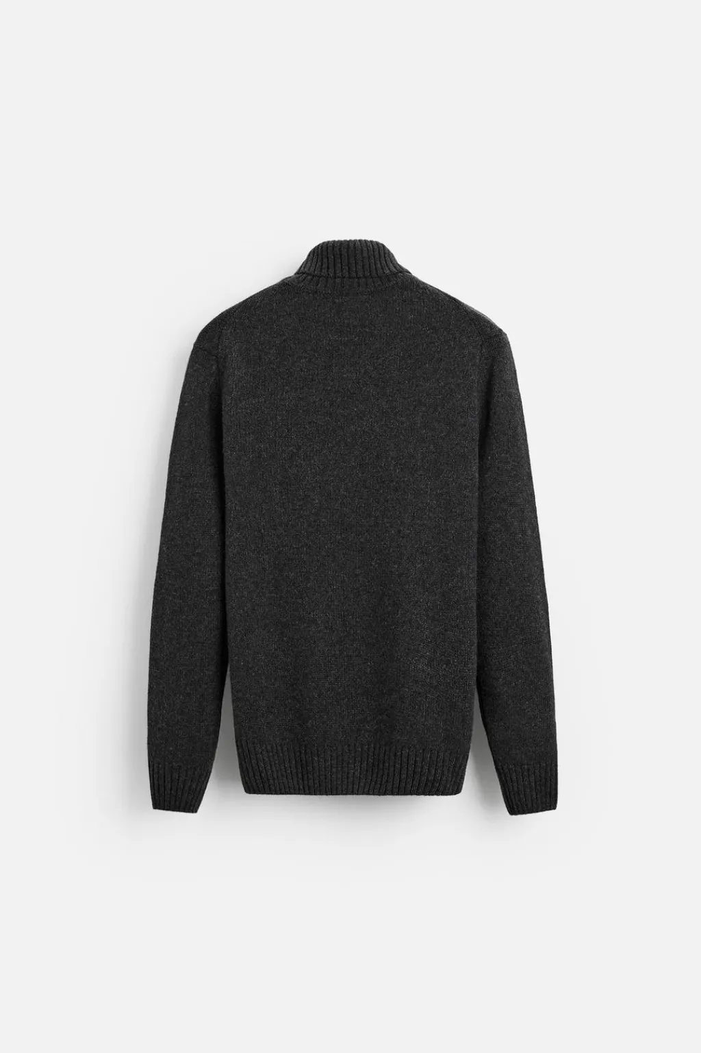 Jersey tejido en hilatura con mezcla de lana. Cuello subido y manga larga. Acabados en rib.
