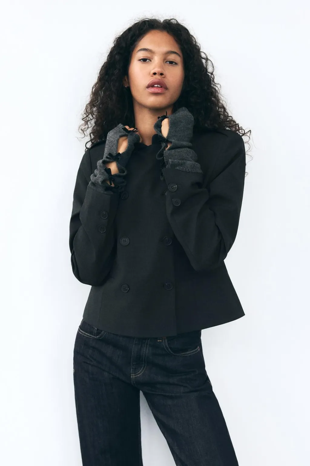 Mitones largos confeccionados en mezcla de tejidos y lana 6%. Detalle de aberturas laterales y aplicación de lazos en terciopelo combinados a contraste.