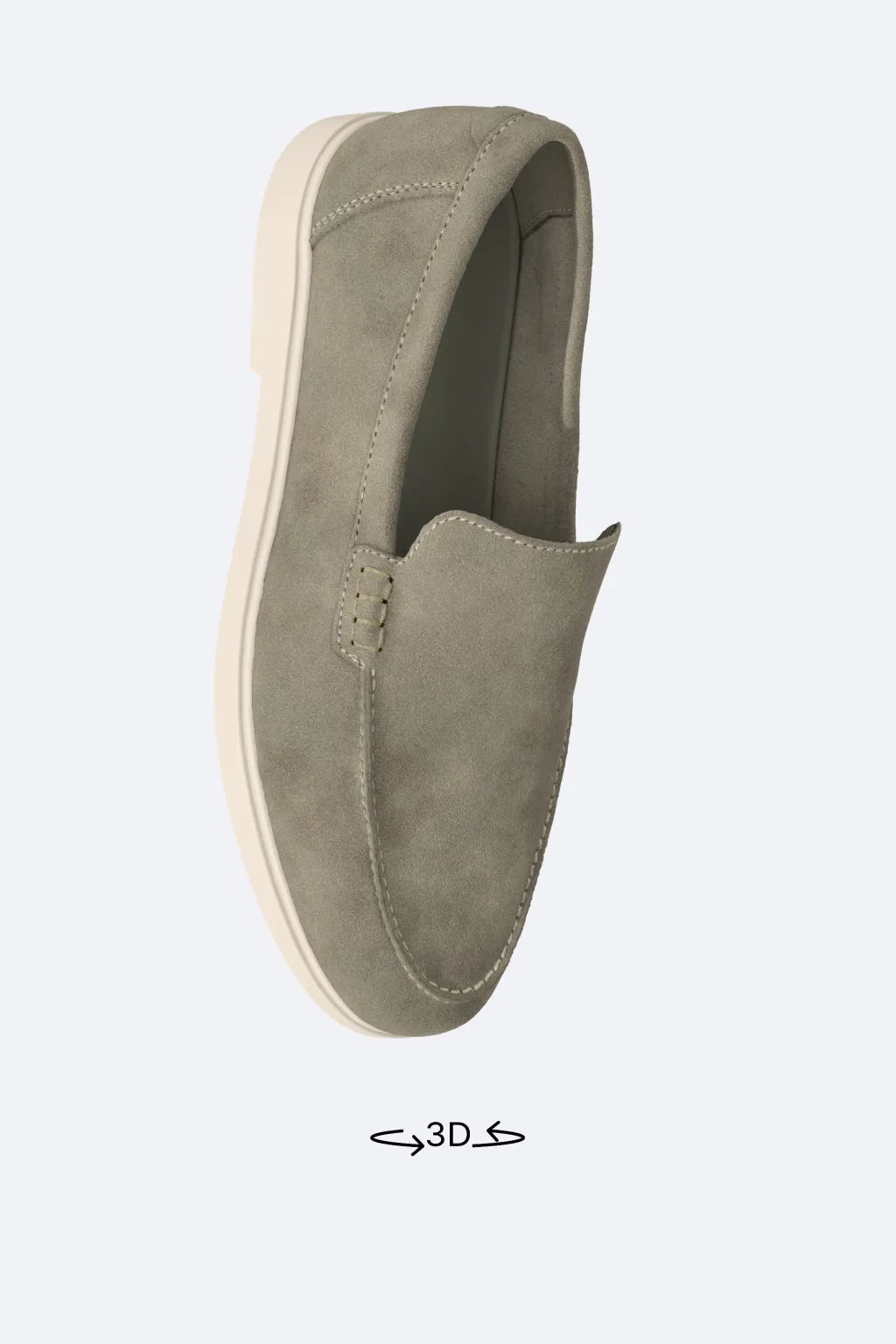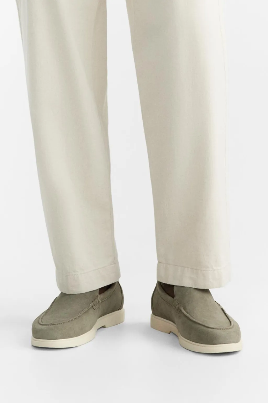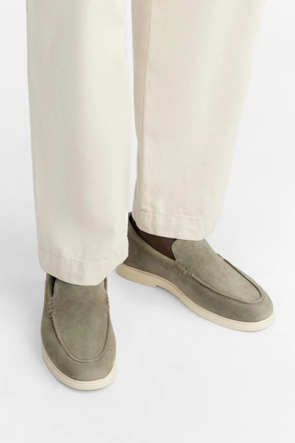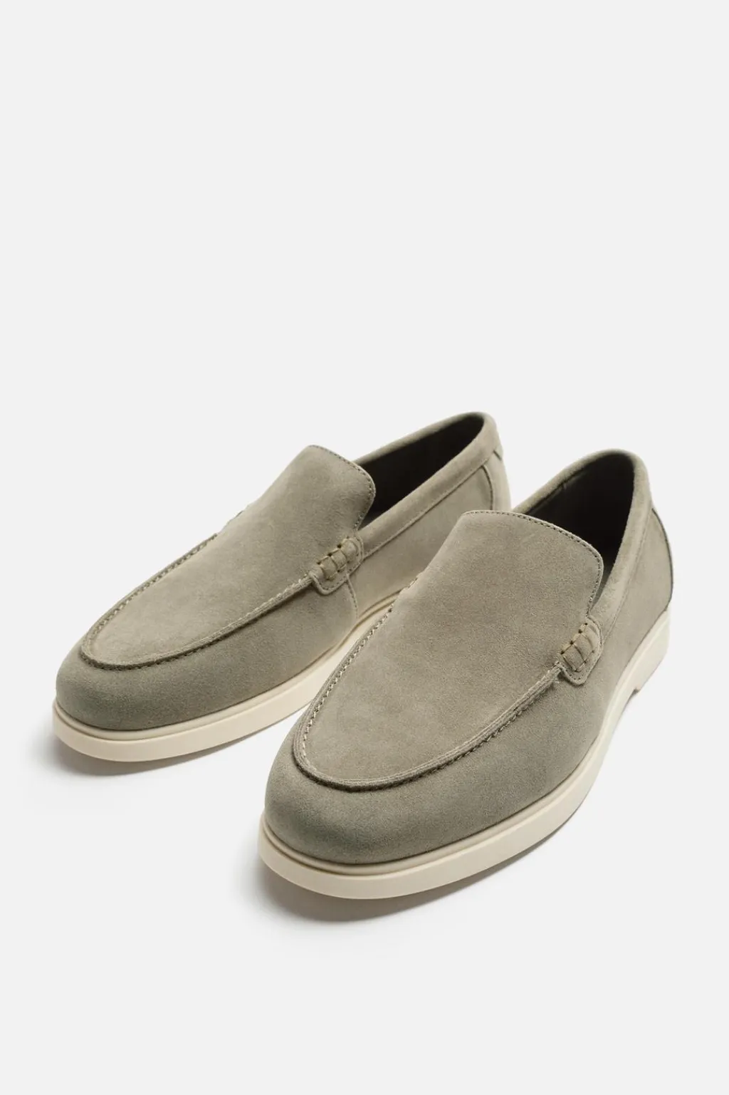 Mocasín casual. Parte superior fabricada en pie con acabado serraje. Corte liso con detalle de bordón. Horma redonda. Suela a contraste.