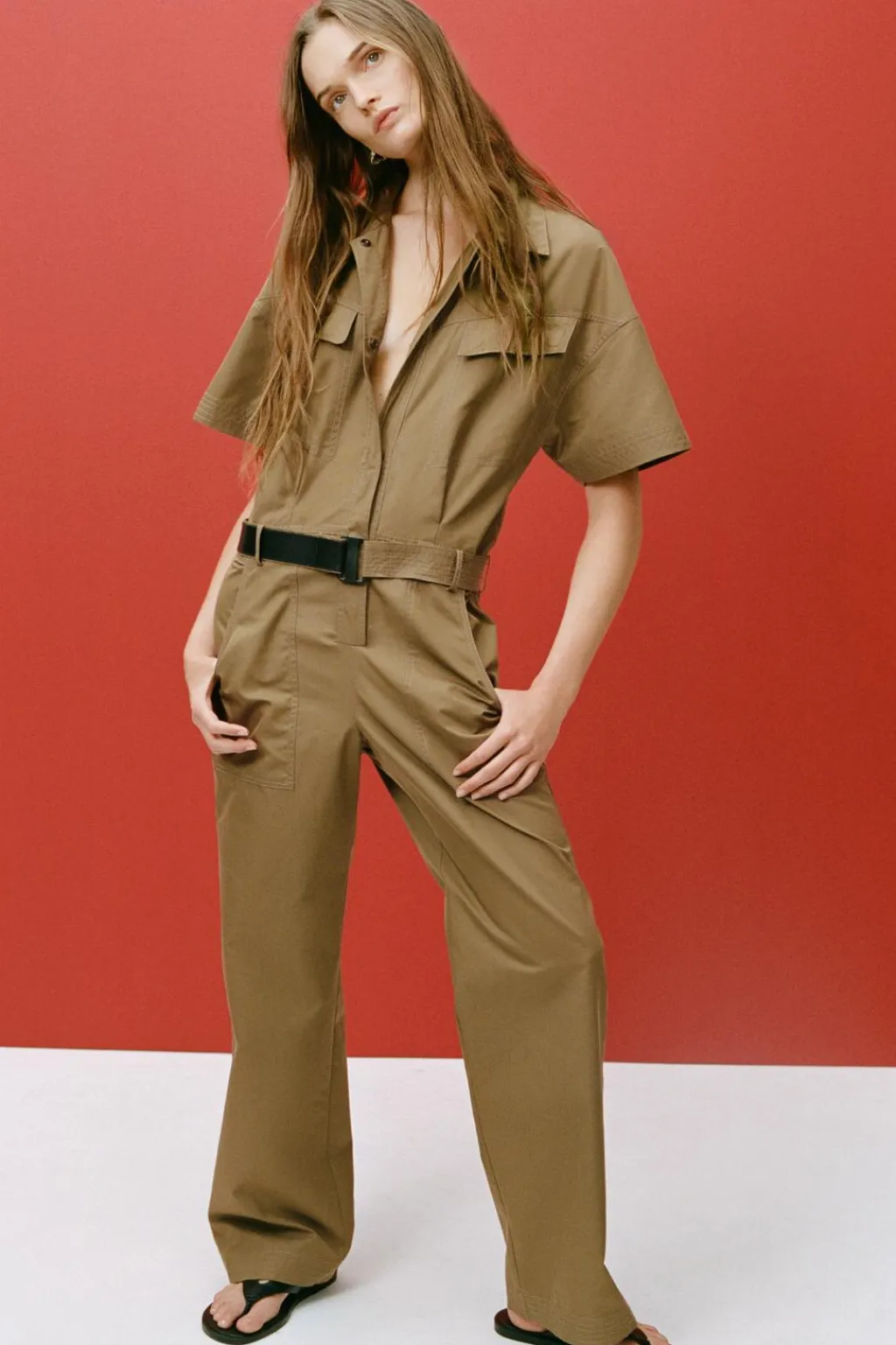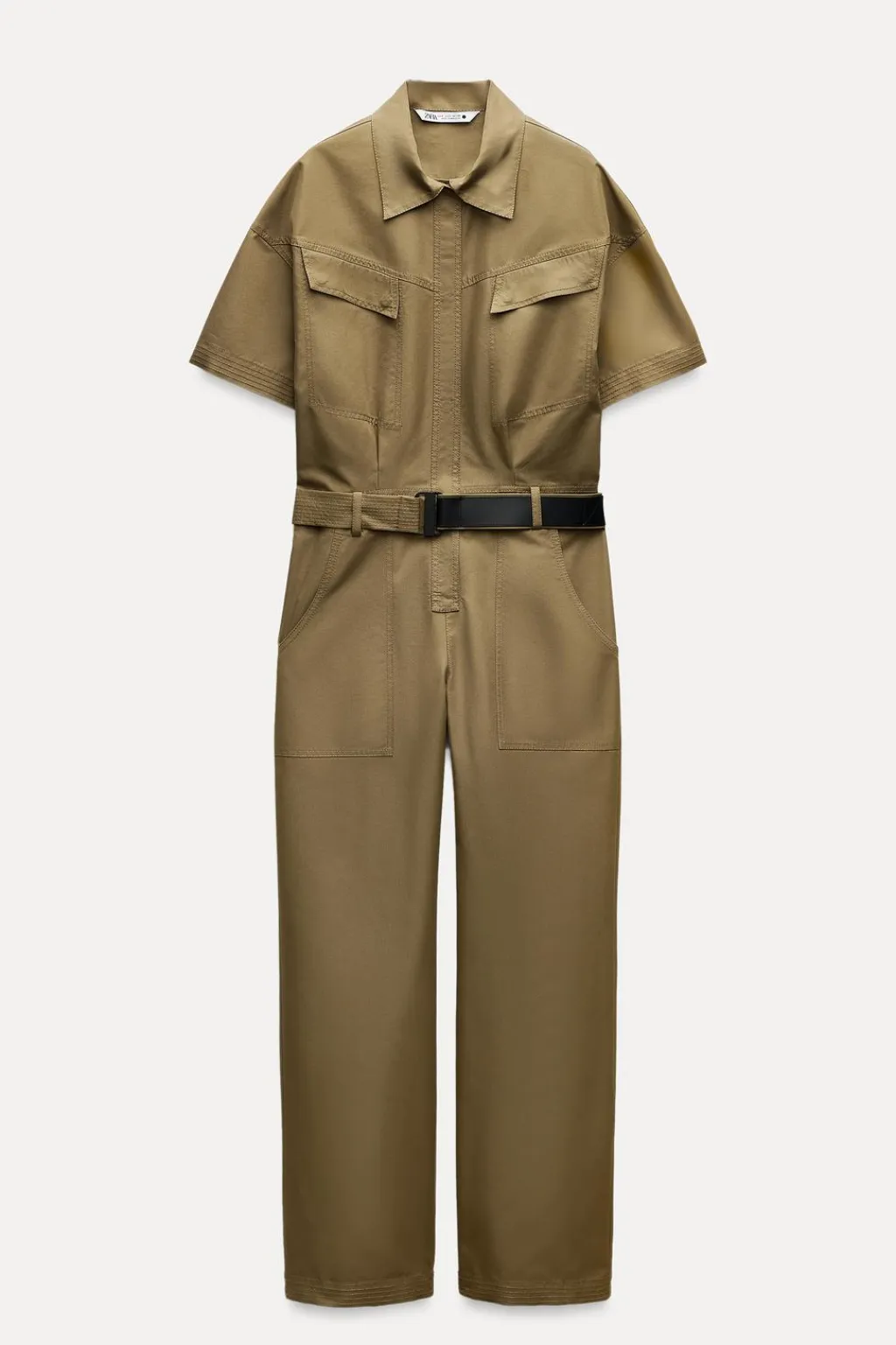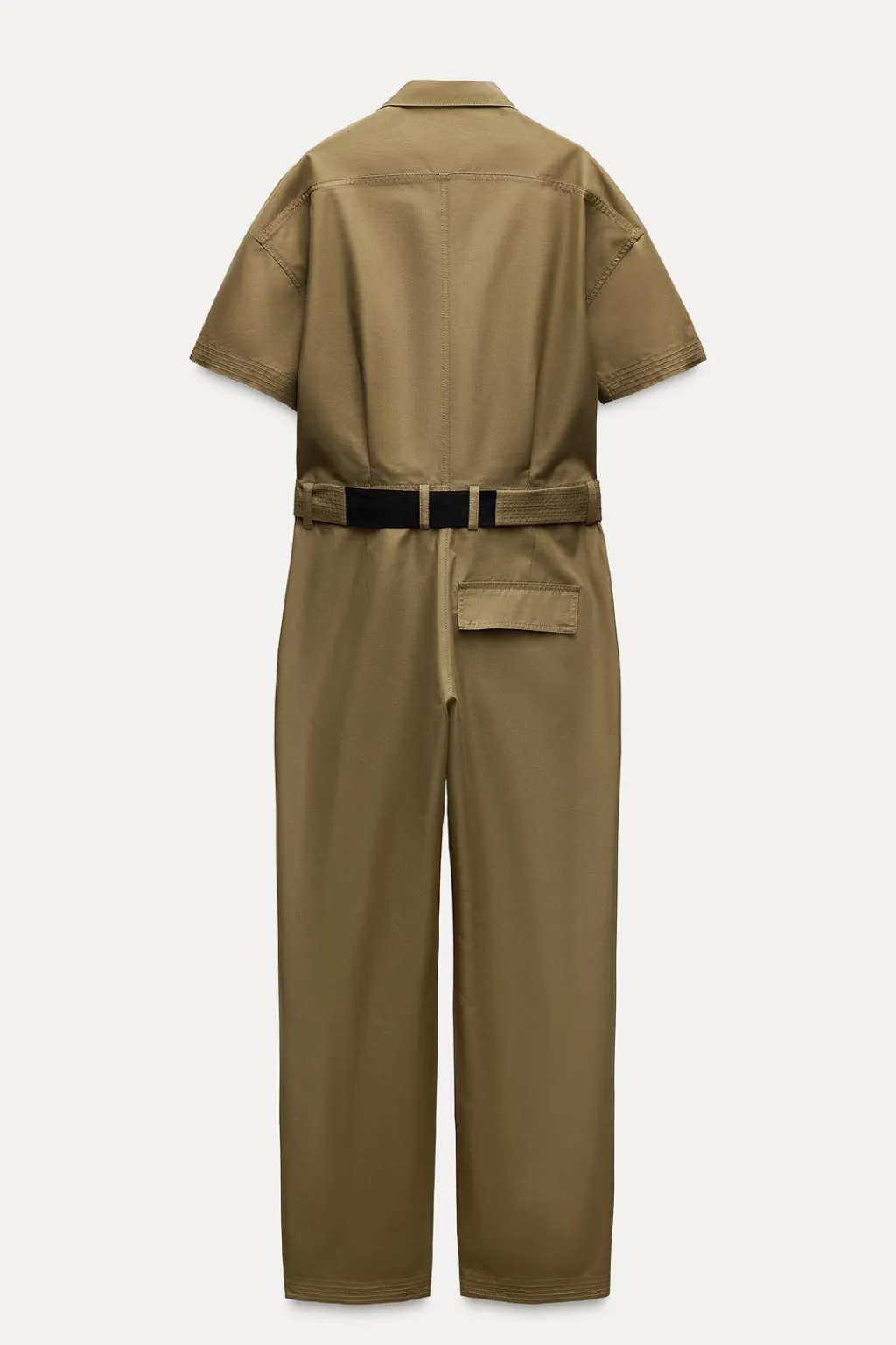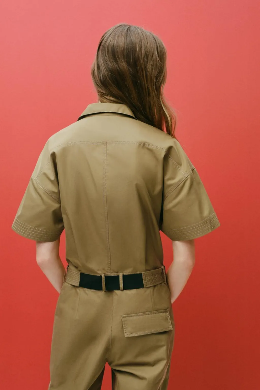 Mono largo de cuello solapa y manga corta. Bolsillos de plastrón en delantero y espalda. Cinturón combinado en tejido a contraste con cierre metálico con imanes. Costuras combinadas a tono. Cierre frontal con botones a presión ocultos por sopata.