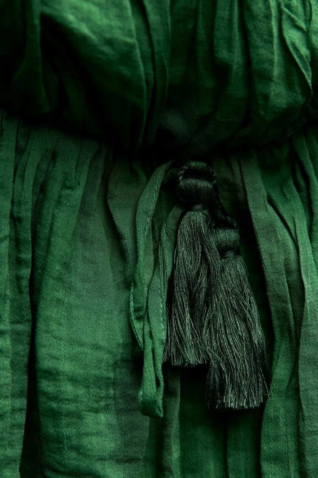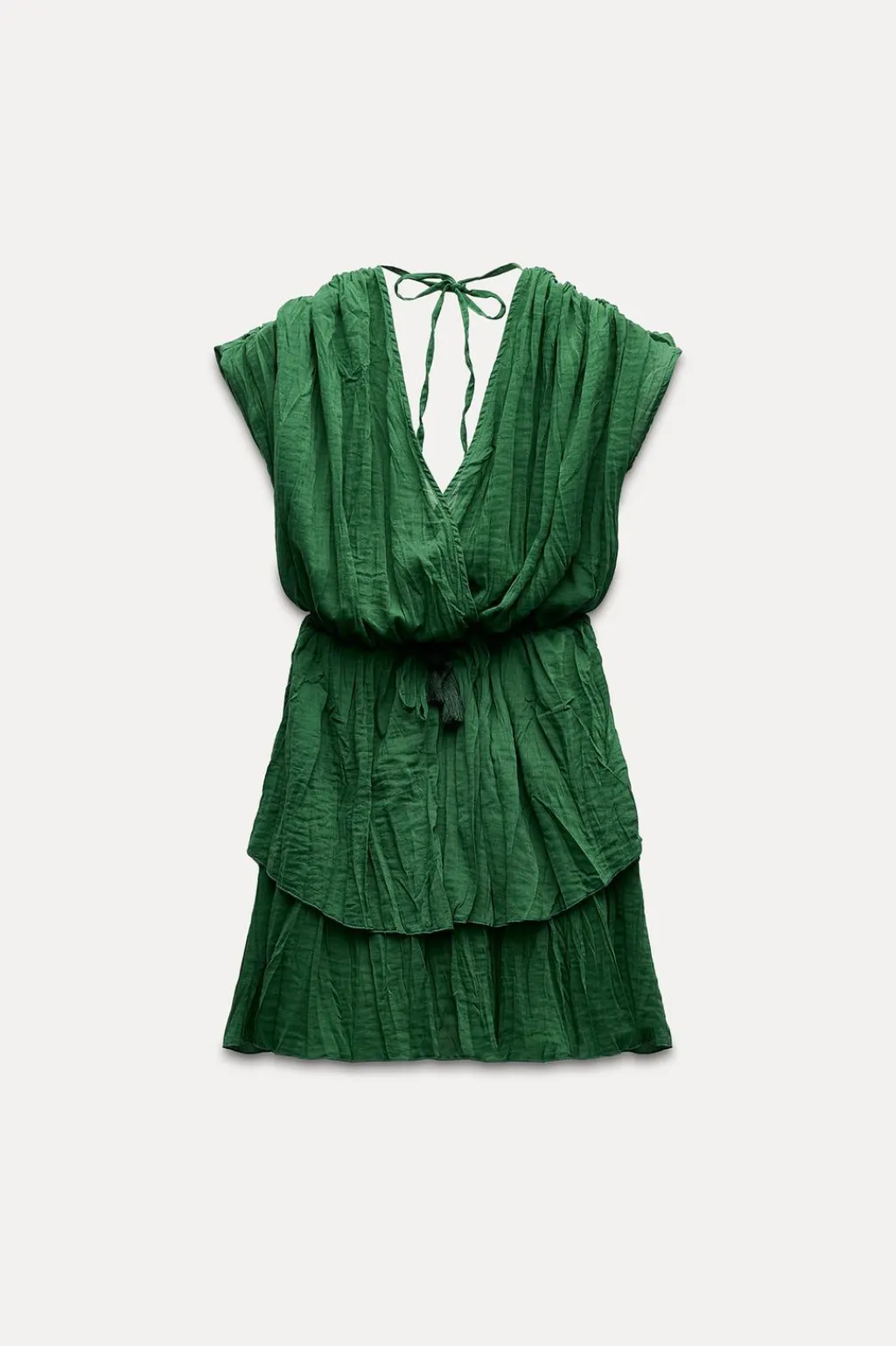 Mono de escote pico en delantero y espalda. Manga corta con frunces en hombros. Cintura elástica con borlas delanteras. Forro interior. Bajo acabado con volantes. Detalle de tejido efecto arrugado.