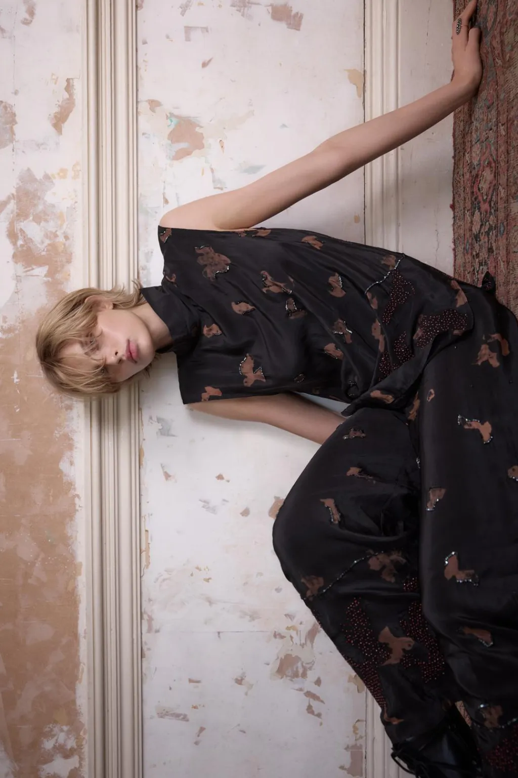Pantalón confeccionado en hilatura de viscosa 100%. Tiro alto y cintura elástica. Detalle de bordados combinados a tono y aplicación de abalorios a contraste. Pierna ancha.