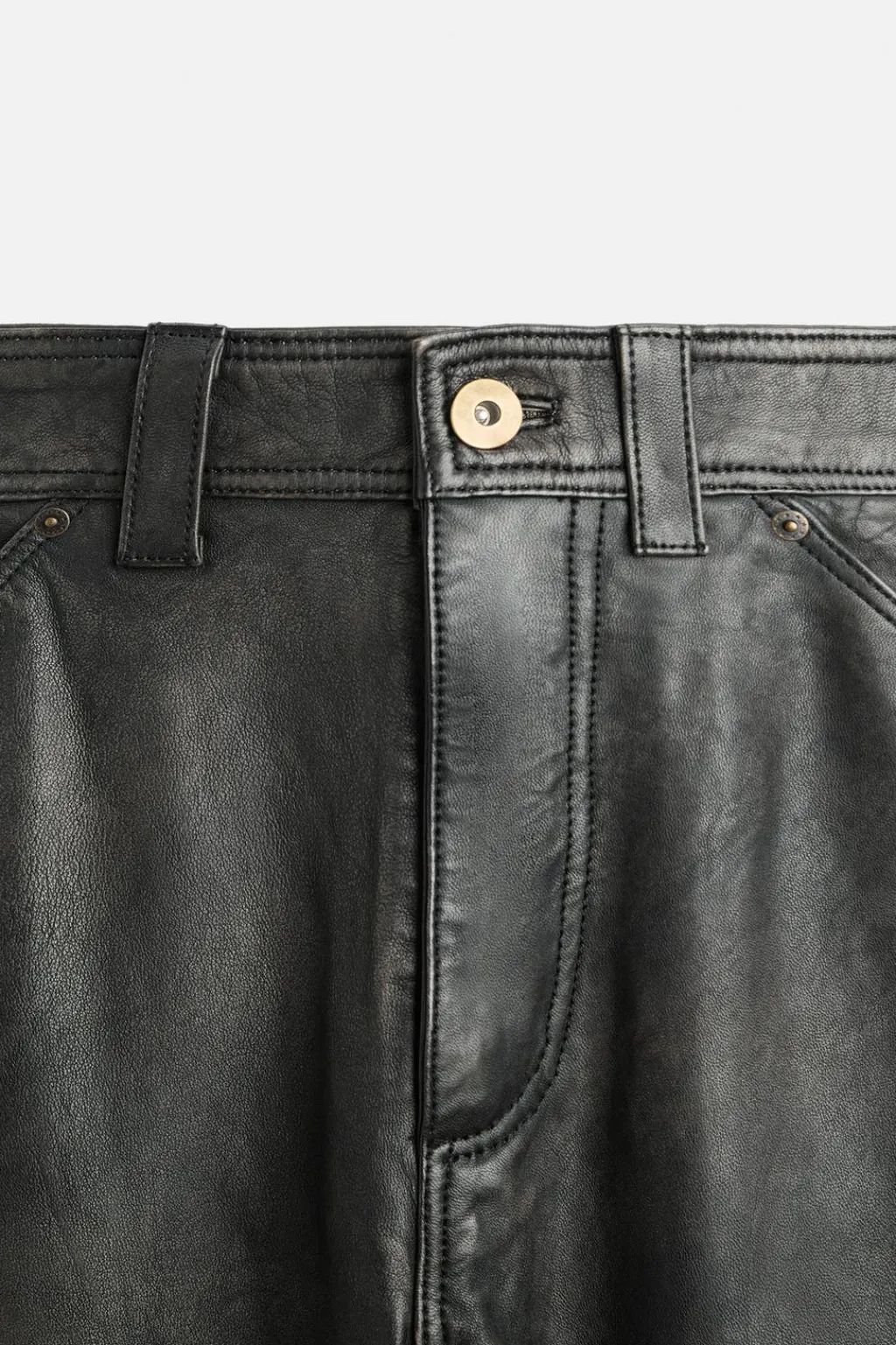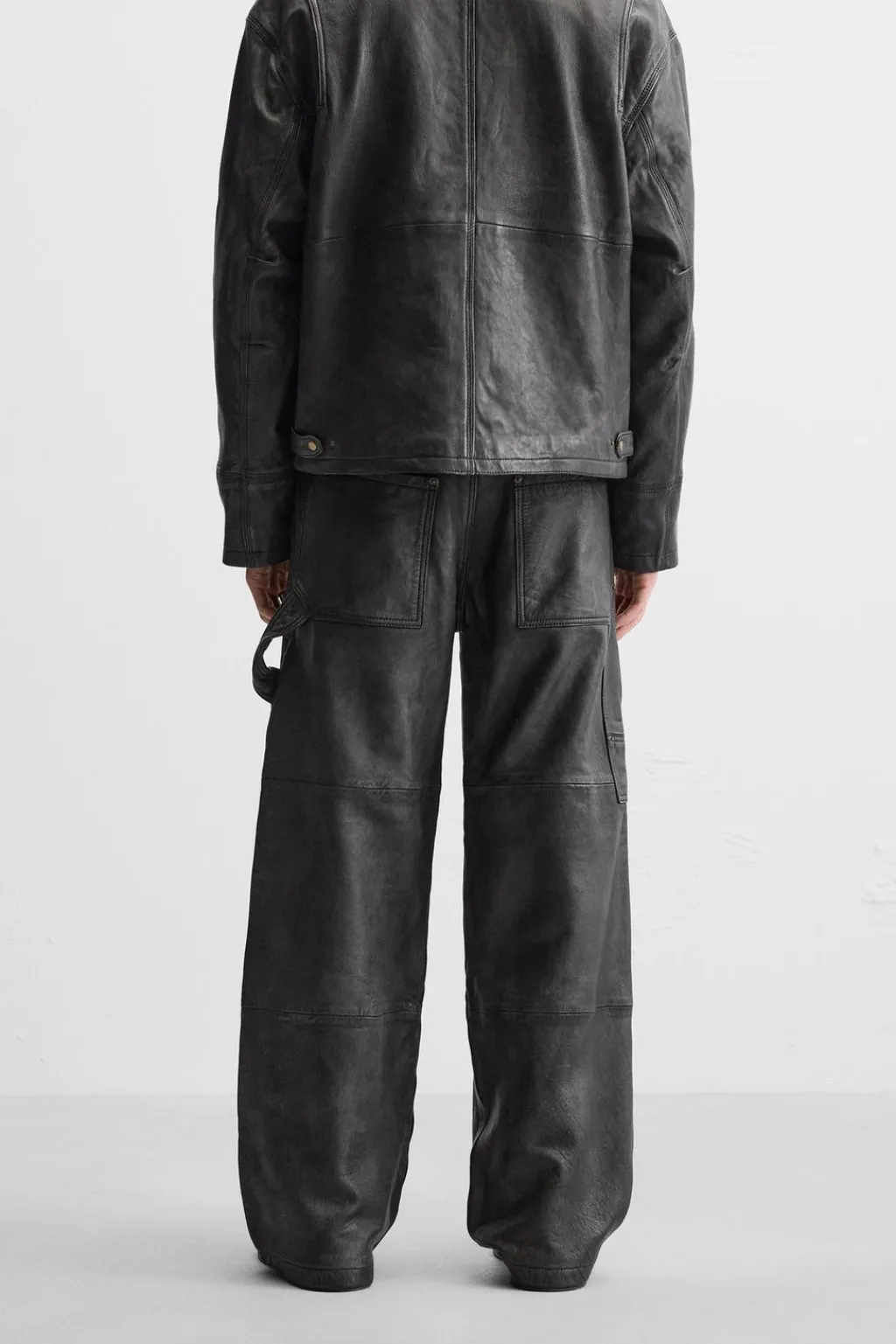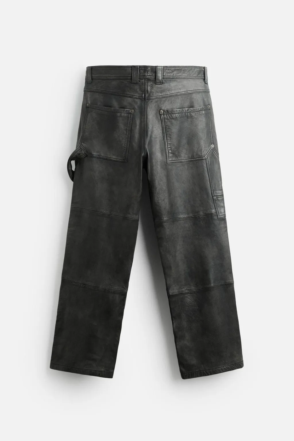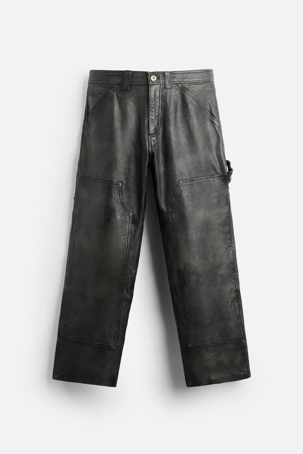 Pantalón relaxed fit confeccionado en piel con efecto lavado. Bolsillos frontales y detalle de bolsillos traseros de plastrón. Aplicación de bolsillos plastrón y tira multifunción en perneras. Cierre frontal con cremallera y botón.