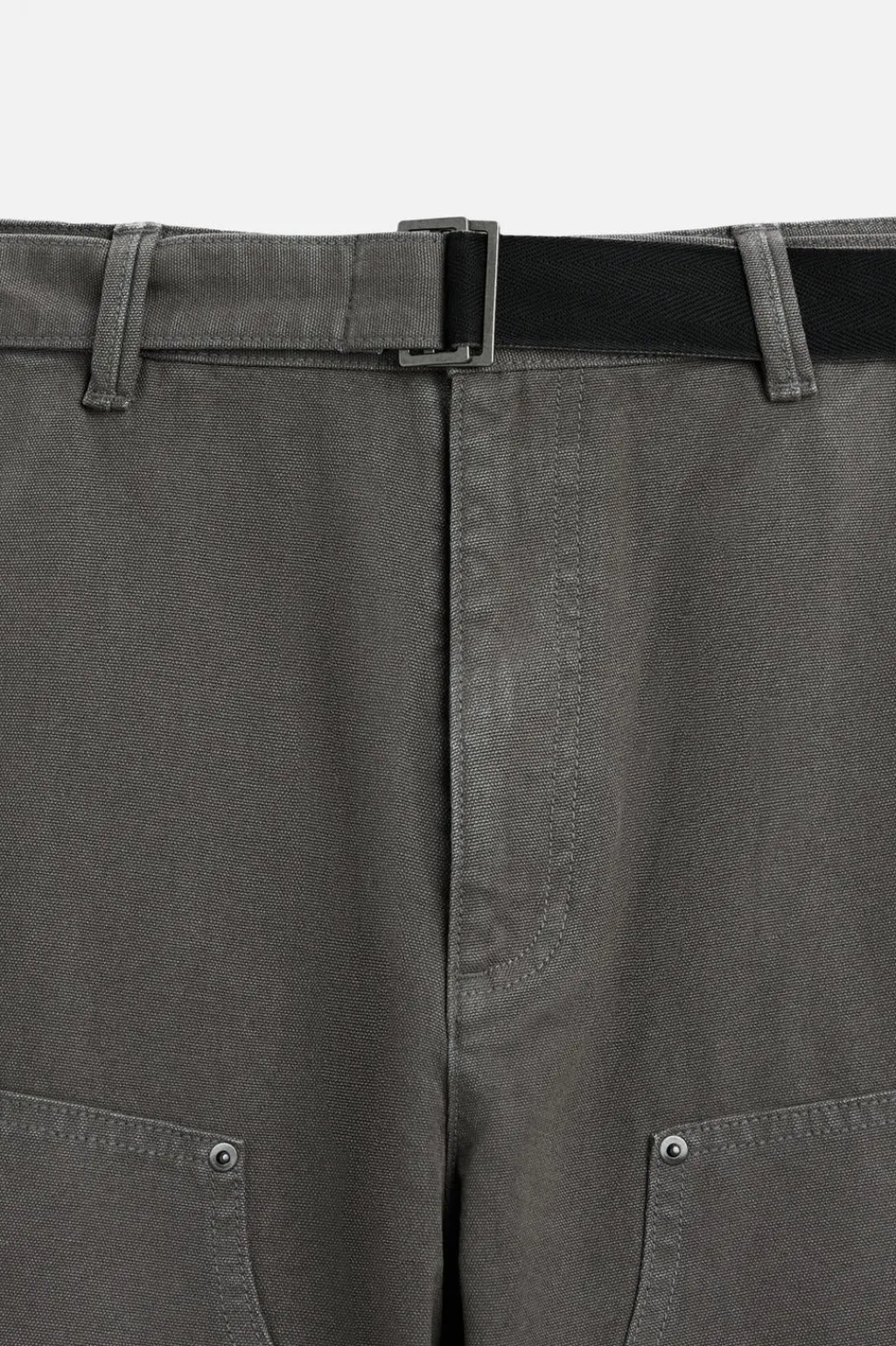 Pantalón relaxed fit. Cintura ajustable con detalle de cinturón en el mismo tejido. Cinco bolsillos. Aplicación de bolsillos plastrón y tira multifunción en perneras. Cierre frontal con cremallera y botón.