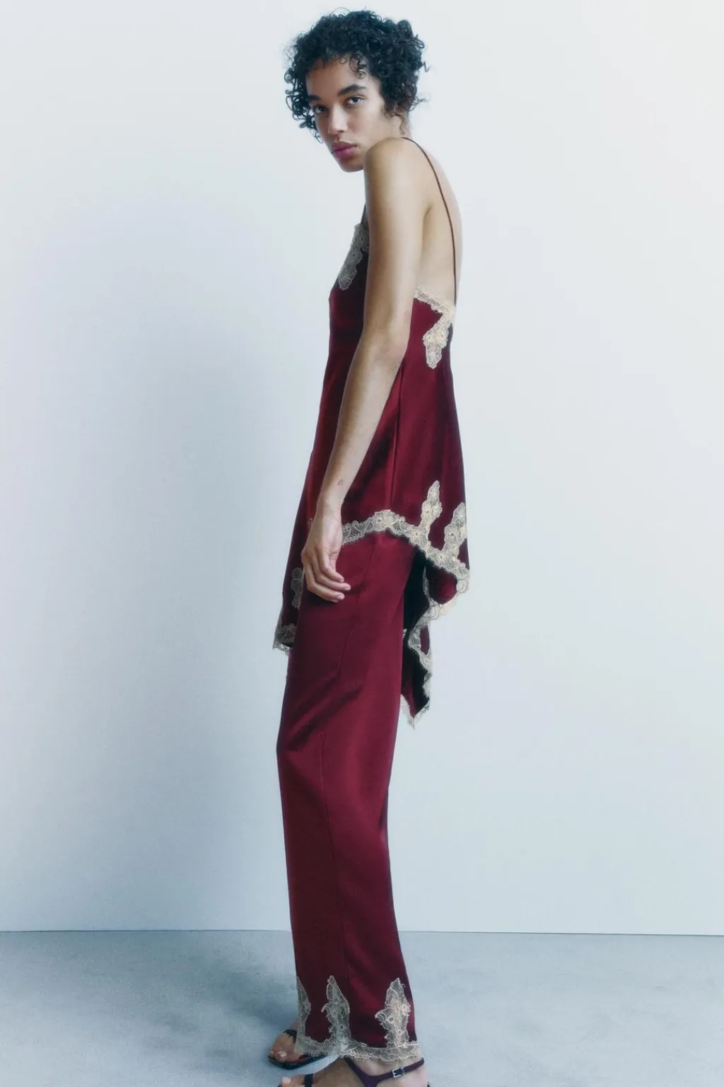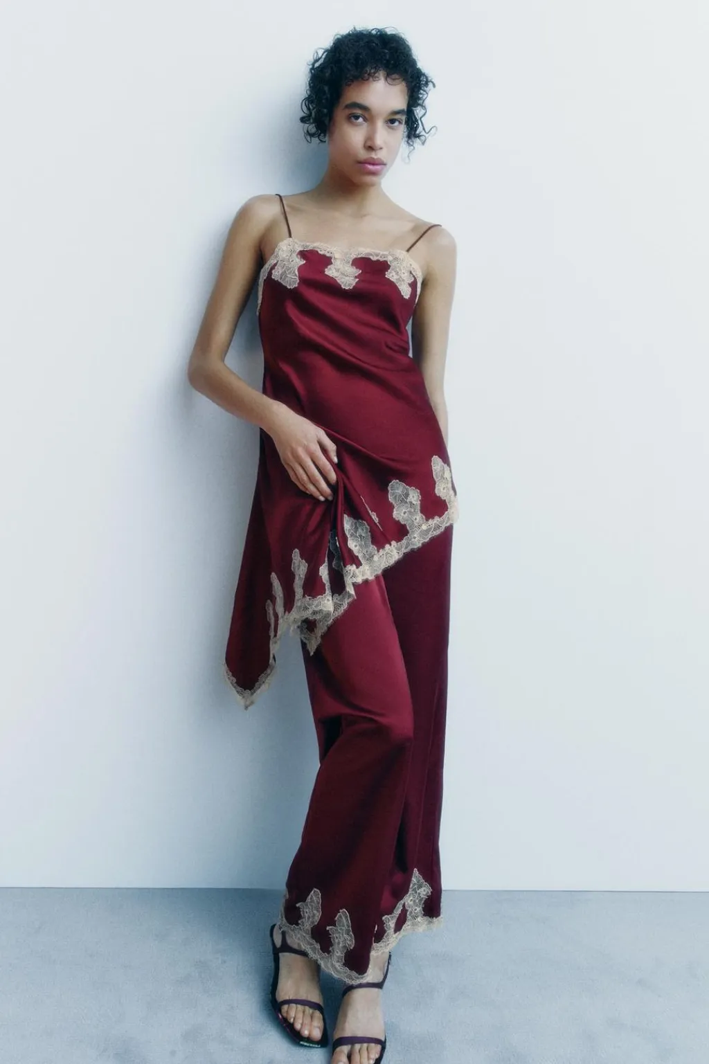 Pantalón satinado de tiro medio y cintura elástica. Detalle aplicación de encaje combinado a contraste. Pierna recta.