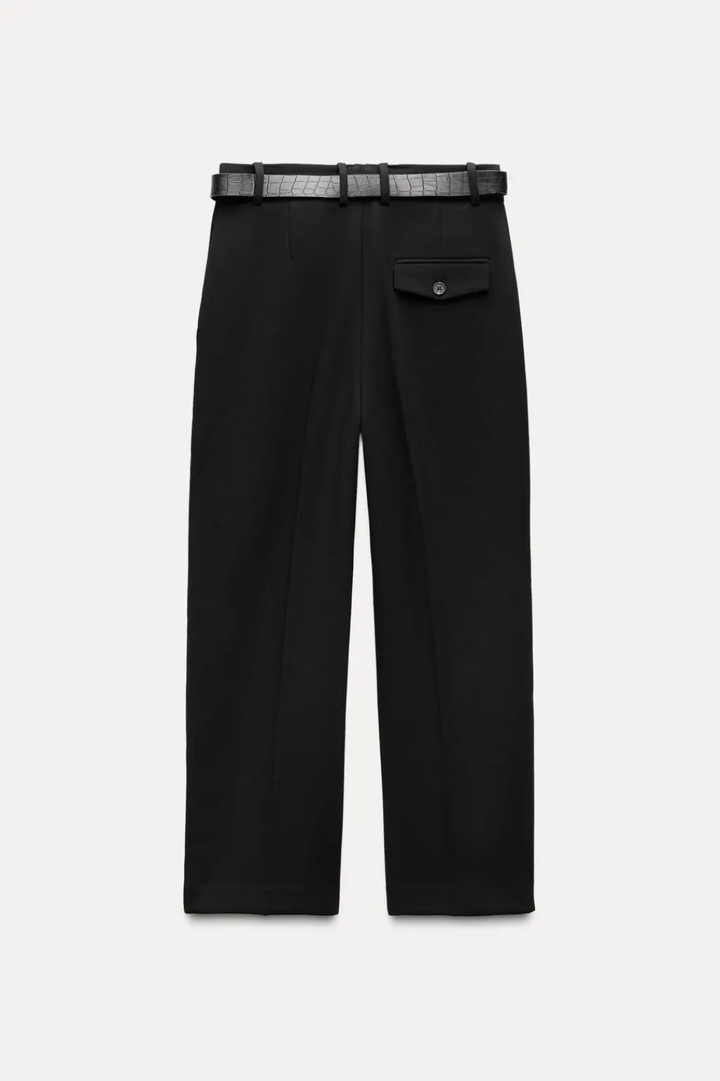 Pantalón de tiro alto con pinzas delanteras y cinturón grabado. Bolsillos delanteros y falso bolsillo con solapa en espalda. Detalle de cinturón. Pernera recta. Cierre frontal con cremallera, botón interior y gancho.