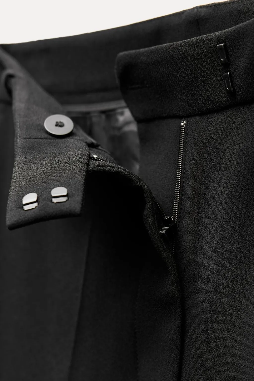 Pantalón de tiro alto y cintura con trabillas. Bolsillos laterales y de vivo en espalda. Pierna recta. Cierre frontal con cremallera, botón y ganchos metálicos.