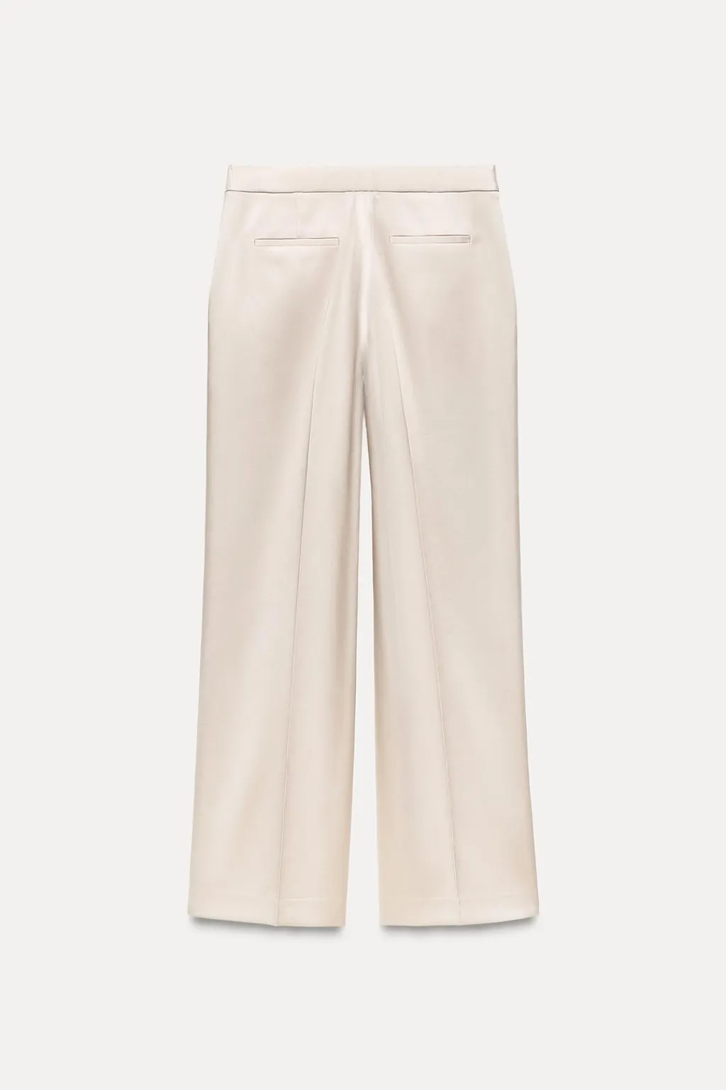 Pantalón de tiro alto confeccionado en tejido satinado. Bolsillos laterales y de vivo en espalda. Cierre frontal con cremallera, botón interior y gancho metálico.