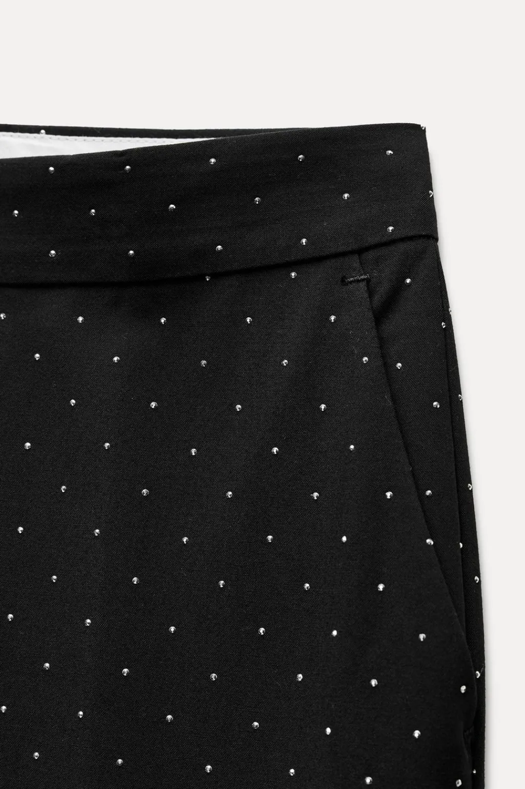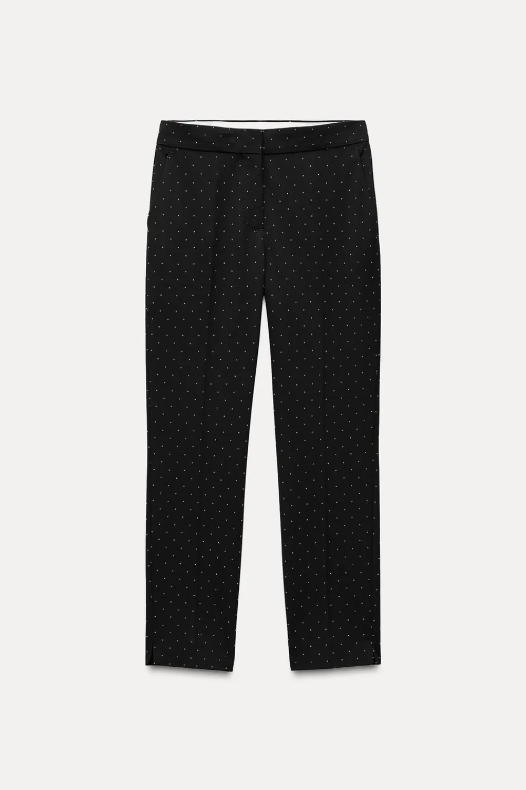 Pantalón de tiro medio con bolsillos delanteros y falsos bolsillos de vivo en espalda. Detalle de brillos. Bajo con aberturas laterales. Cierre frontal con cremallera, botón interior y gancho.