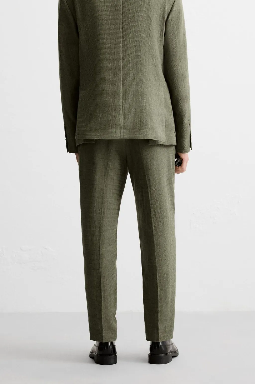 Pantalón slim fit confeccionado en tejido con mezcla de algodón y lino. Bolsillos frontales y detalle de bolsillos traseros de doble vivo. Cierre frontal con cremallera y botón.