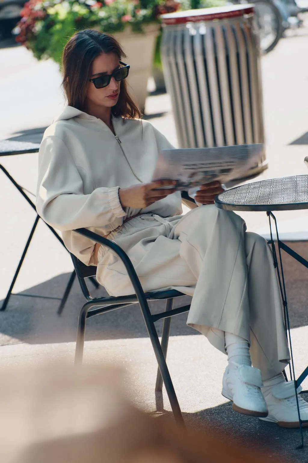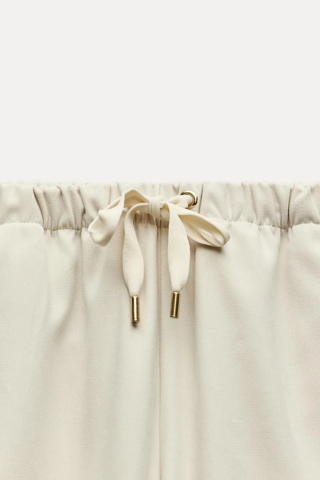 Pantalón de tiro alto con cintura elástica ajustable con cordones. Bolsillos laterales y bolsillos de plastrón en espalda. Pernera ancha.