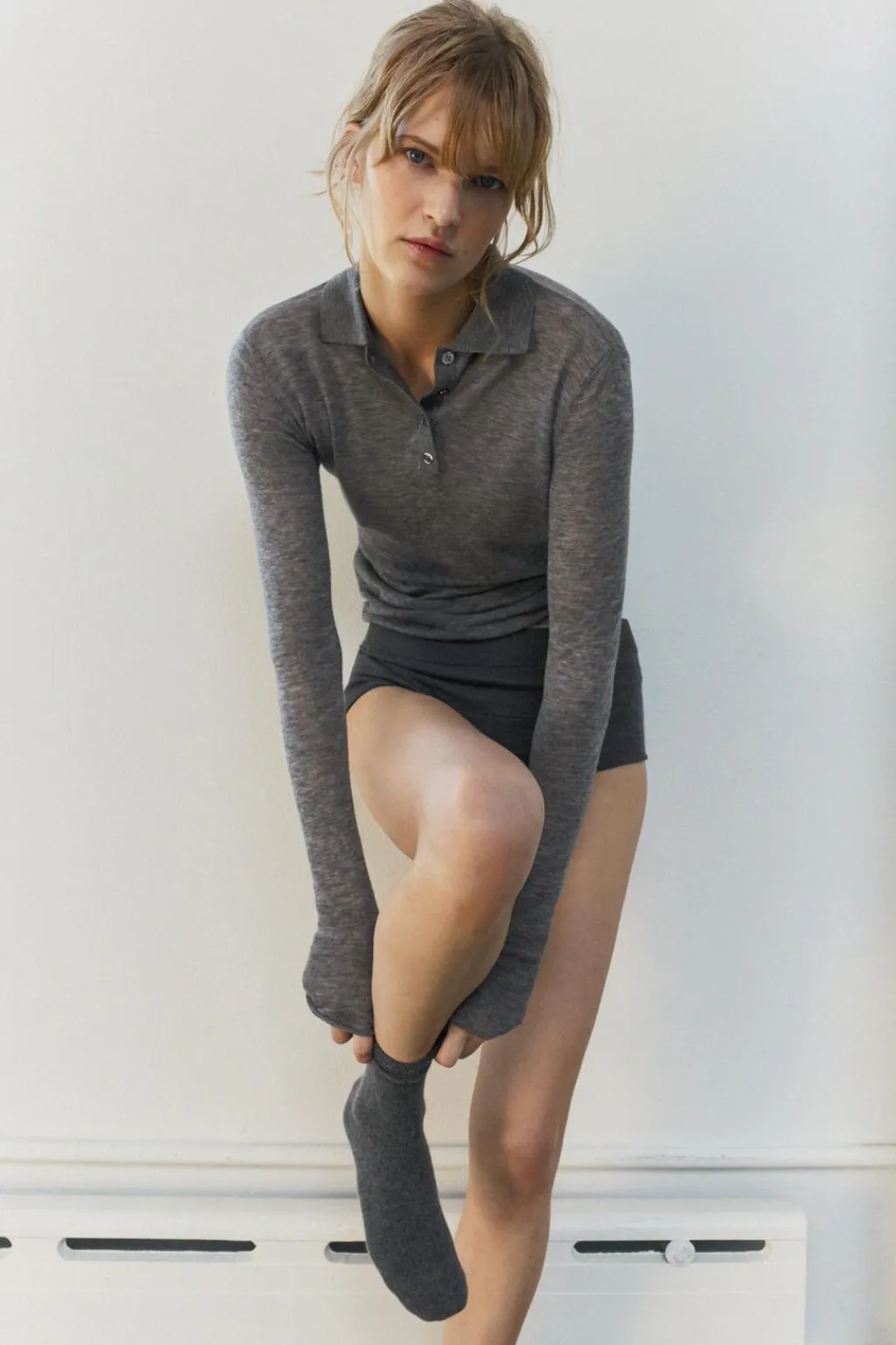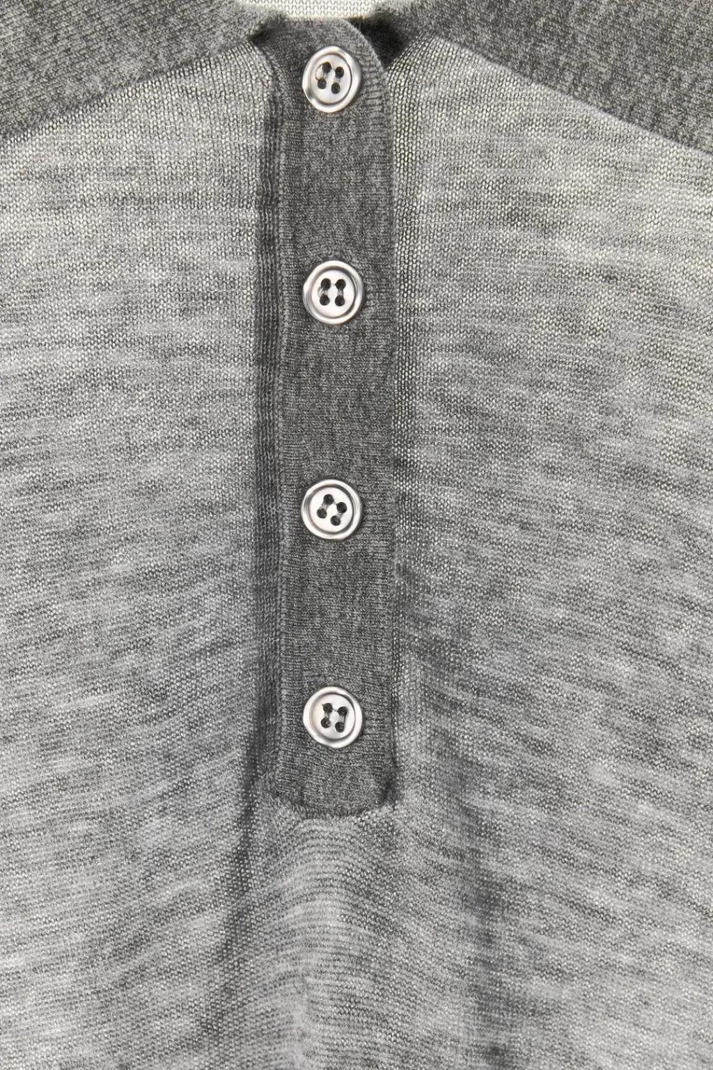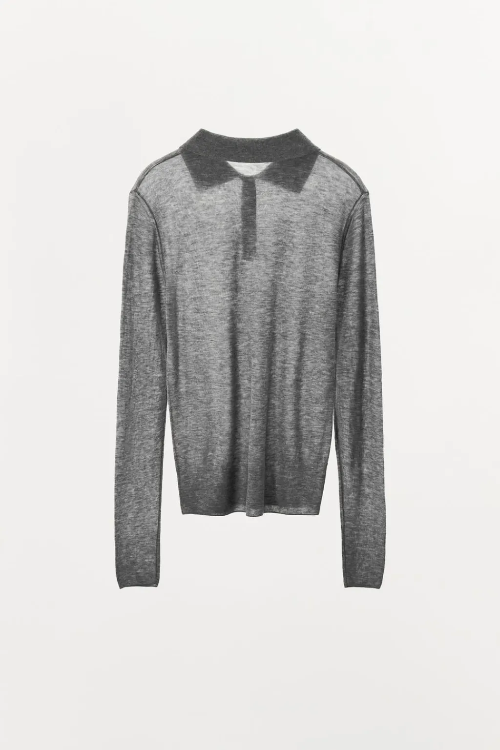 Polo semitransparente confeccionado en hilatura de lana 100%. Cuello solapa y manga larga. Cierre frontal con botones.
