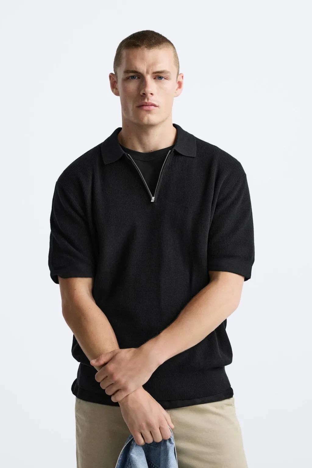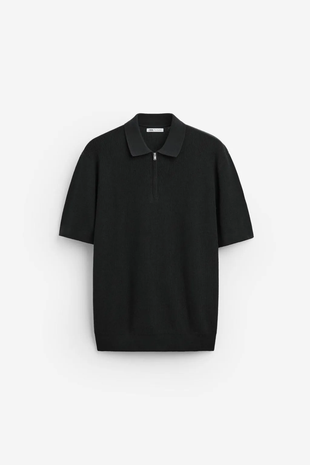 Polo de punto tejido en hilatura de algodón. Cuello solapa con cierre frontal de cremallera. Manga corta. Acabados en rib.
